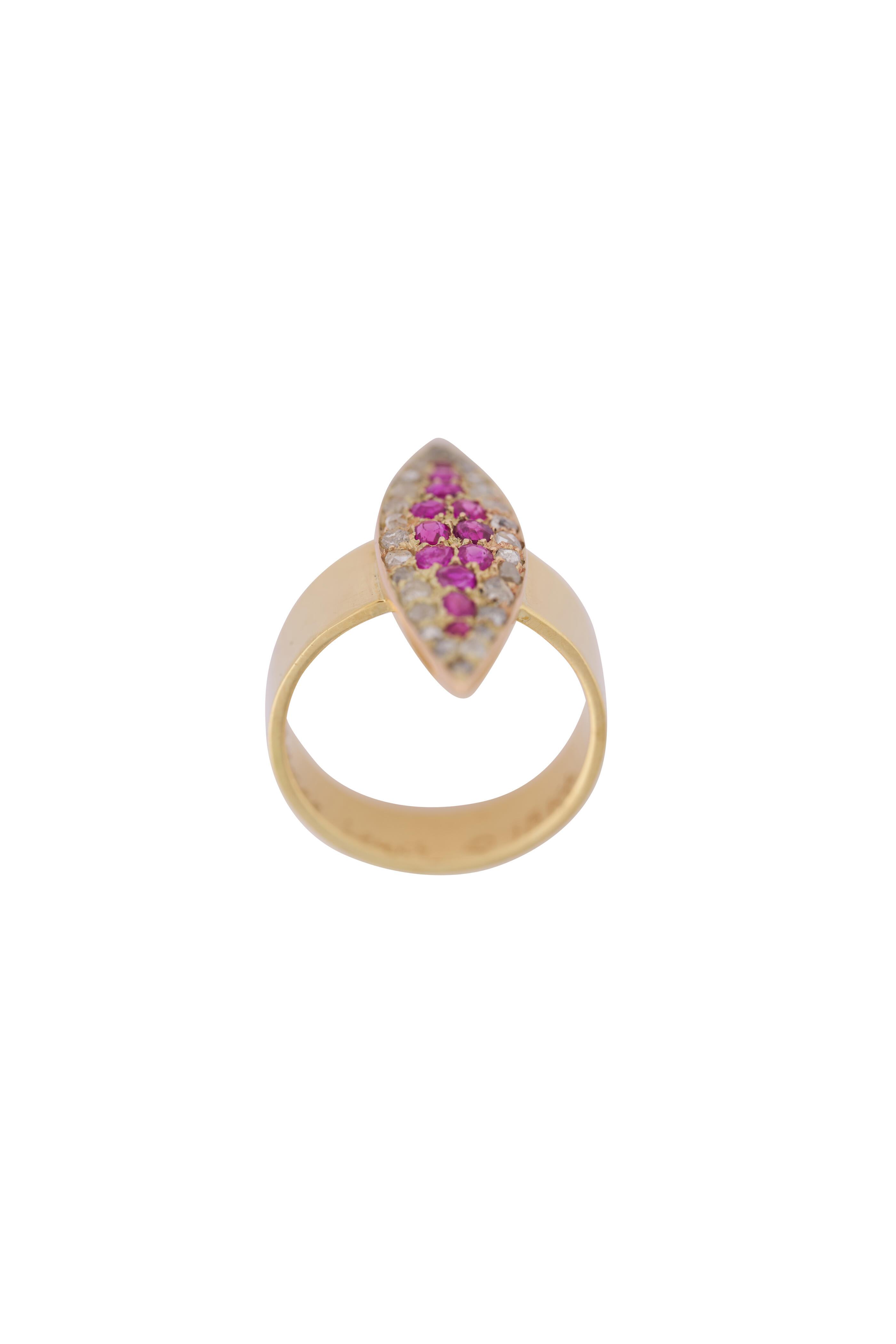 18k Yellow Gold. 18k White Gold. Diamond. Burmese Ruby Marquise.