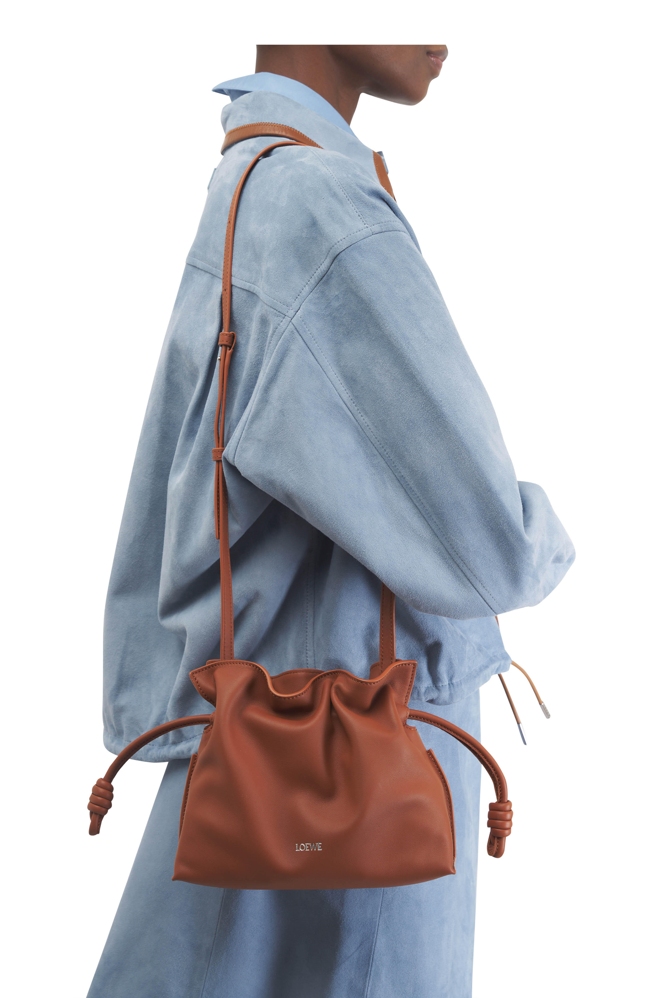 Leather. Detachable and adjustable strap. Top magnetic closure; knotted drawstring. One main compartment. Suede lining. Embossed logo detail. Made in Spain. Color: Squirrel. Height: 7.1". Width: 9.4". Depth: 3.5". Strap length: 37.8" - 47.2". Strap drop: 14.2" - 19.3".