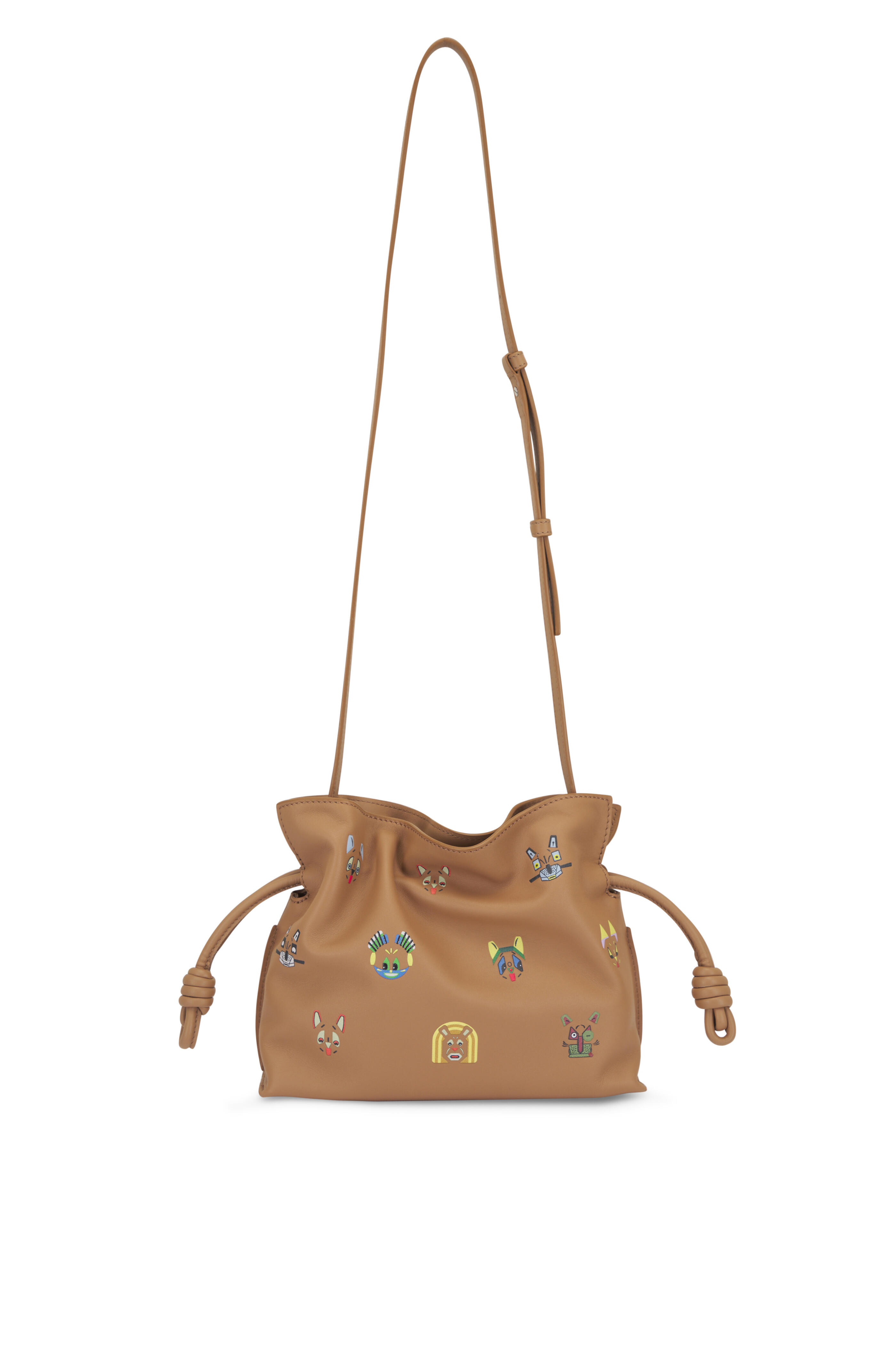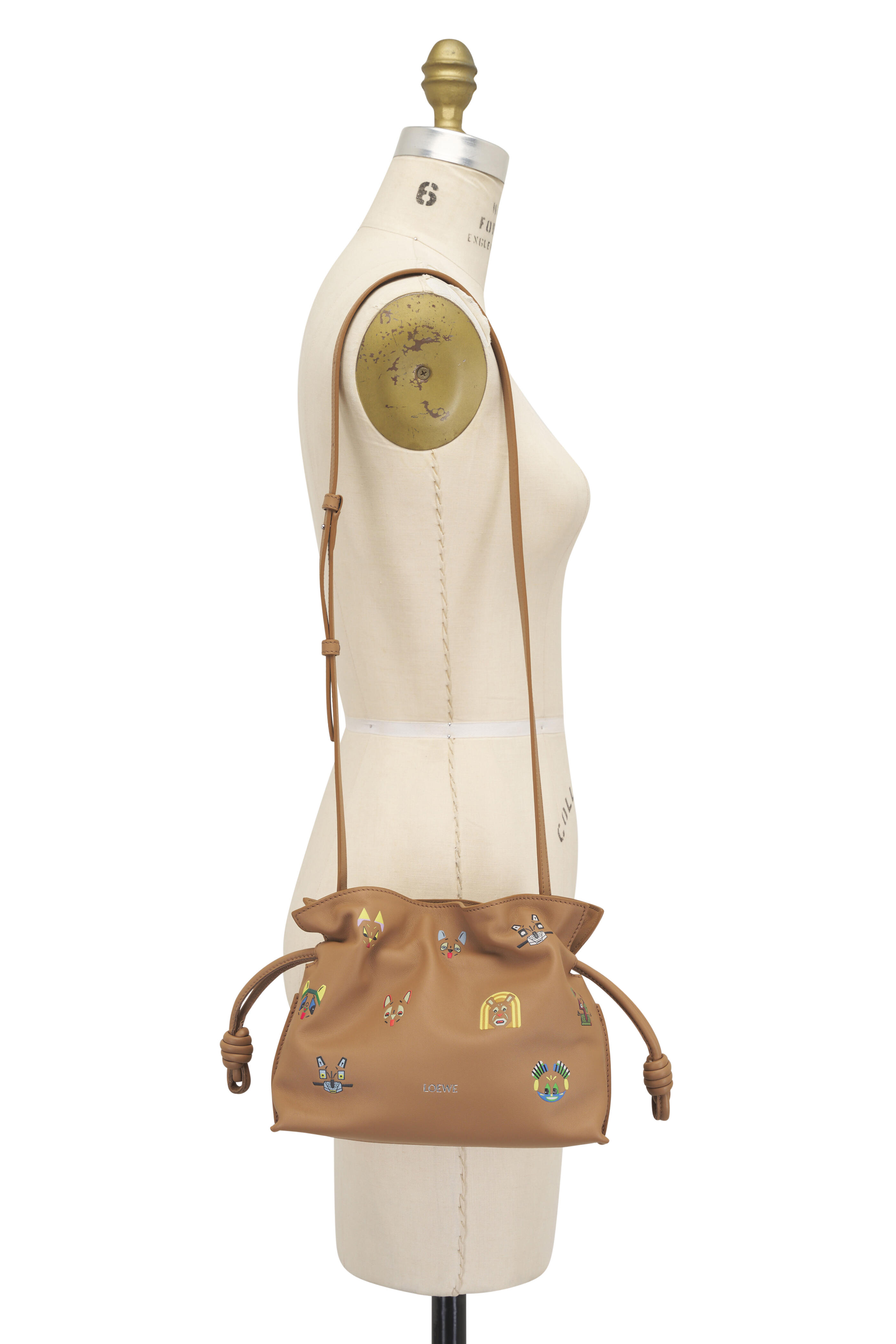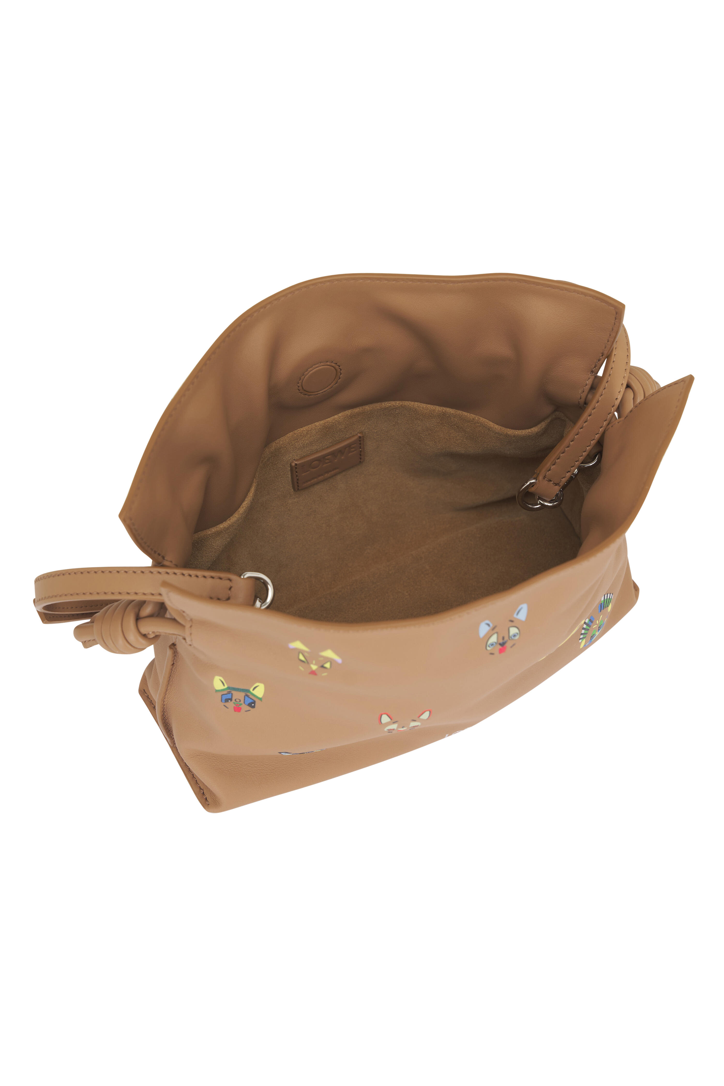 Nappa calfskin leather. Magnetic closure. Detachable and adjustable strap. Drawstring knots. Single compartment. Suede lining. Silver embossed logo. Palladium tone hardware. Allover 3D-effect cat prints. Made in Spain. Height: 7.1". Width: 9.4". Depth: 3.5". Strap drop: 14.2" - 19.3". Strap length: 37.8" - 47.2".