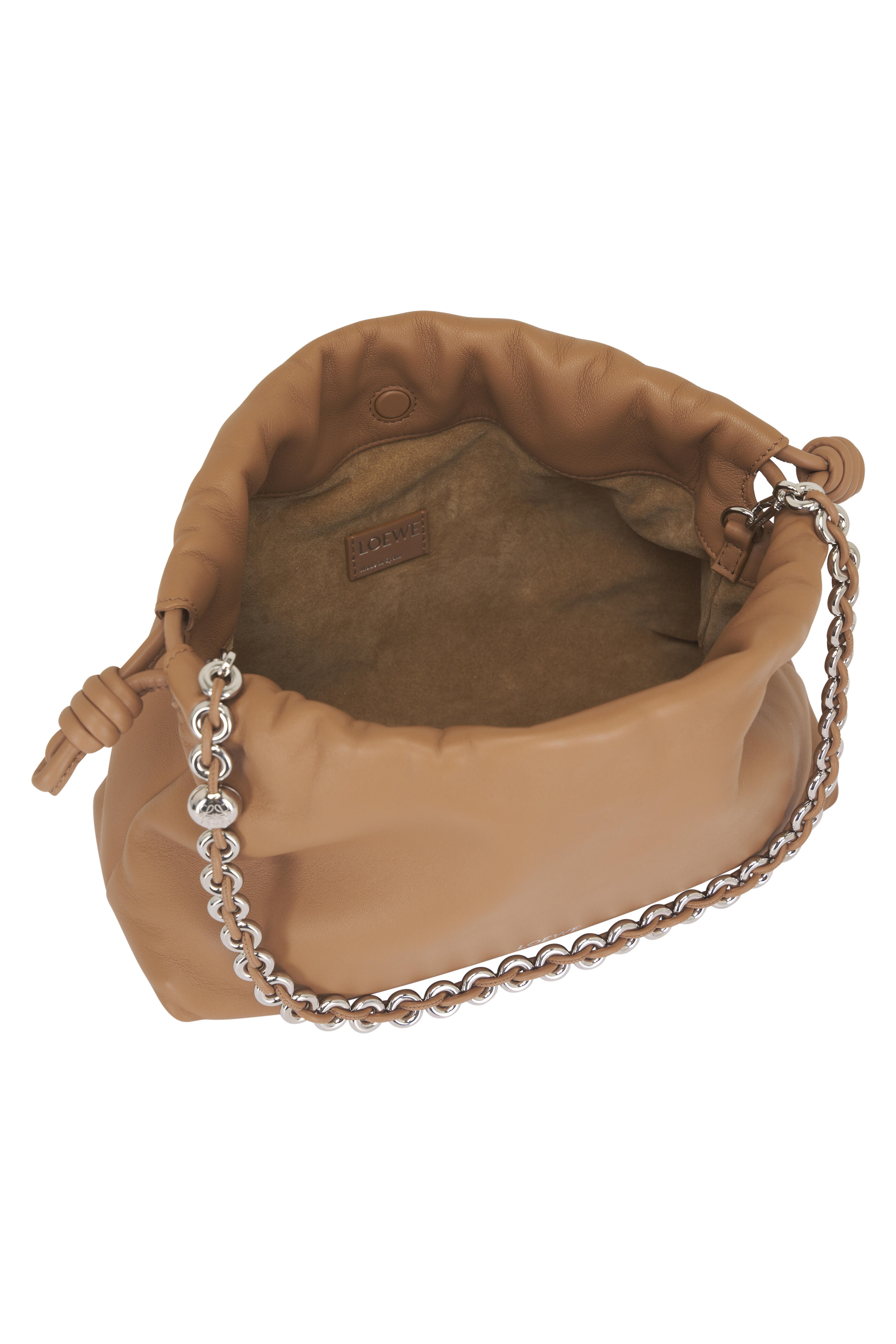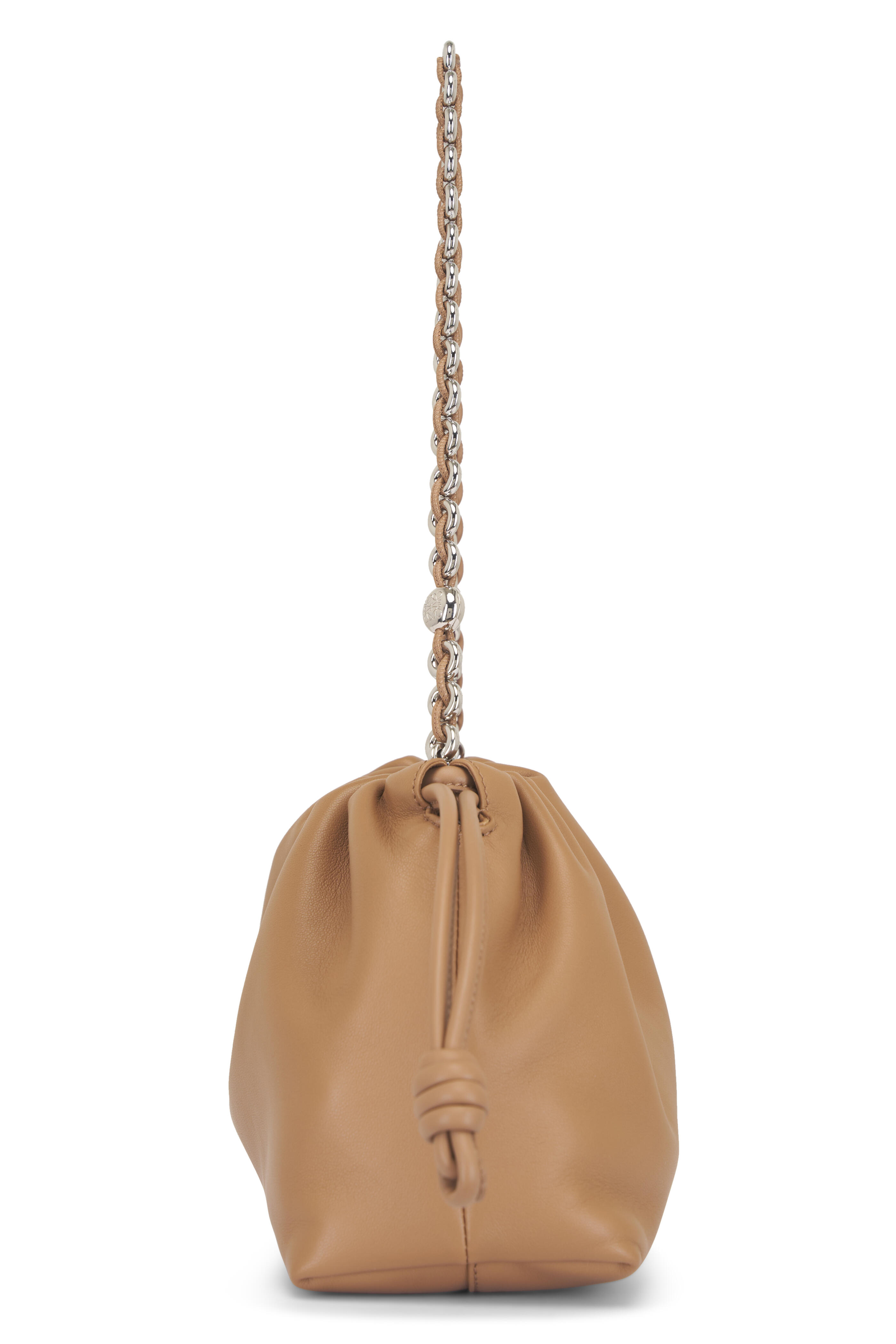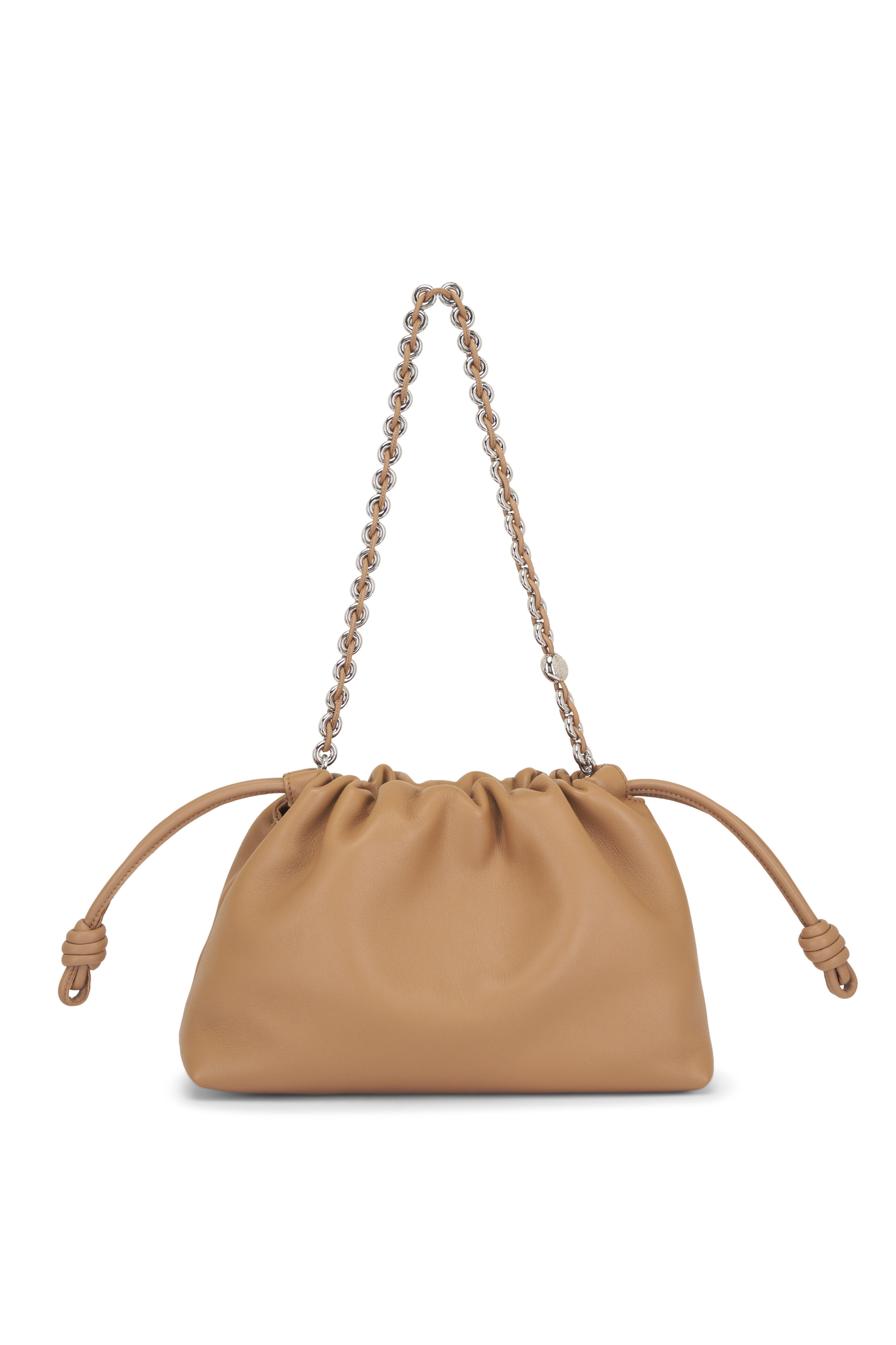 Nappa lambskin. Detachable and adjustable leather strap. Detachable donut chain adorned with an Anagram Pebble. Discreet magnetic closure. Single compartment. Suede lining. Silver embossed logo. Made in Spain. Strap length : 59 / 82 -142 cm. Strap drop : 27 / 37 - 67 cm. Height: 20 cm. Width: 30 cm. Depth: 10.5 cm.