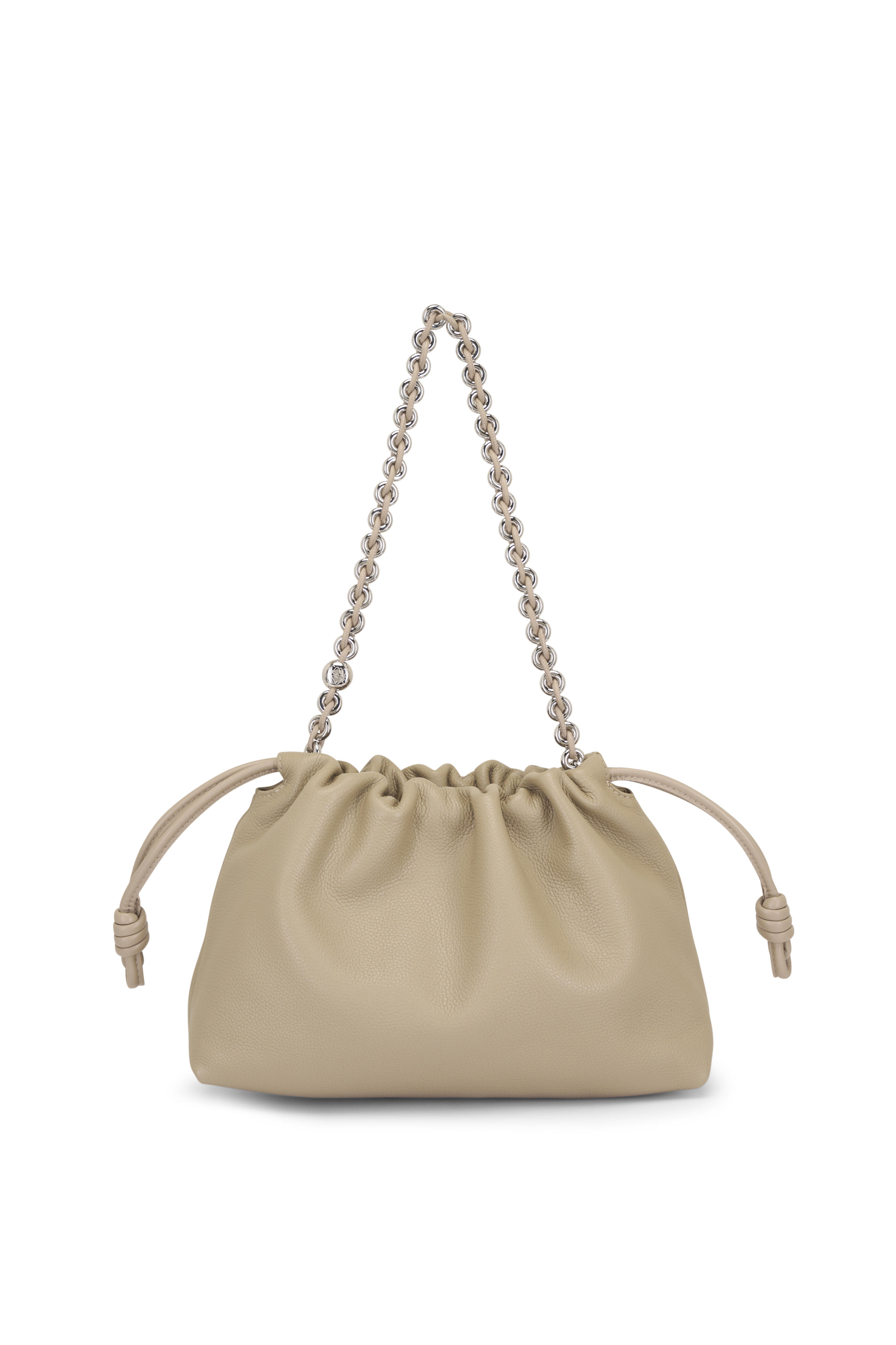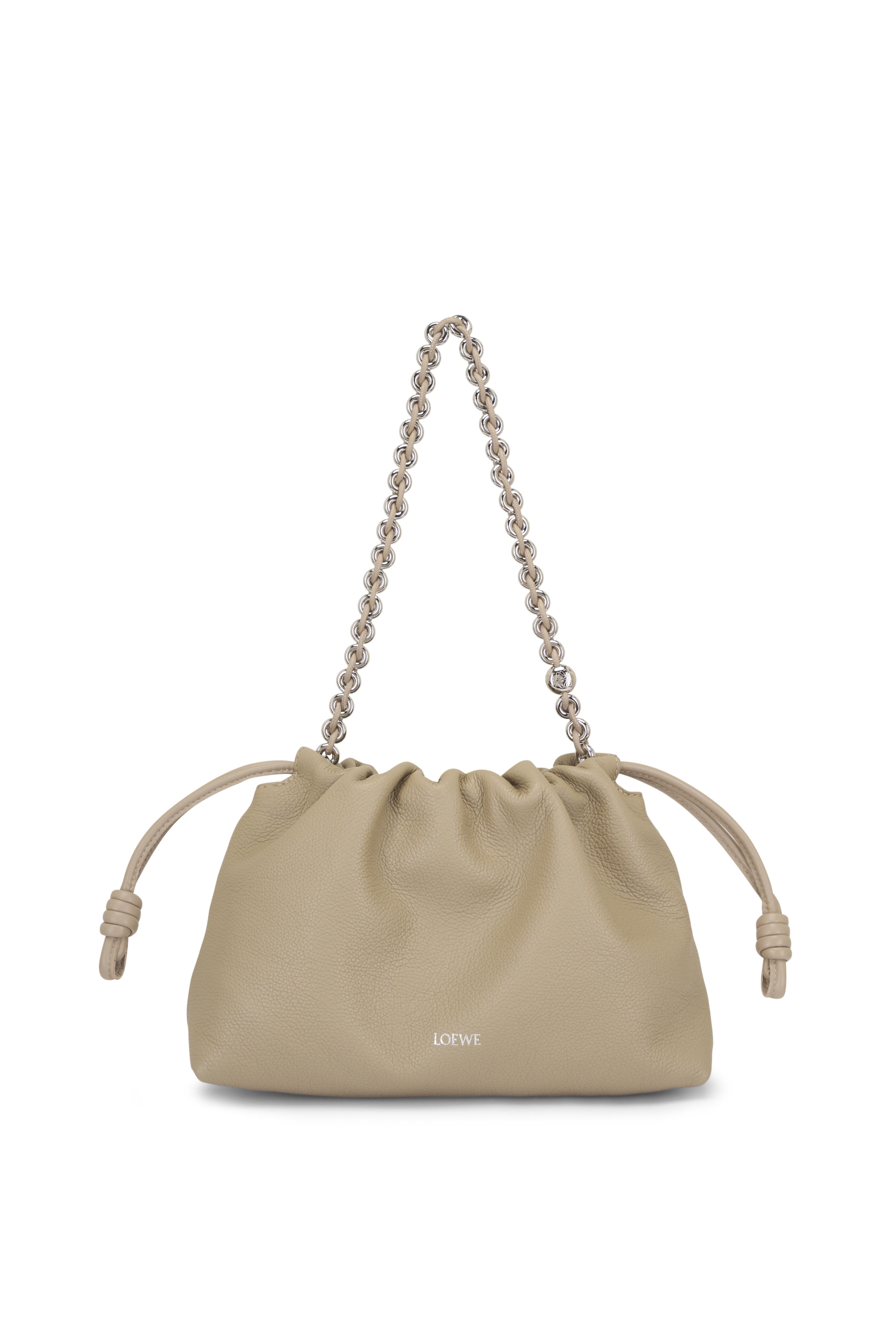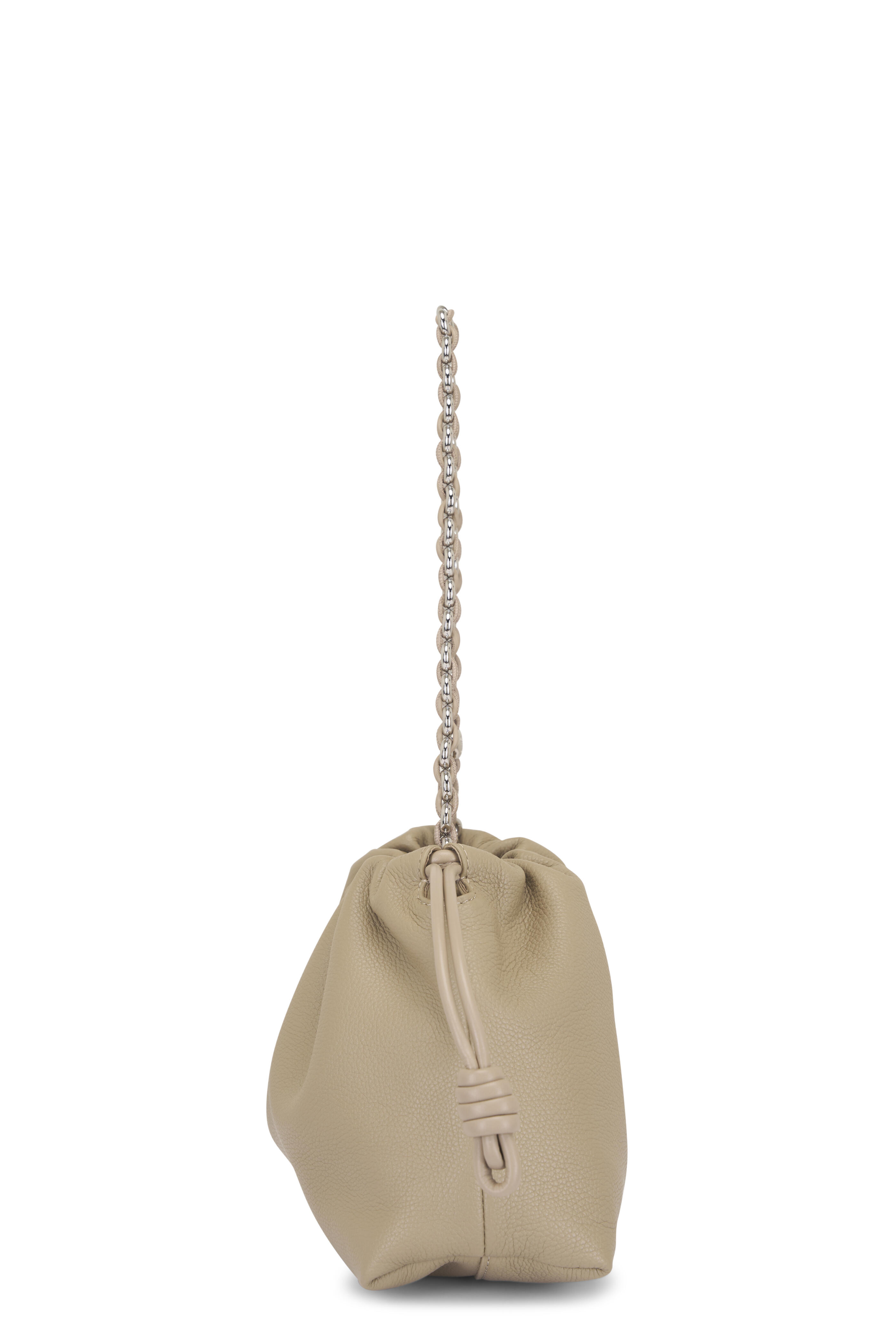 Fine grain calfskin leather. Magnetic closure. Detachable donut chain with anagram pebble. Detachable and adjustable leather strap. Knot drawstrings. Suede lining. Silver embossed logo. Palladium-tone hardware. Made in Spain. Height: 7.9". Width: 11.8". Depth: 4.1". Strap length: 23.2"/ 32.3" - 55.9". Strap drop: 10.6"/ 14.6" - 26.4".