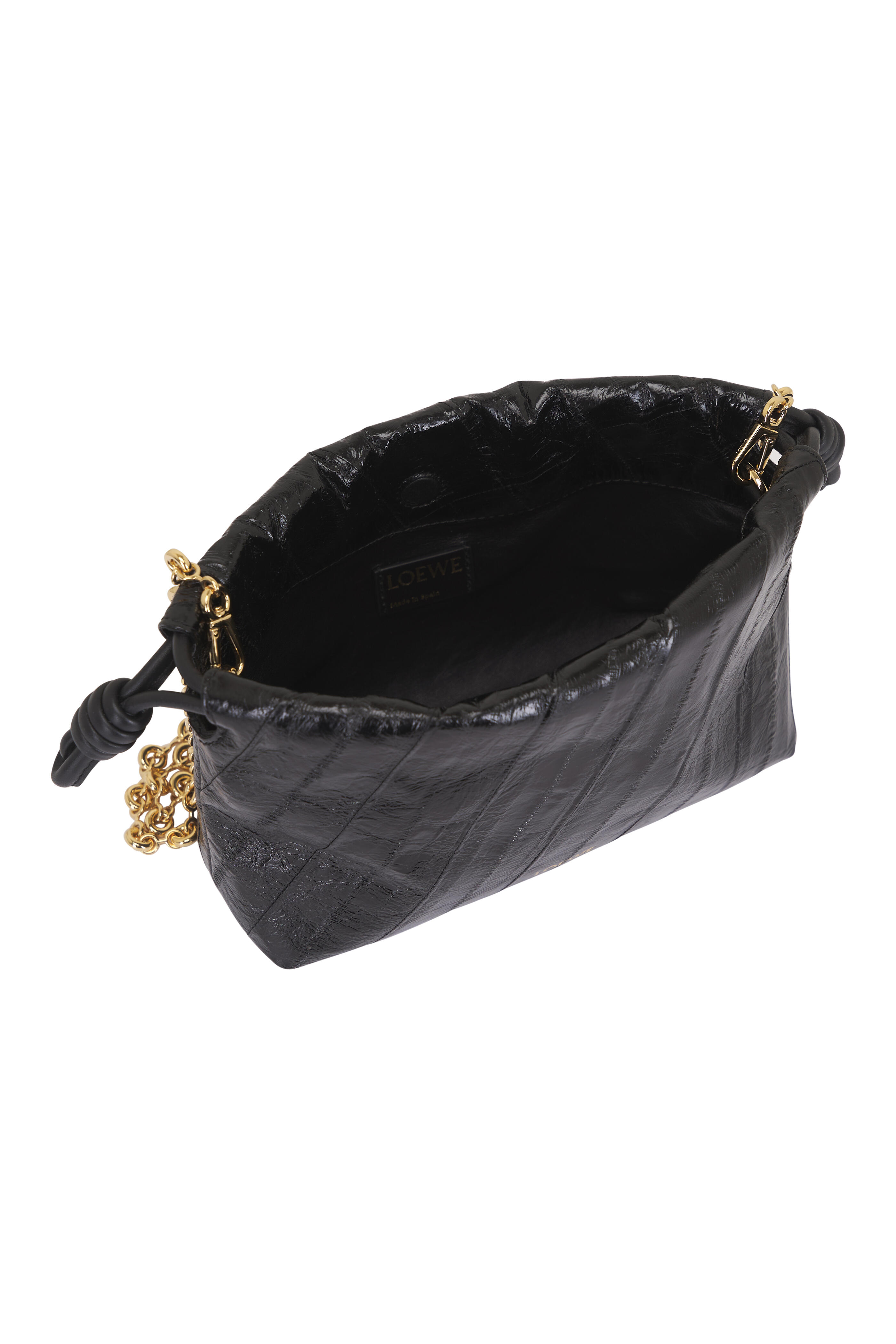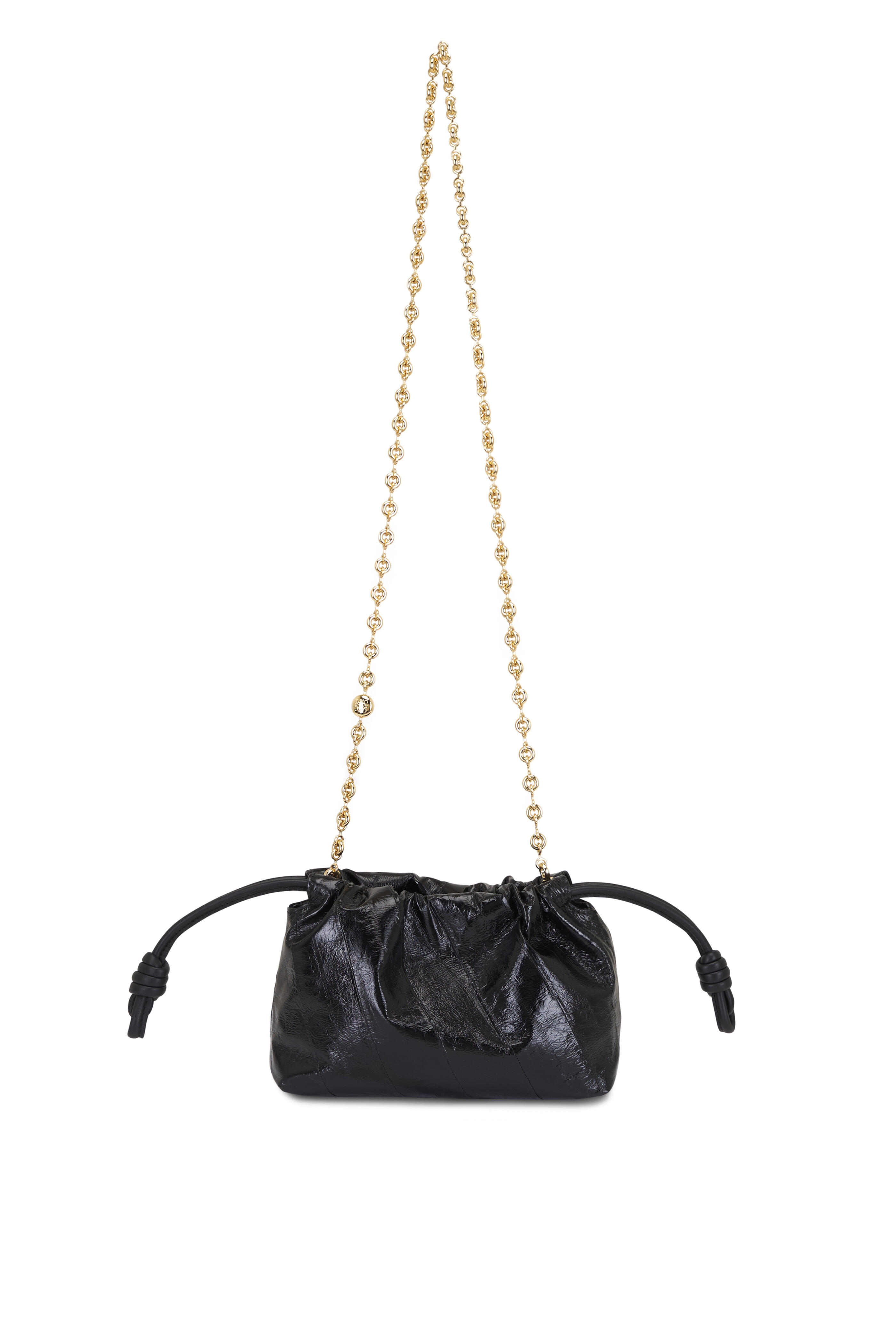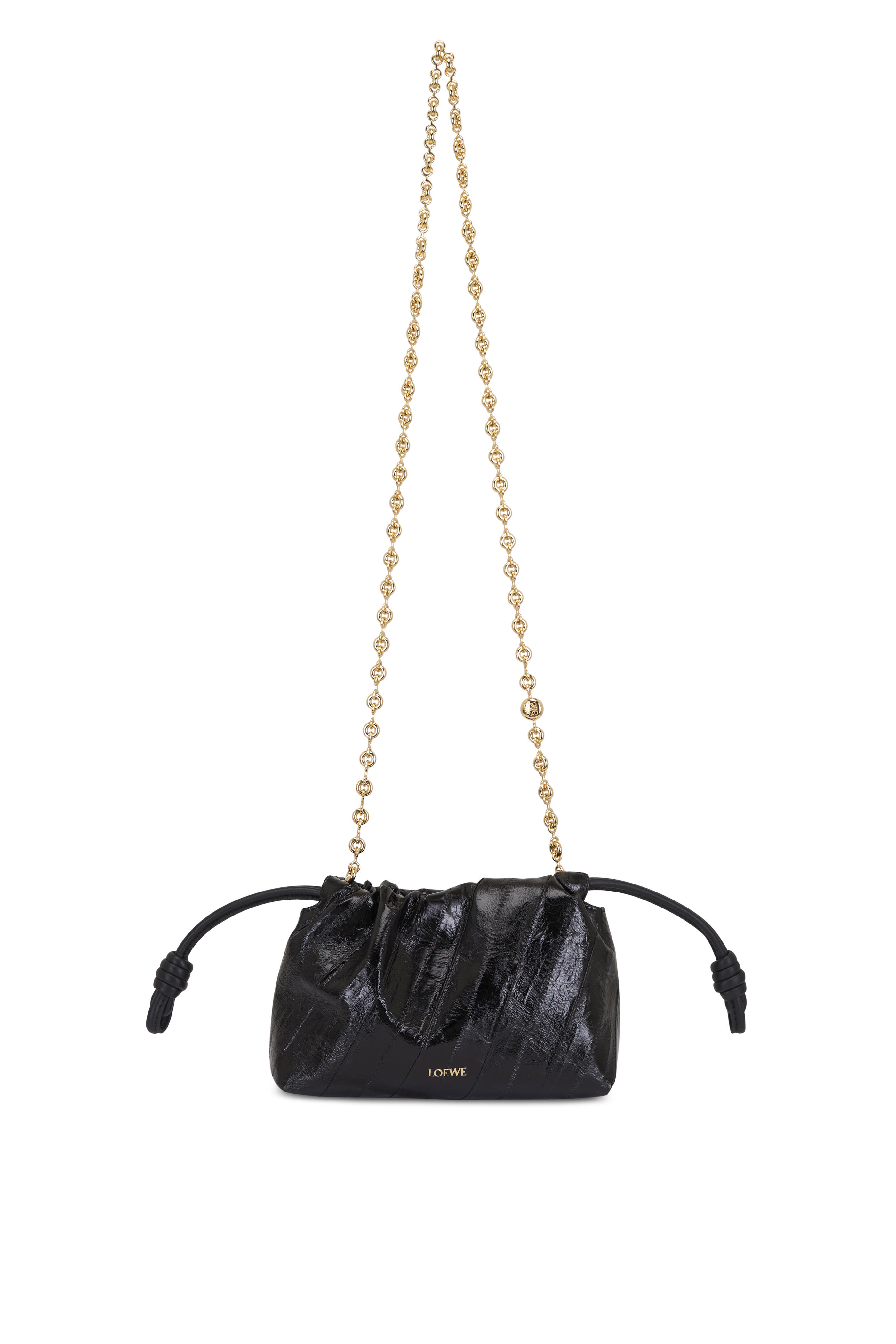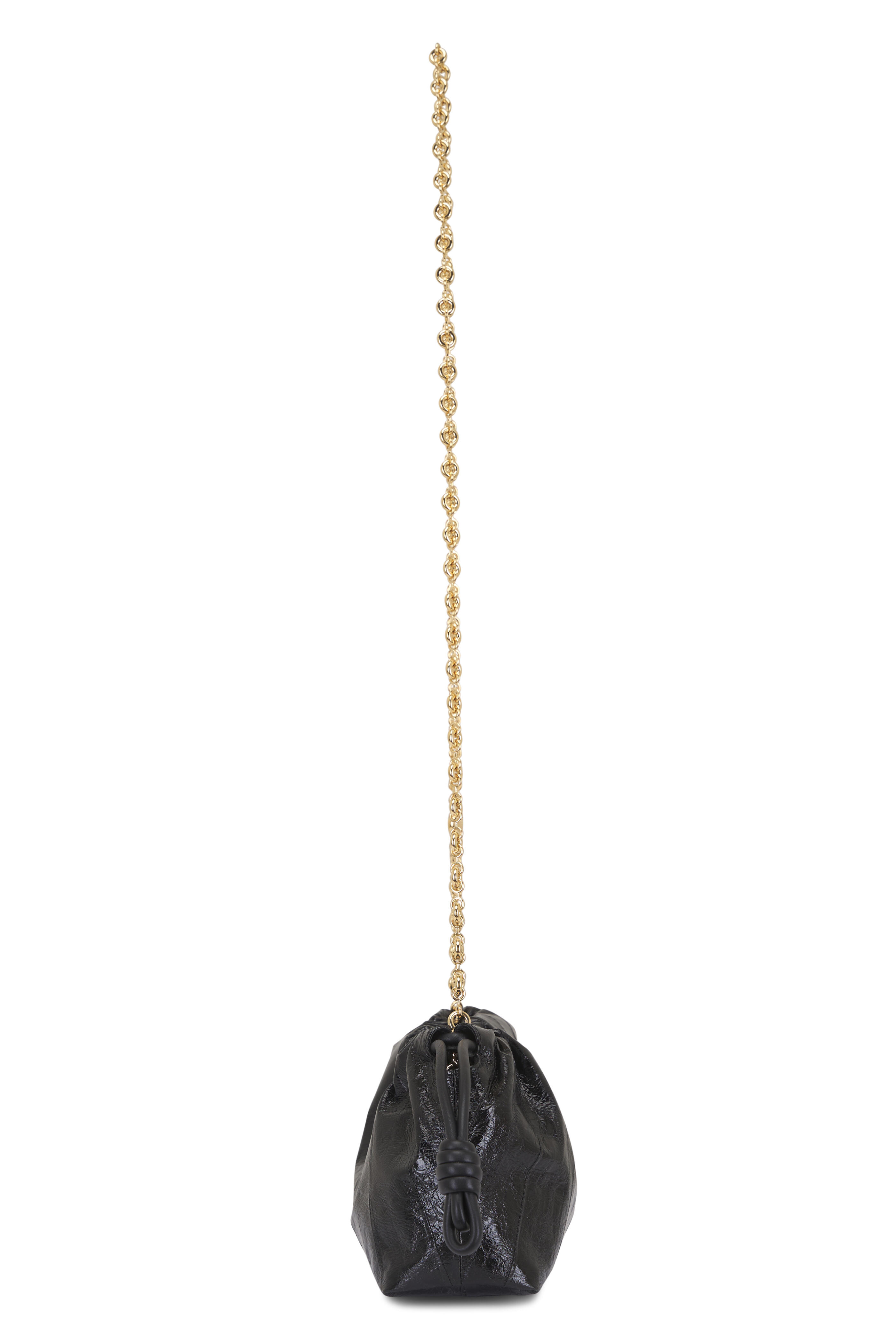 Hagfish. Detachable sliding donut chain with anagram Pebble. Magnetic closure; knot drawstrings. Nappa lambskin lining. Gold embossed logo. Made in Spain. Height: 5.5". Width: 8.3". Depth: 3.1". Strap length: 44.1". Strap drop: 20.5".