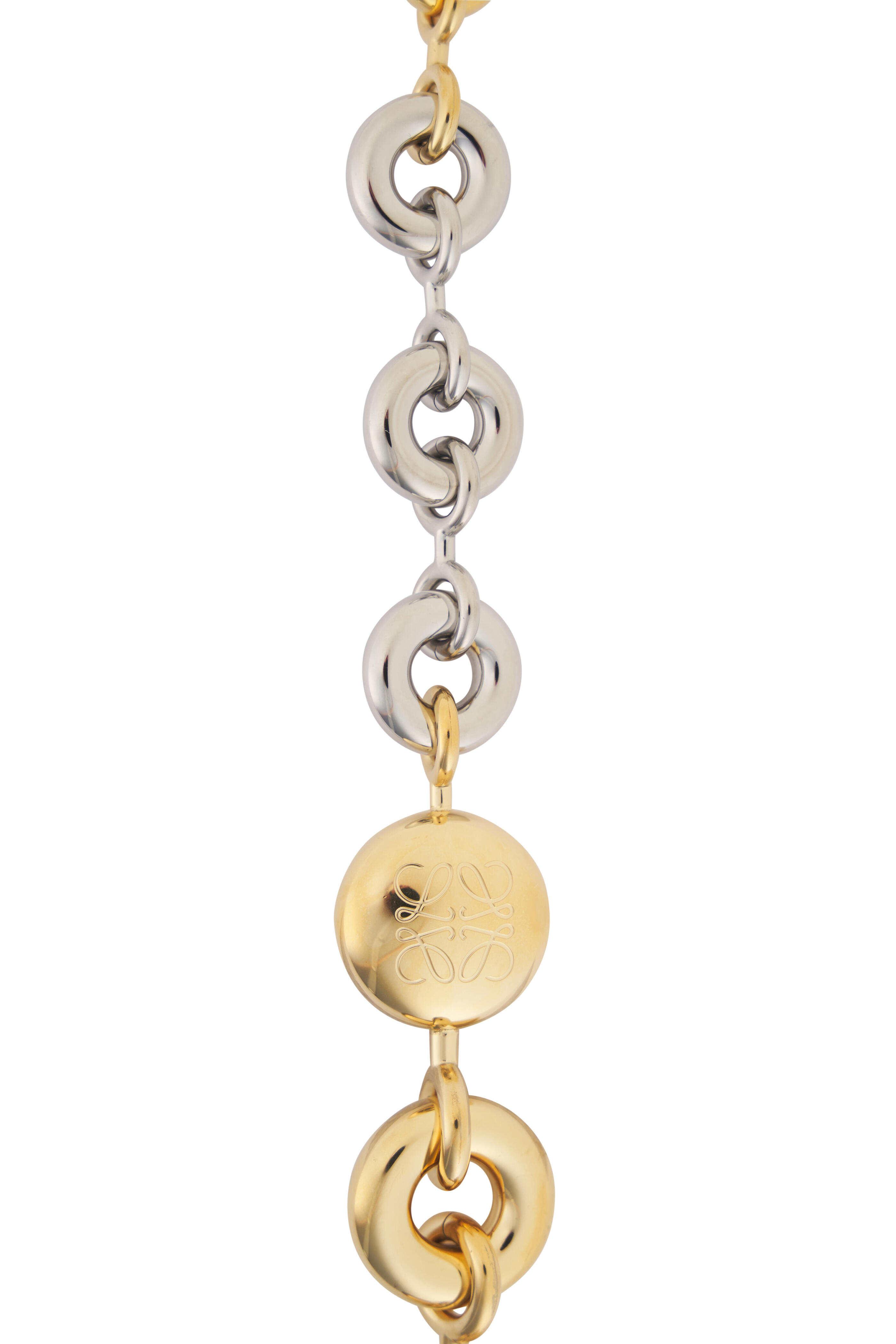 Detachable donut chain strap. Hook fastening. Anagram pebble. Engraved logo. Imported. Width: 17.7". Depth: 1.1".