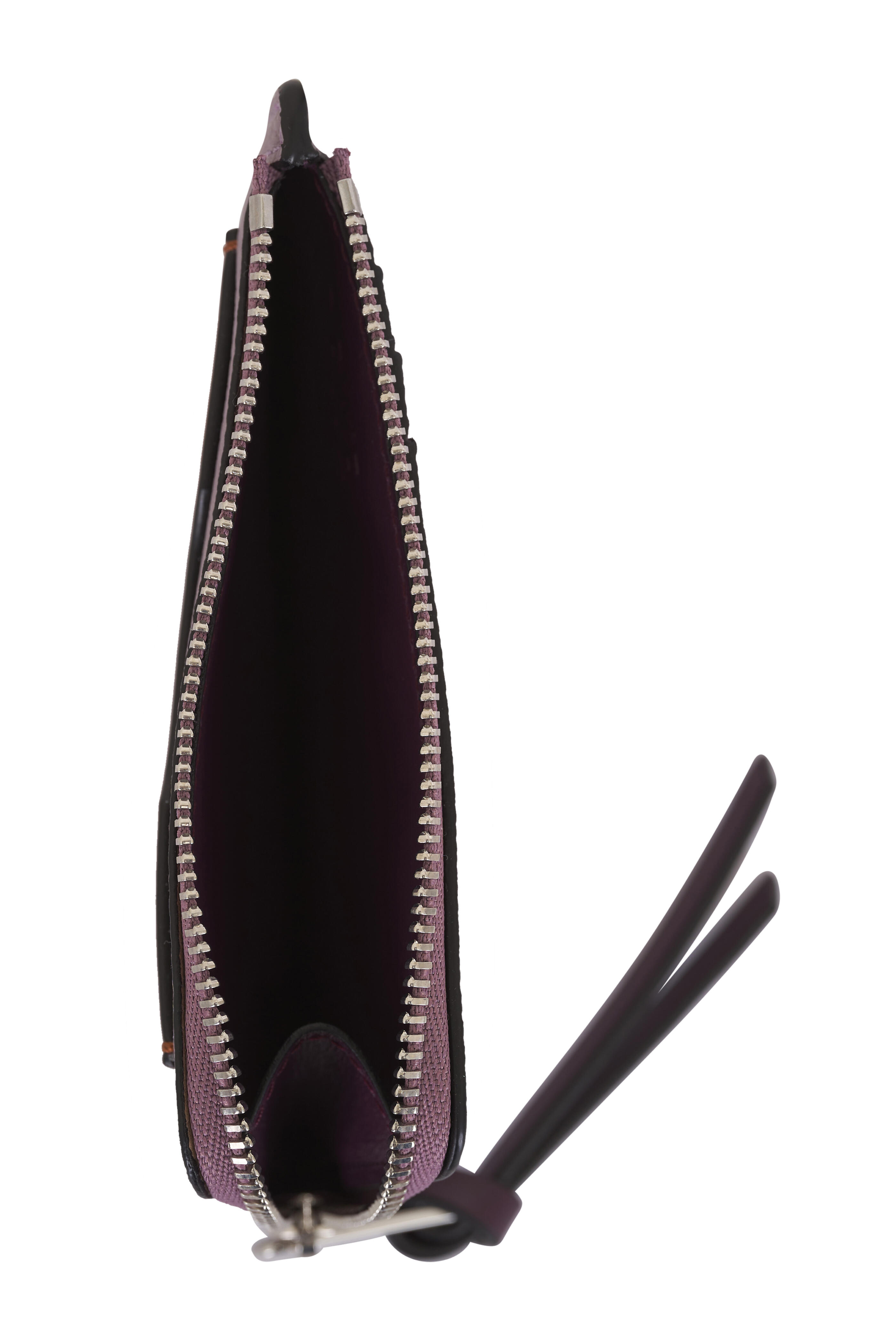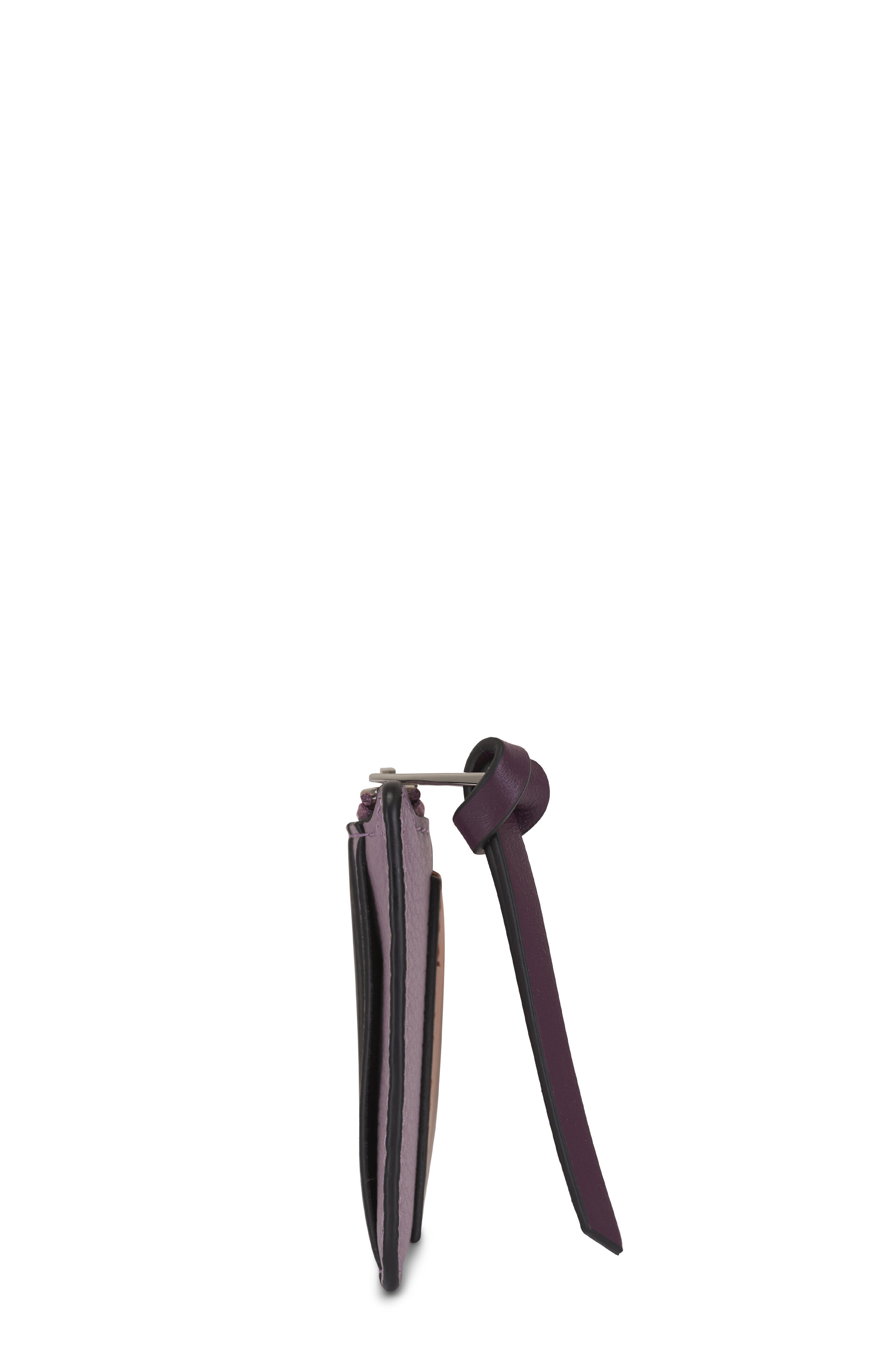 Calfskin leather. Zip closure with single compartment. Four card slots; one card pocket on front. Embossed Anagram detail. Made in Spain. Color: Dirty Mauve & Squirrel. Height: 3". Width: 5.1". Depth: 0.4".