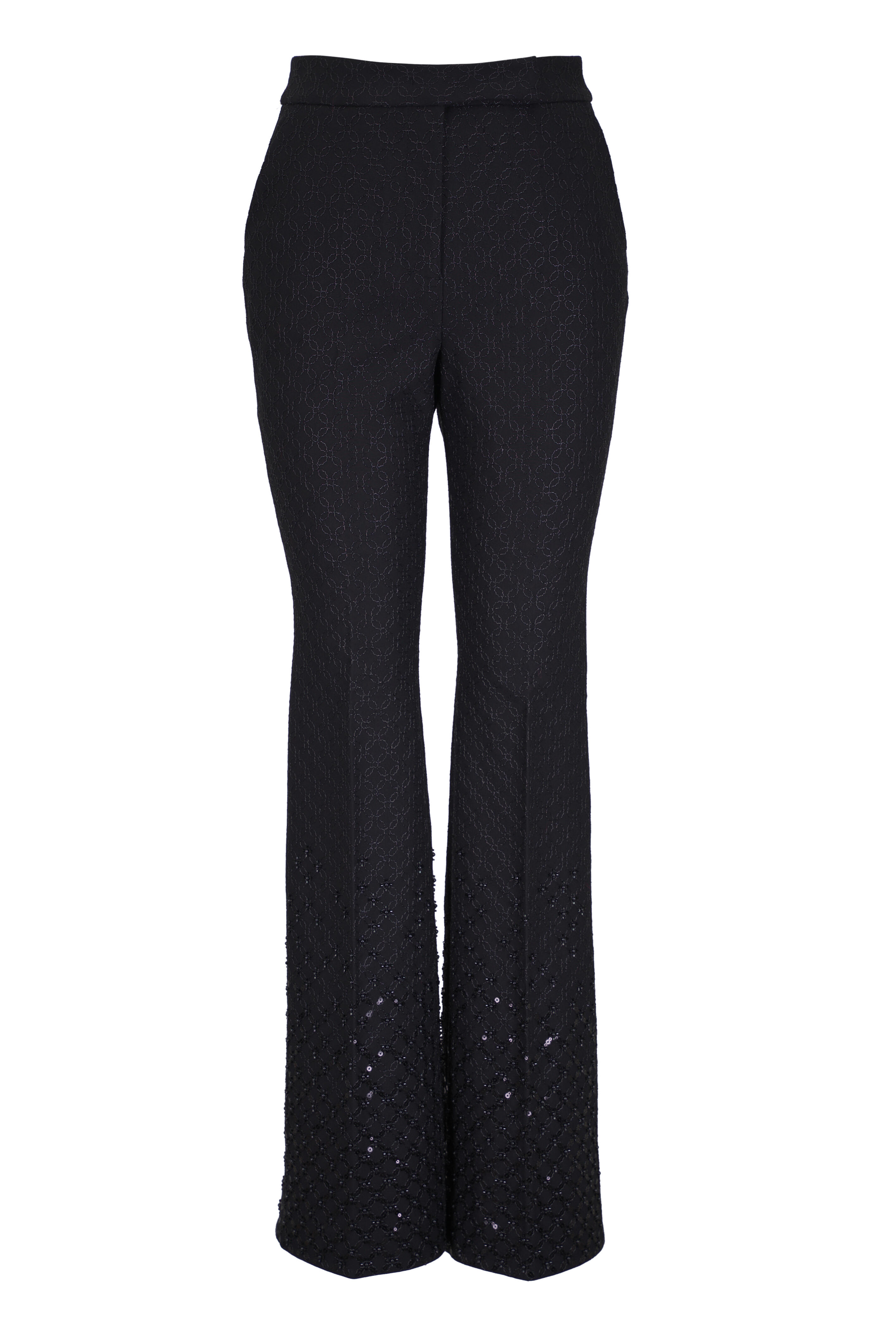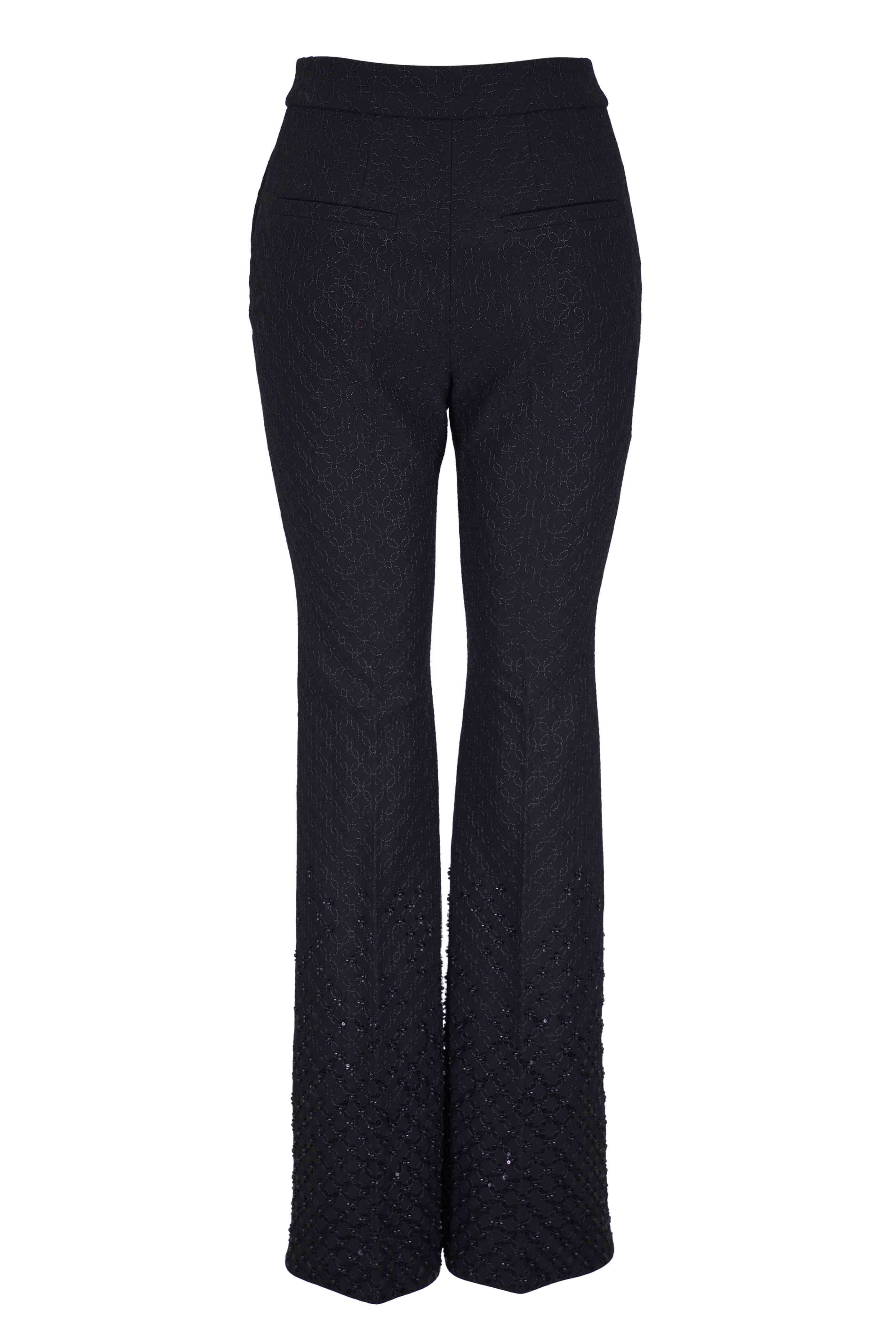 Zip fly; hook-and-eye closure. Side slip pockets; back welt pockets. Fully embellished. Pleated. Flared hem. Imported. 34" Inseam (size xs). 67% viscose, 28% polyamide, 5% elastane. Dry clean.