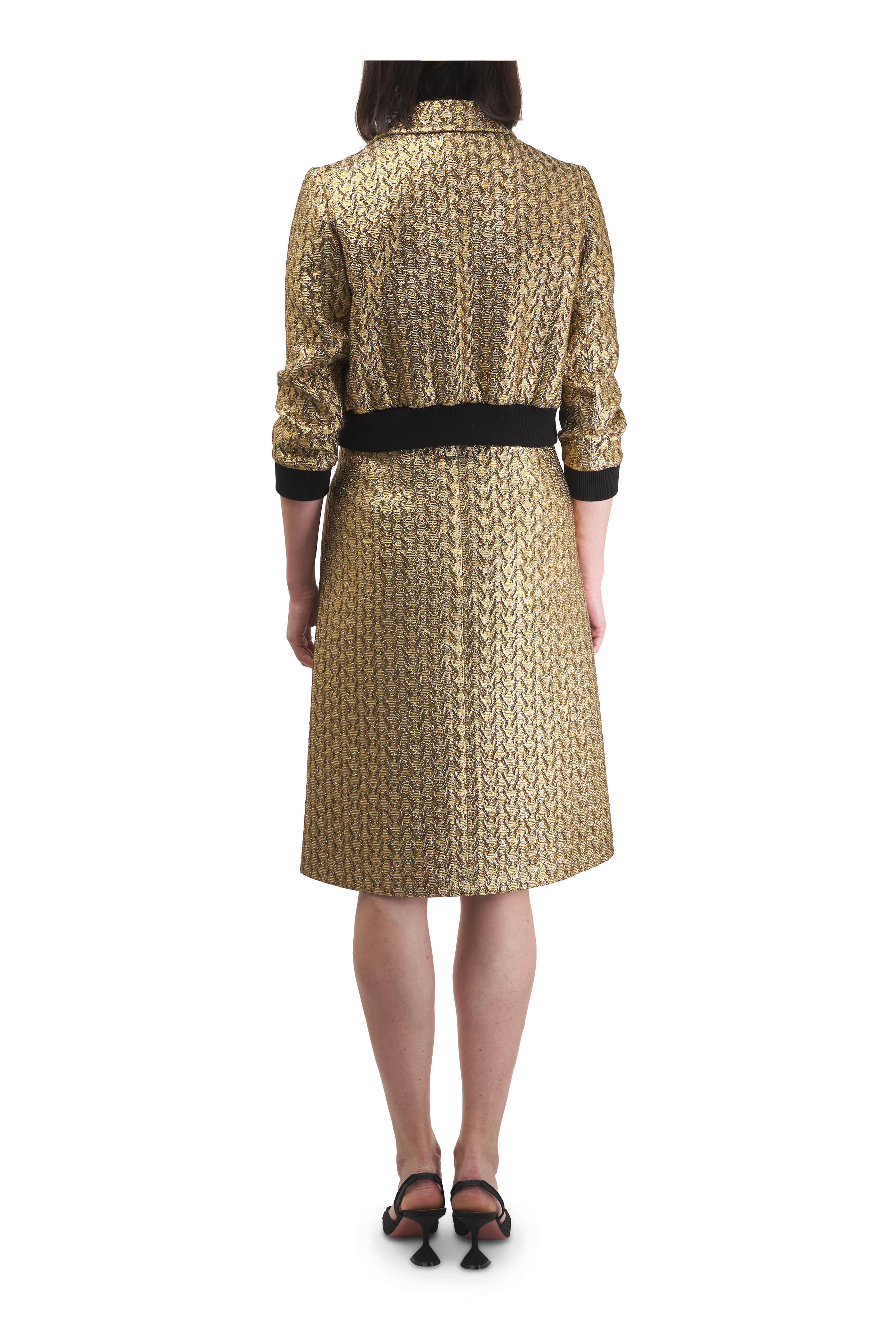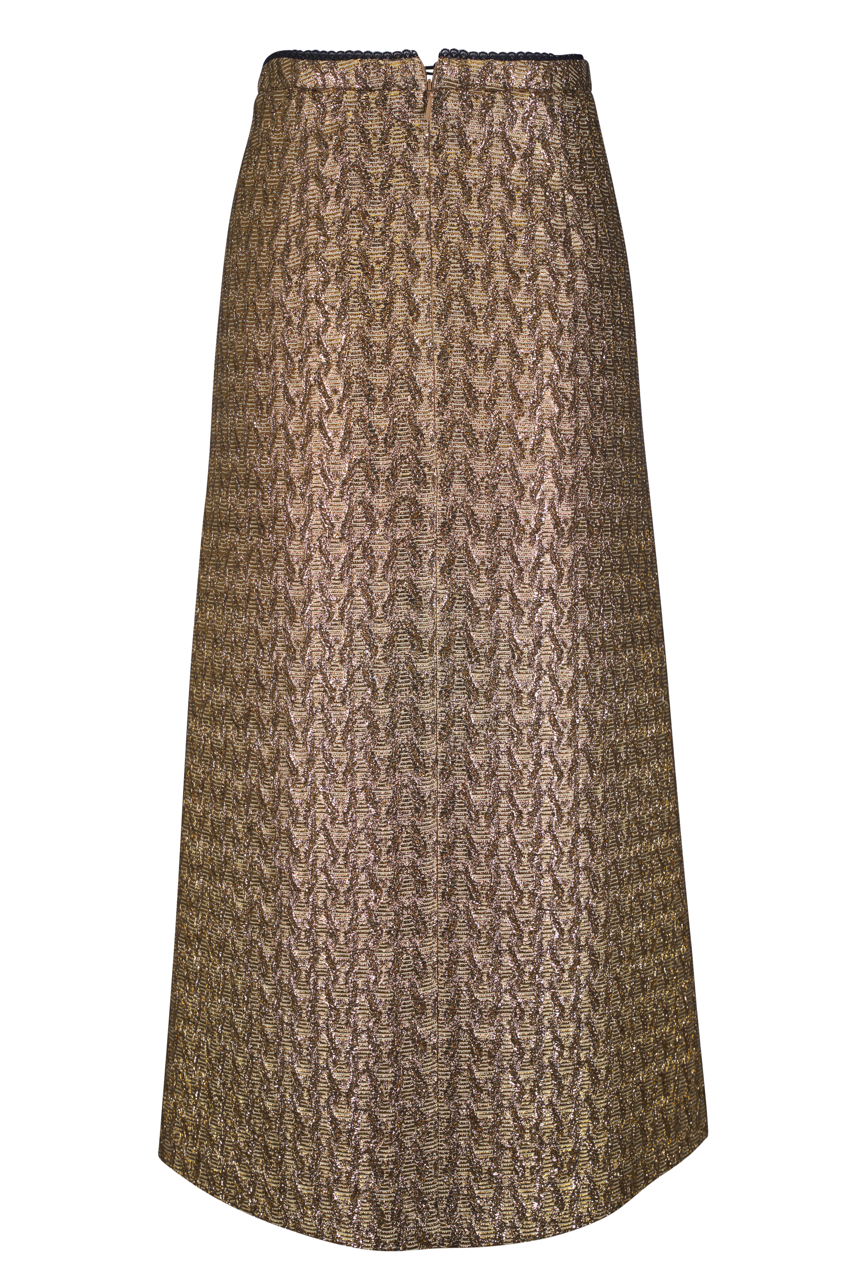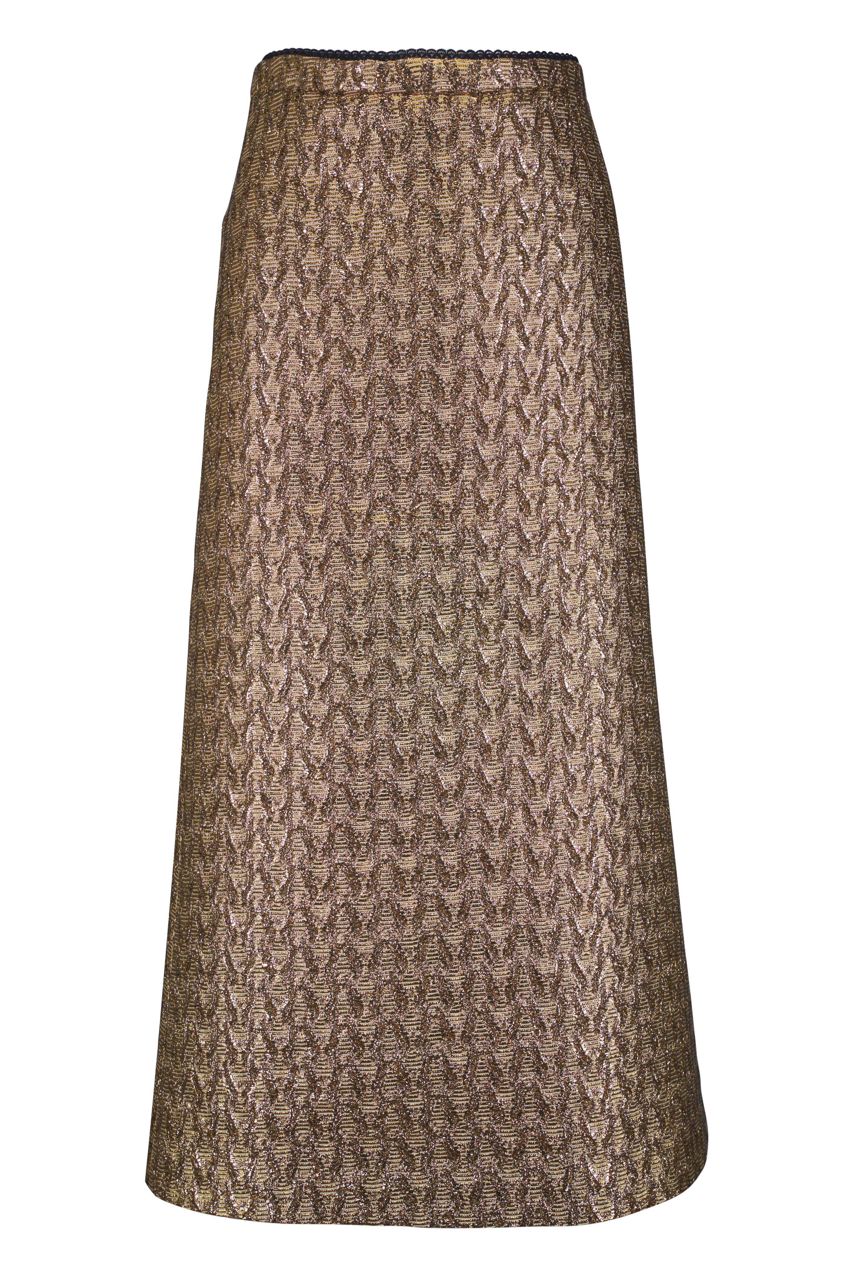 In-seam side zip. Imported. 25" length (size S). 38% cotton, 35% metallised polyester, 10% silk, 10% polyamide. Dry clean.