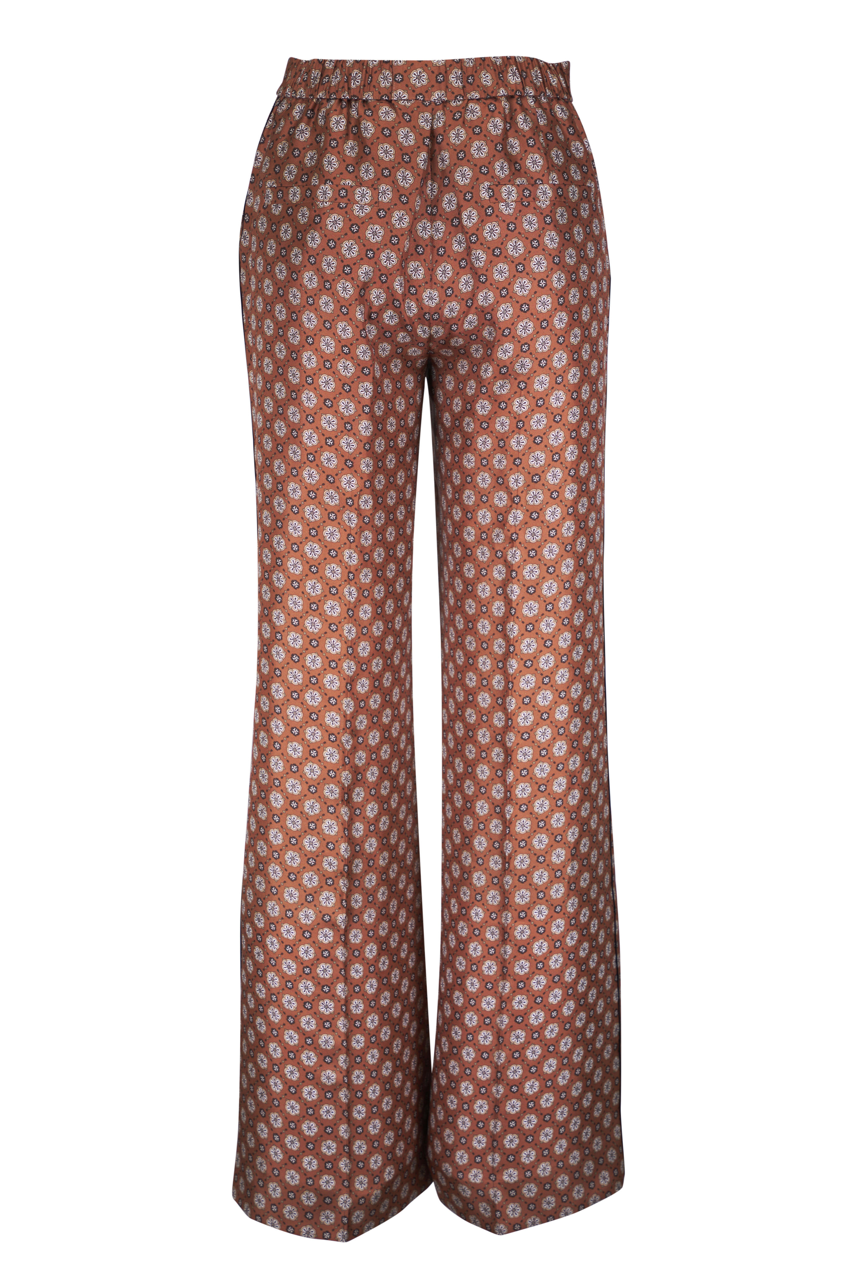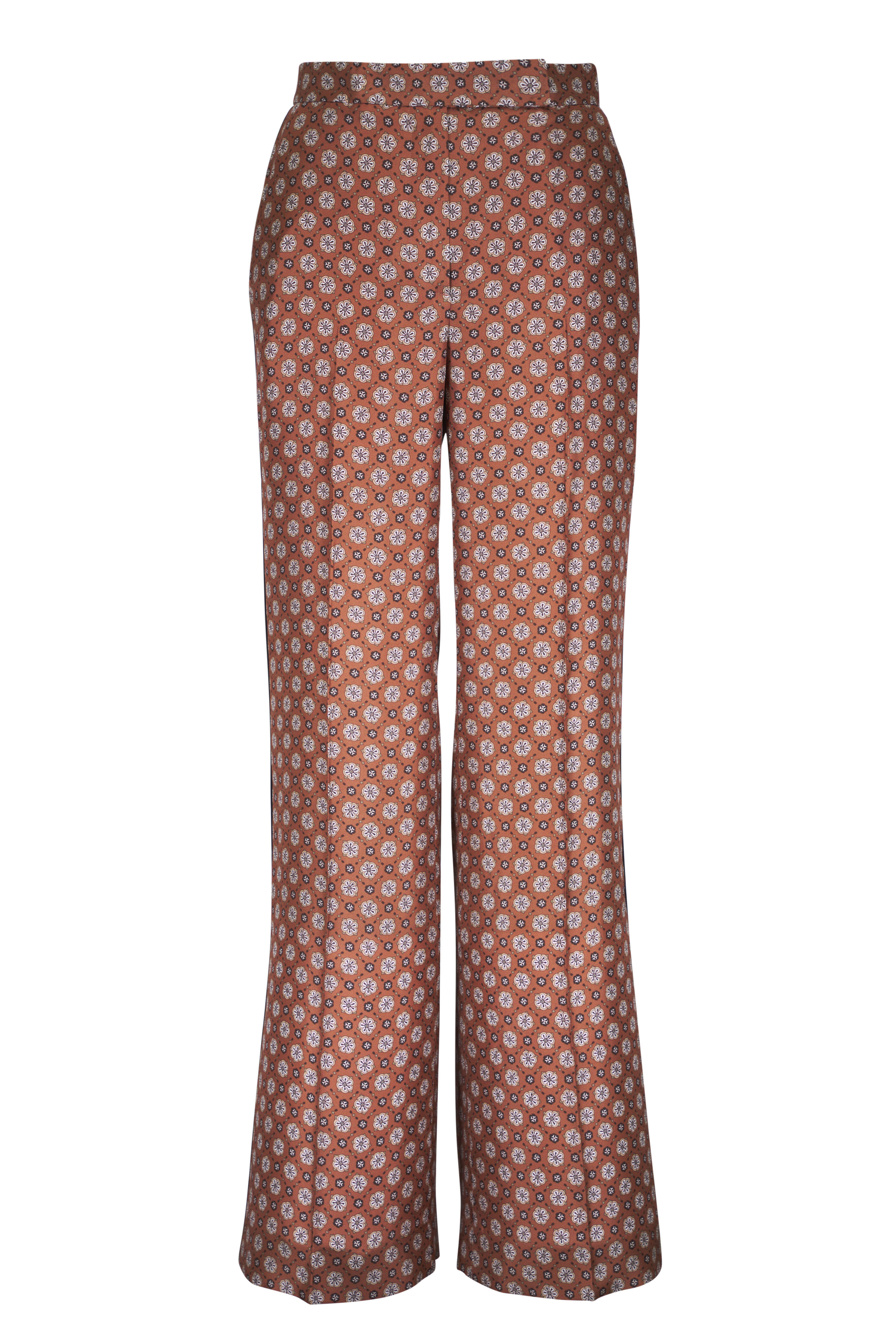 Banded waist; hook & eye closure. Zip fly. Side slip pockets; back besom. Contrasting side piping. Imported. 33" inseam. 100% silk. Dry clean.