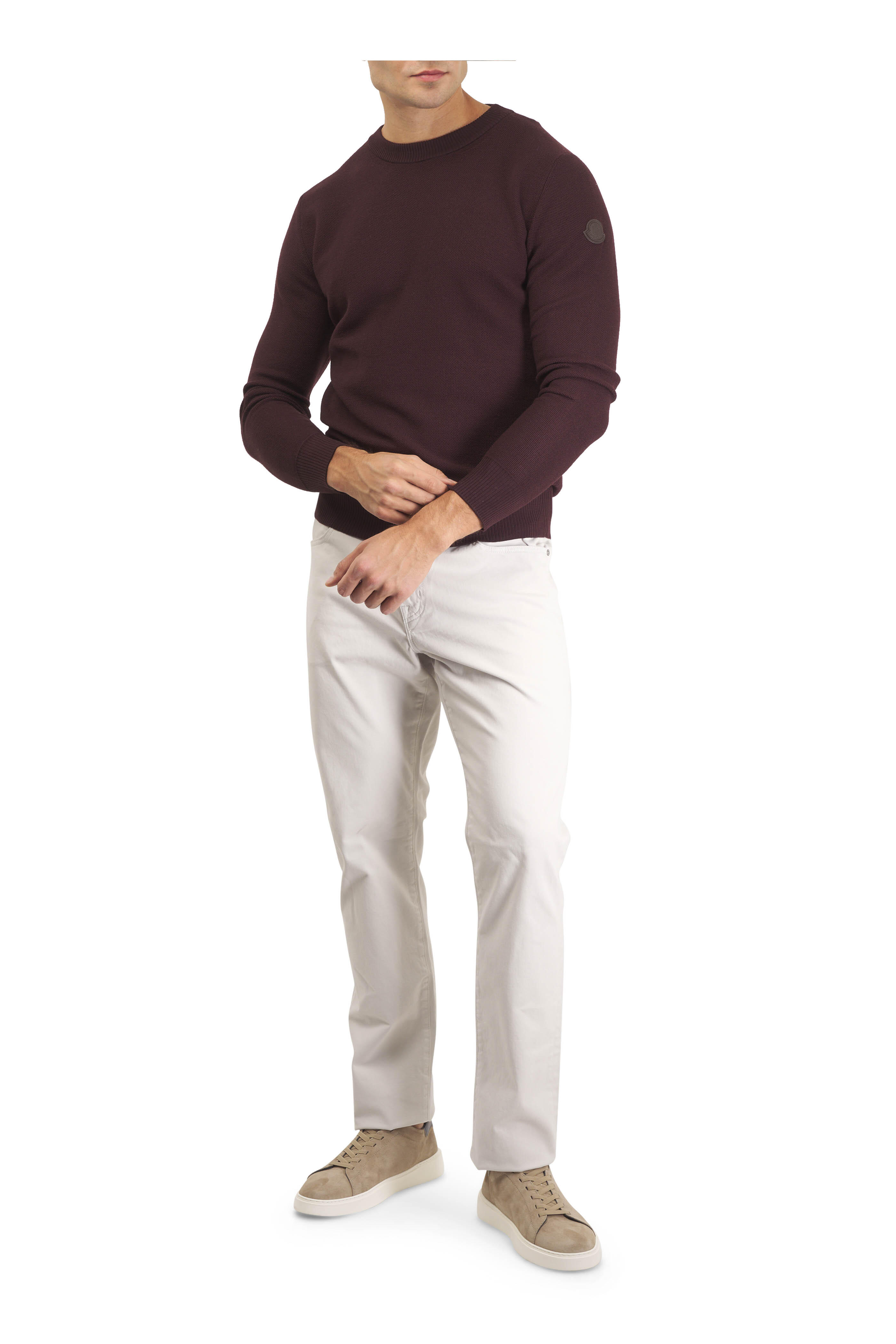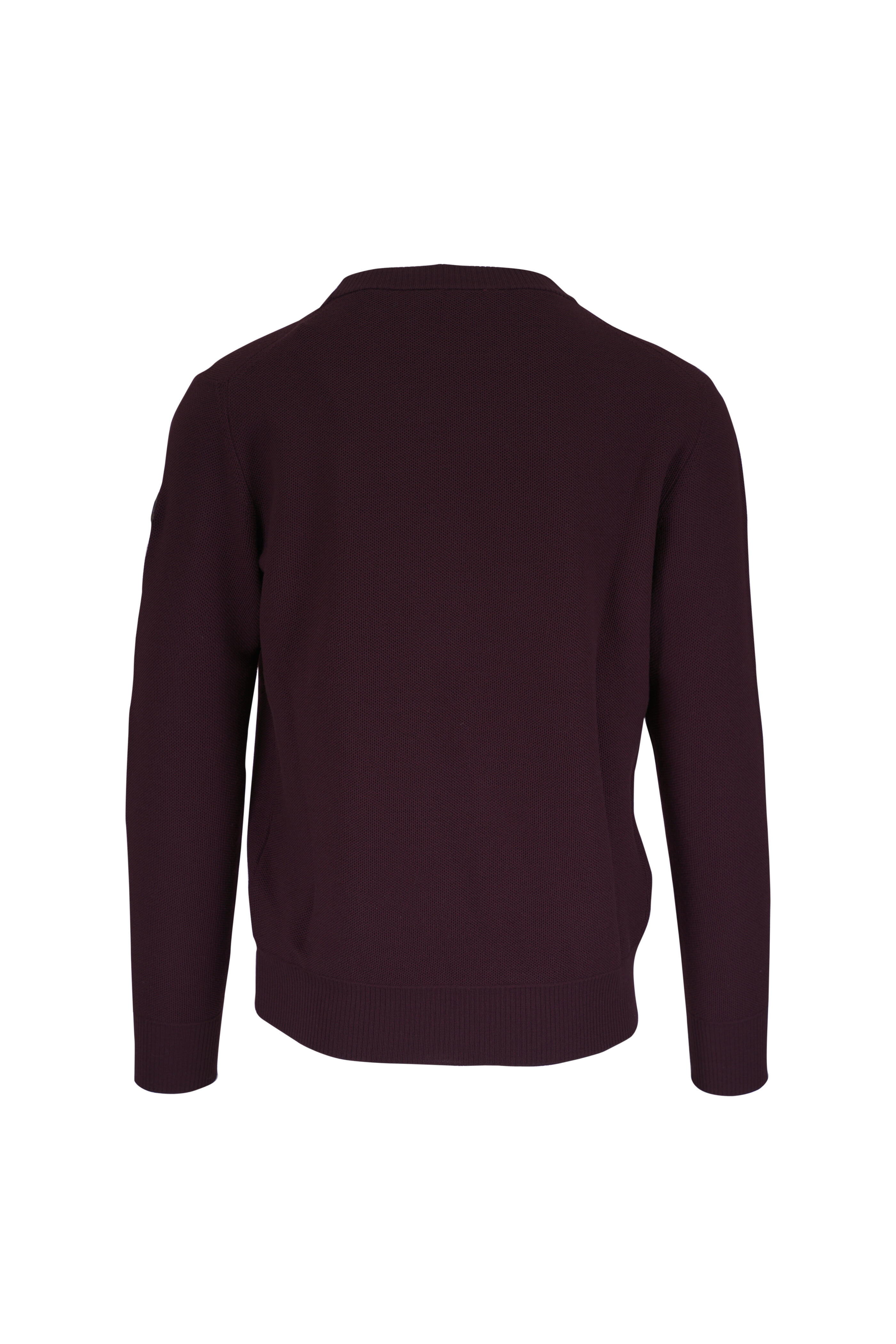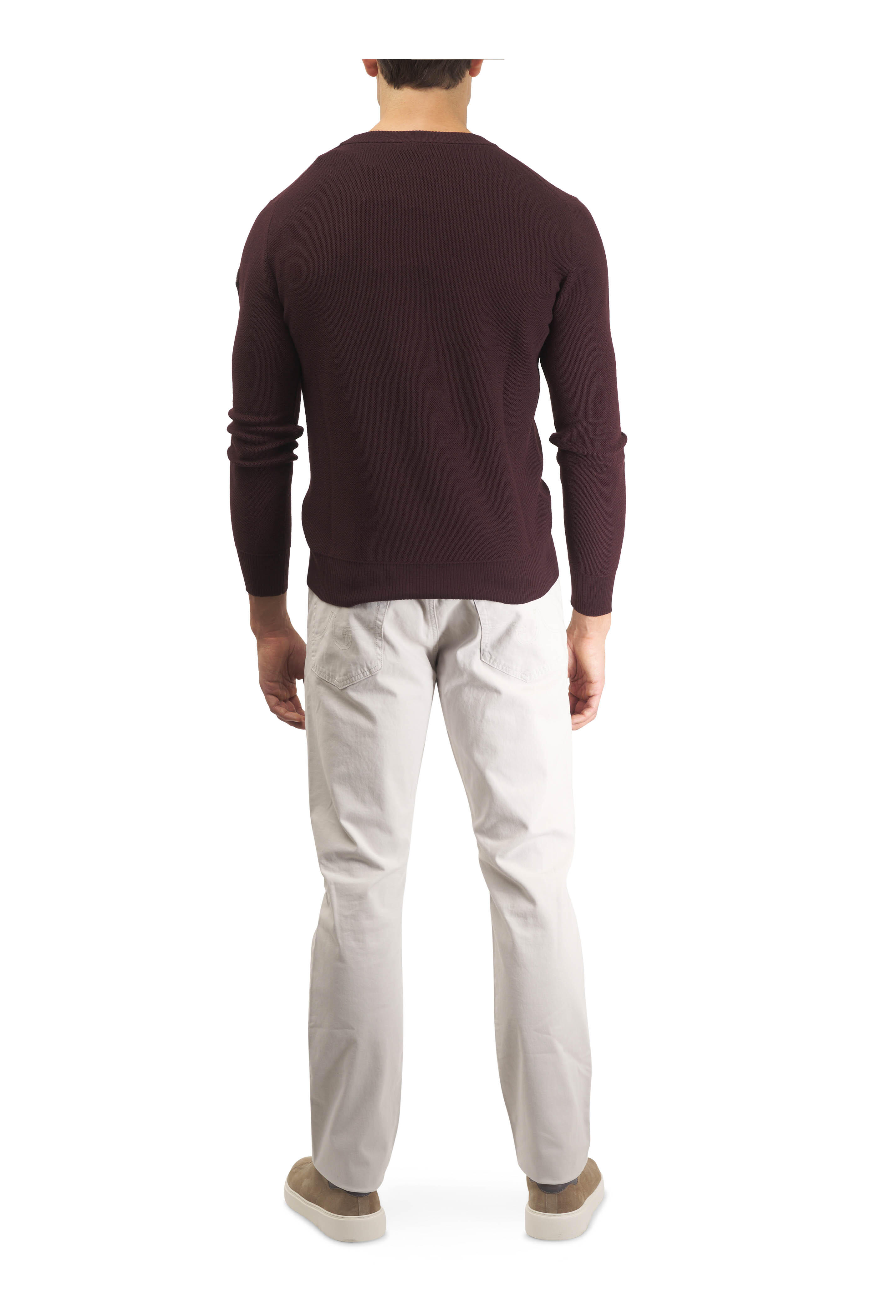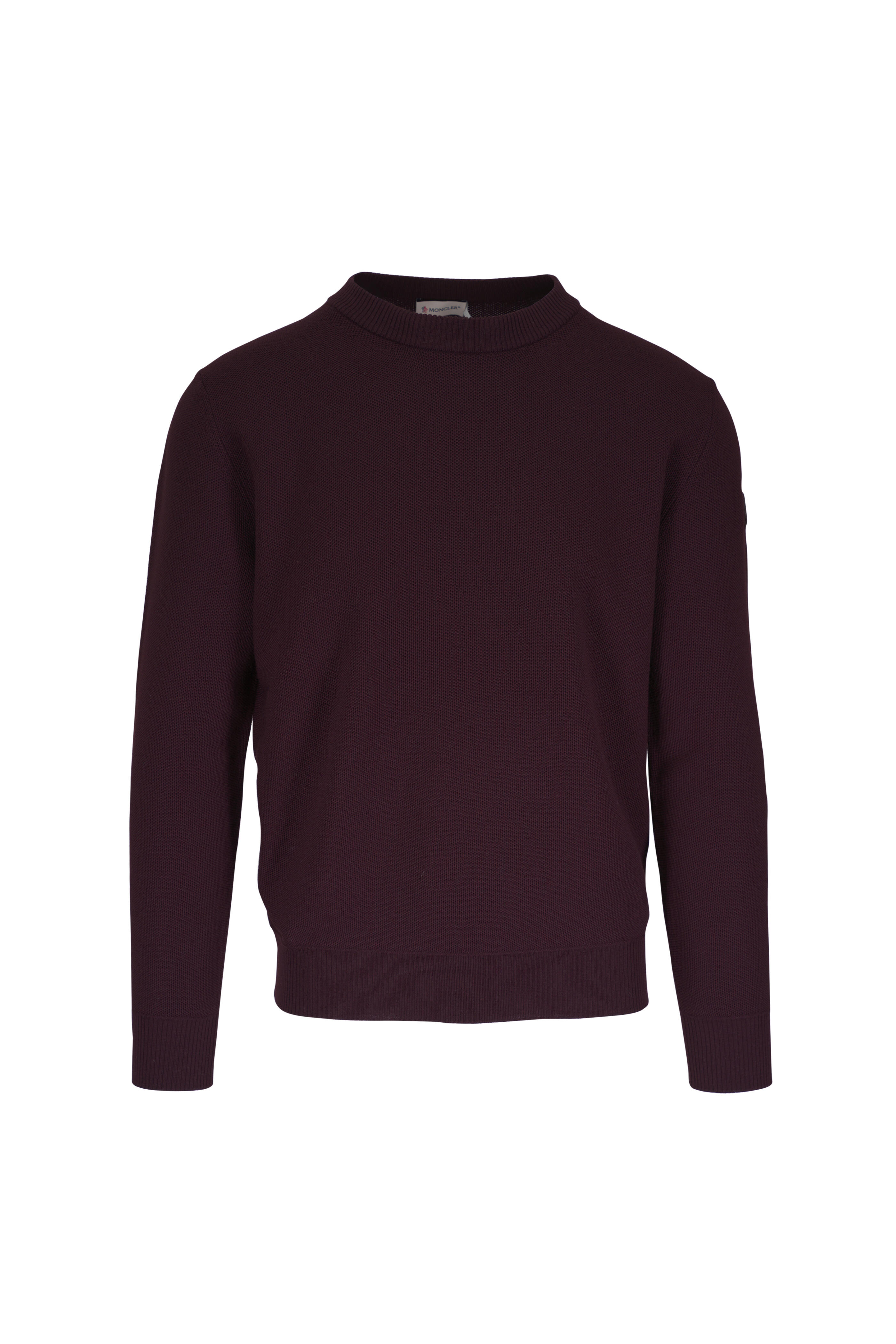 Crew neckline. Ribbed trims. Imported. 100% virgin wool. Dry clean.
