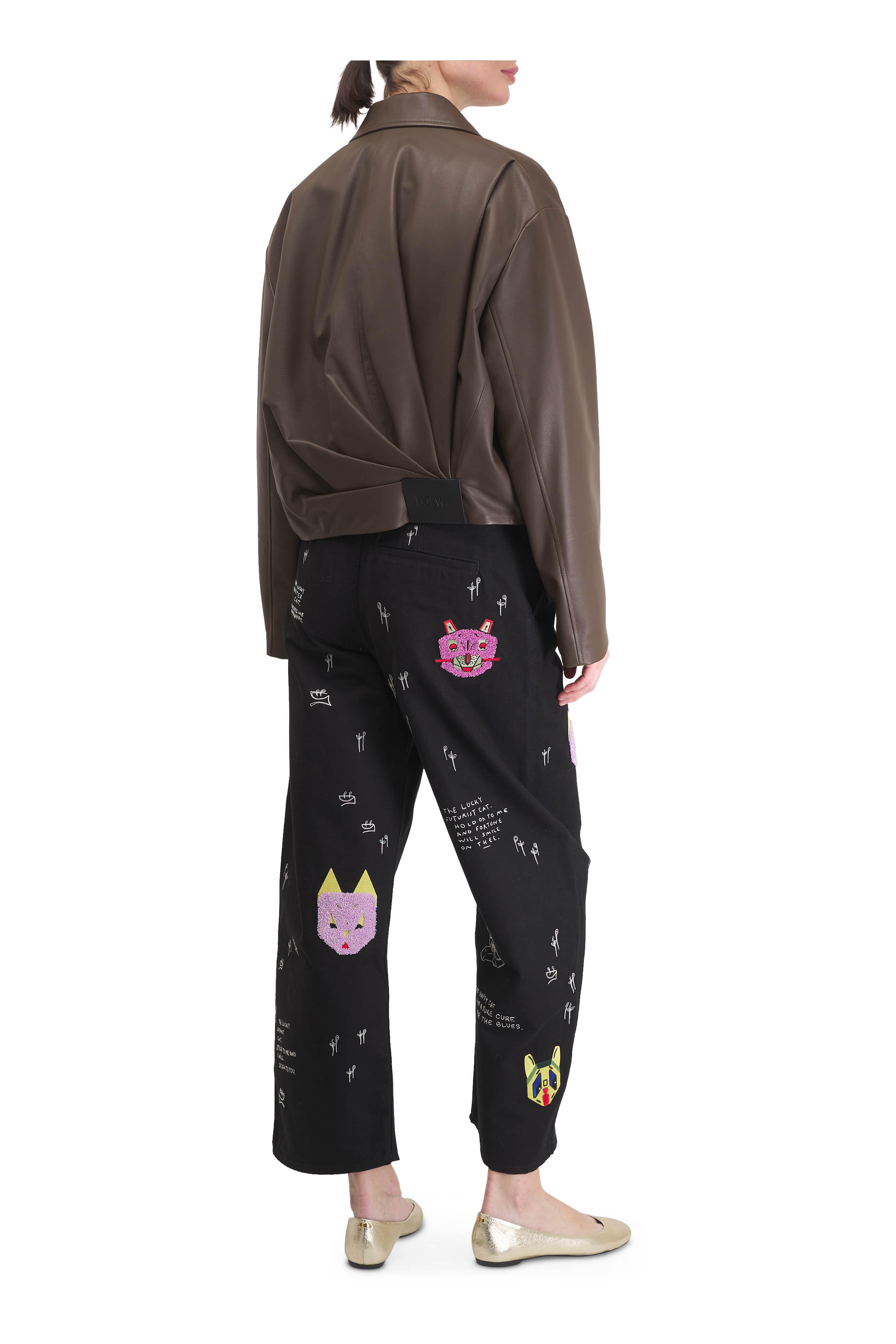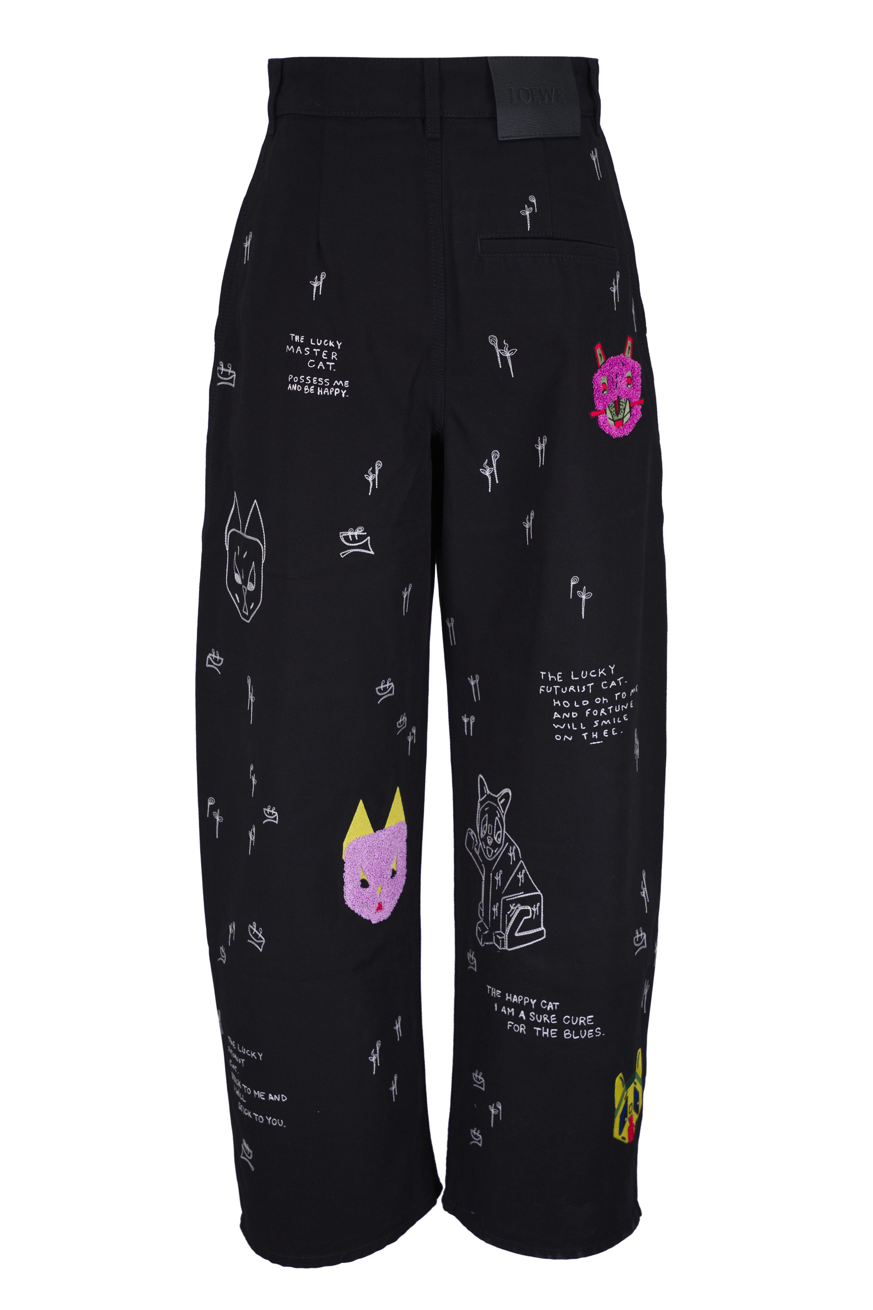 Zip‑fly with button fastening. Five‑pocket style. Wide‑leg cut; full‑length hem. Embroidered animal‑patch appliqués inspired by Louis Wain. Made in Italy. 100% cotton. Dry clean.