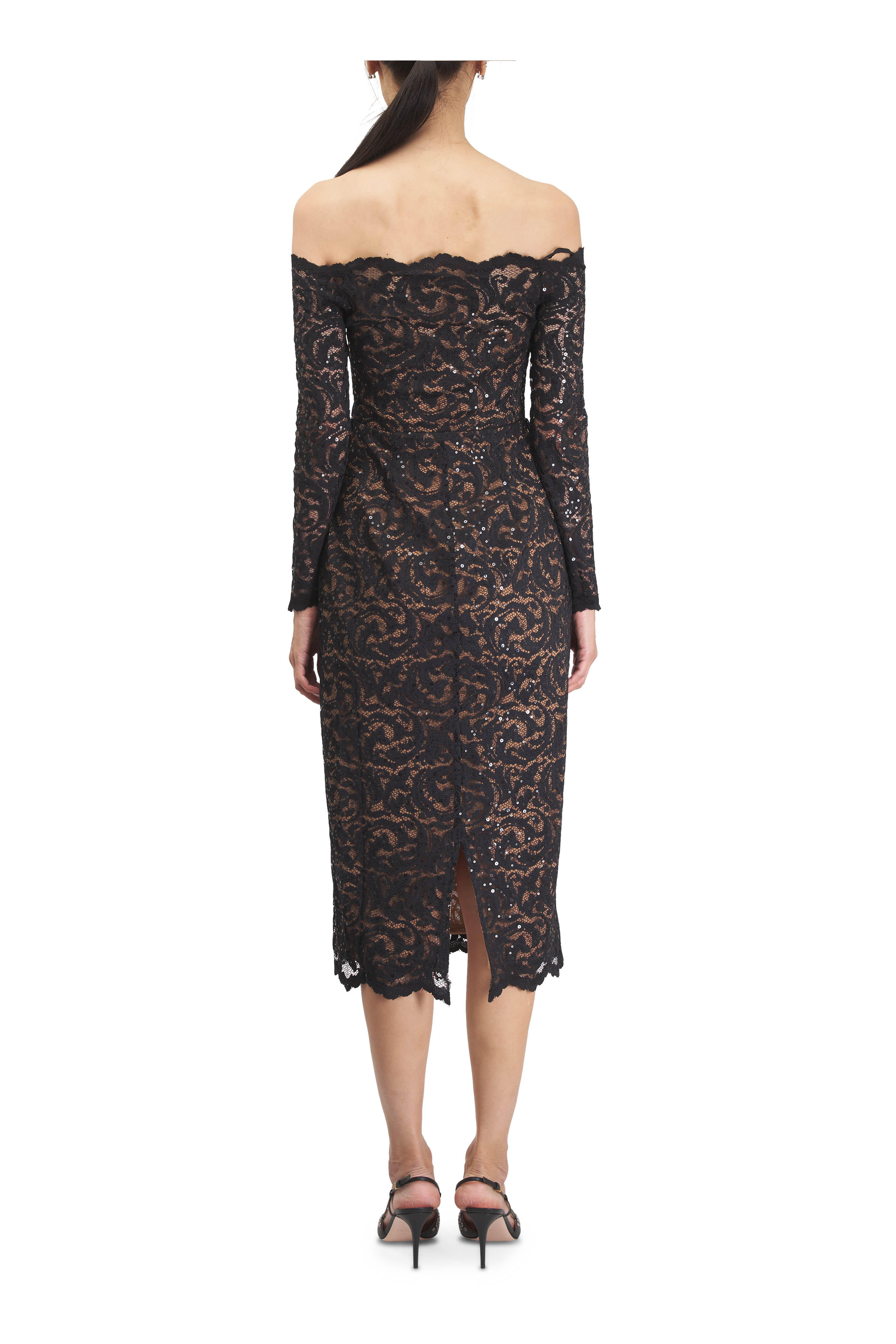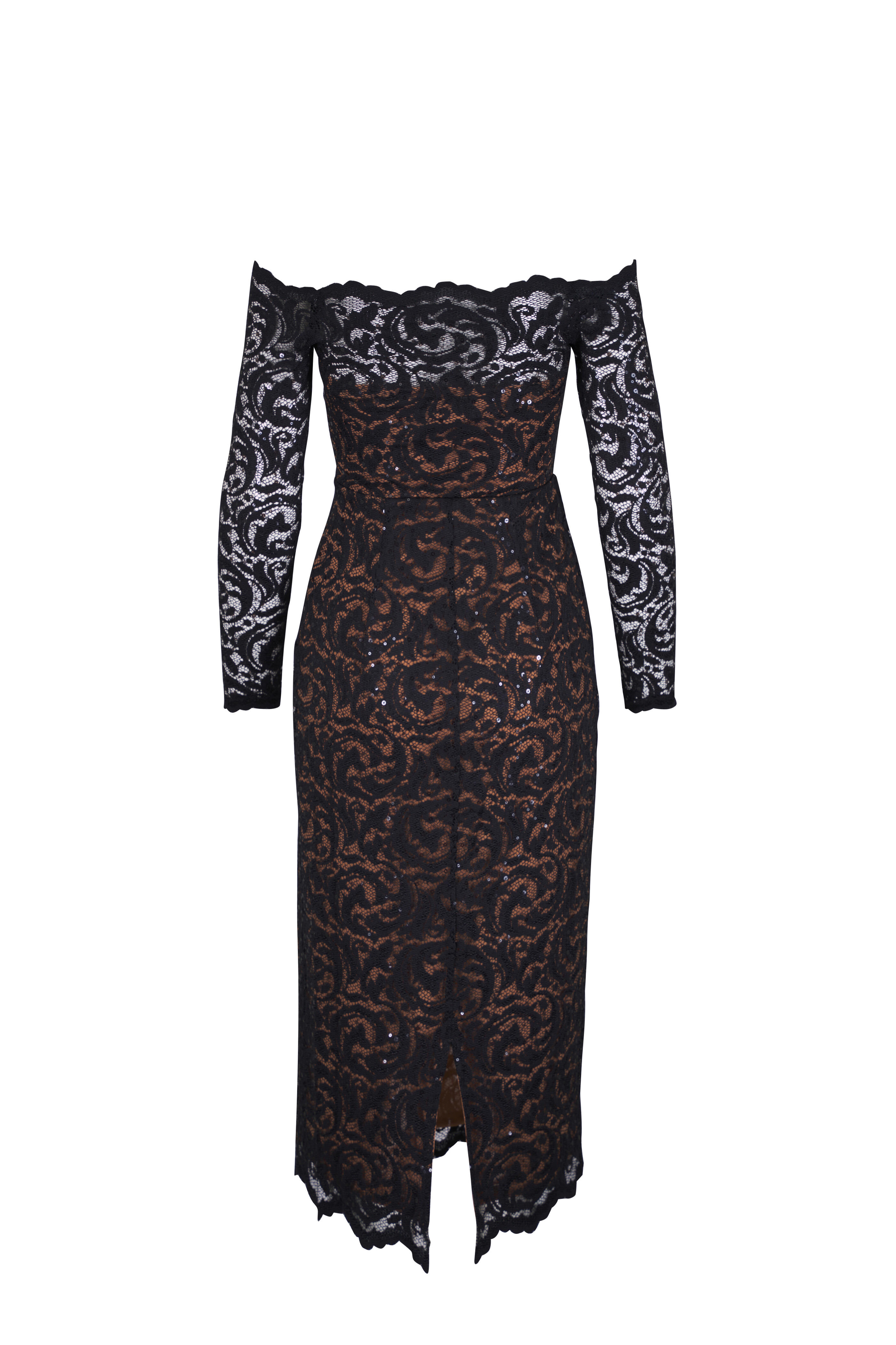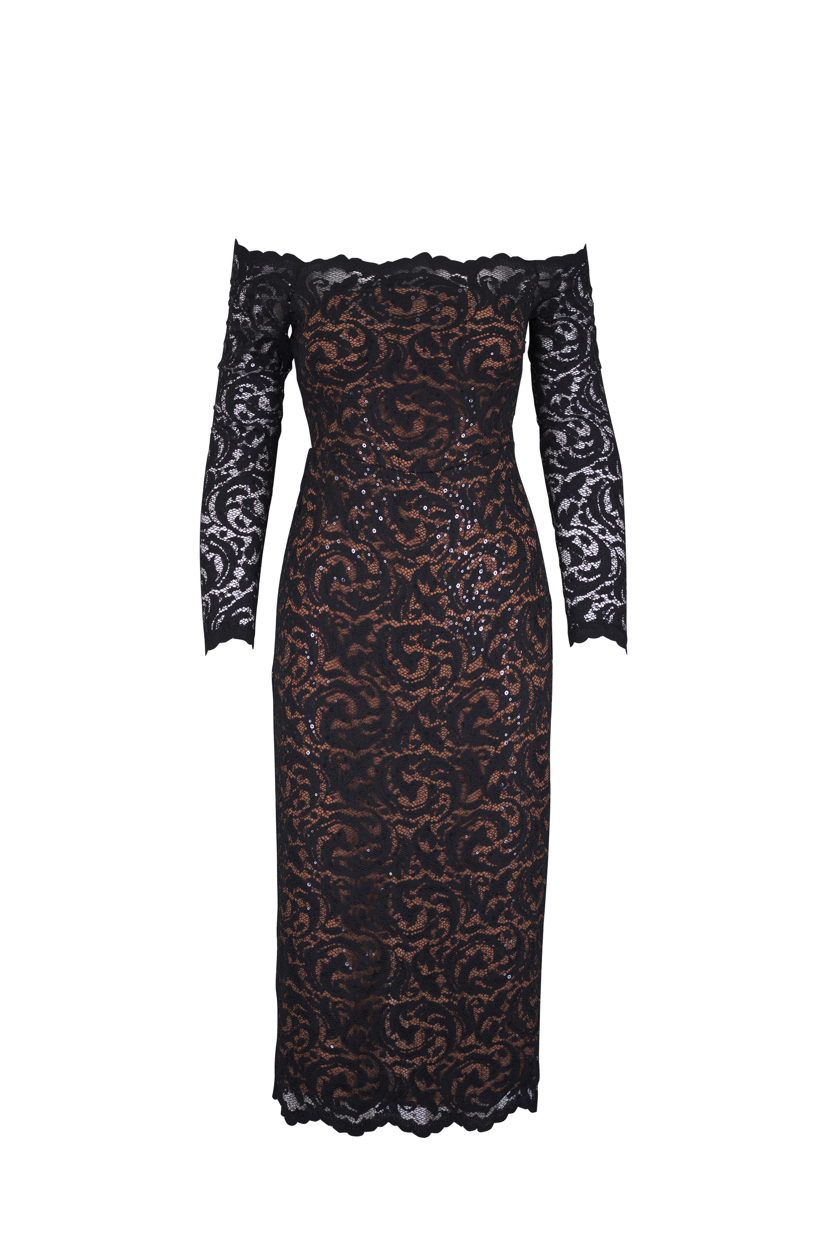 Off the shoulder neckline. Pullover style. Scalloped edges. Sheath silhouette. Sequined lace overlay. Long sleeves. Back slit. Imported. Shoulder to hem 43" (size s). 80% nylon, 14% rayon, 6% spandex; lined. Dry clean.