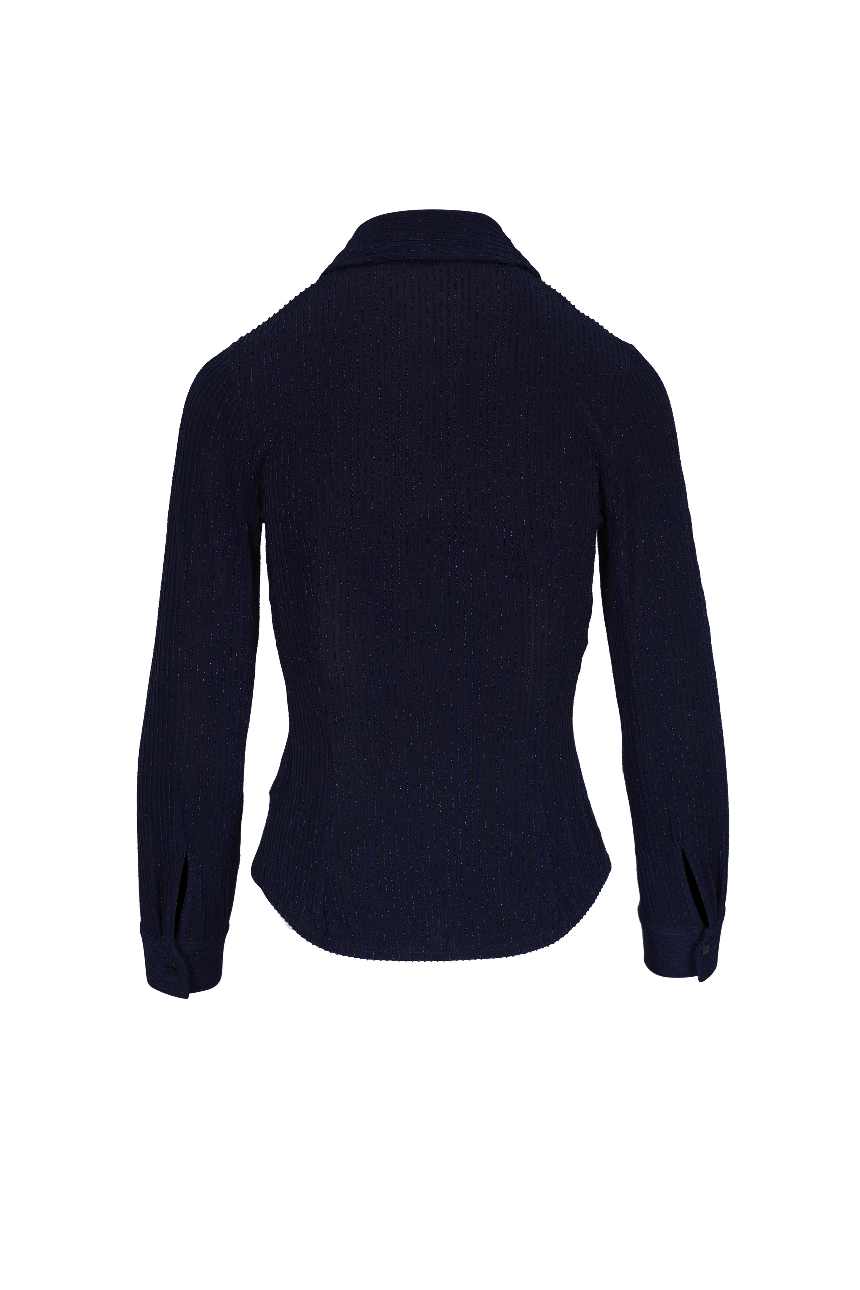 Point collar. Front button placket. Metallic striped knit. Single button cuffs. Shirttail hem. Imported. Shoulder to hem 23" (size xs). Fitted. 74% polyester, 16% metallic, 10% spandex. Dry clean.