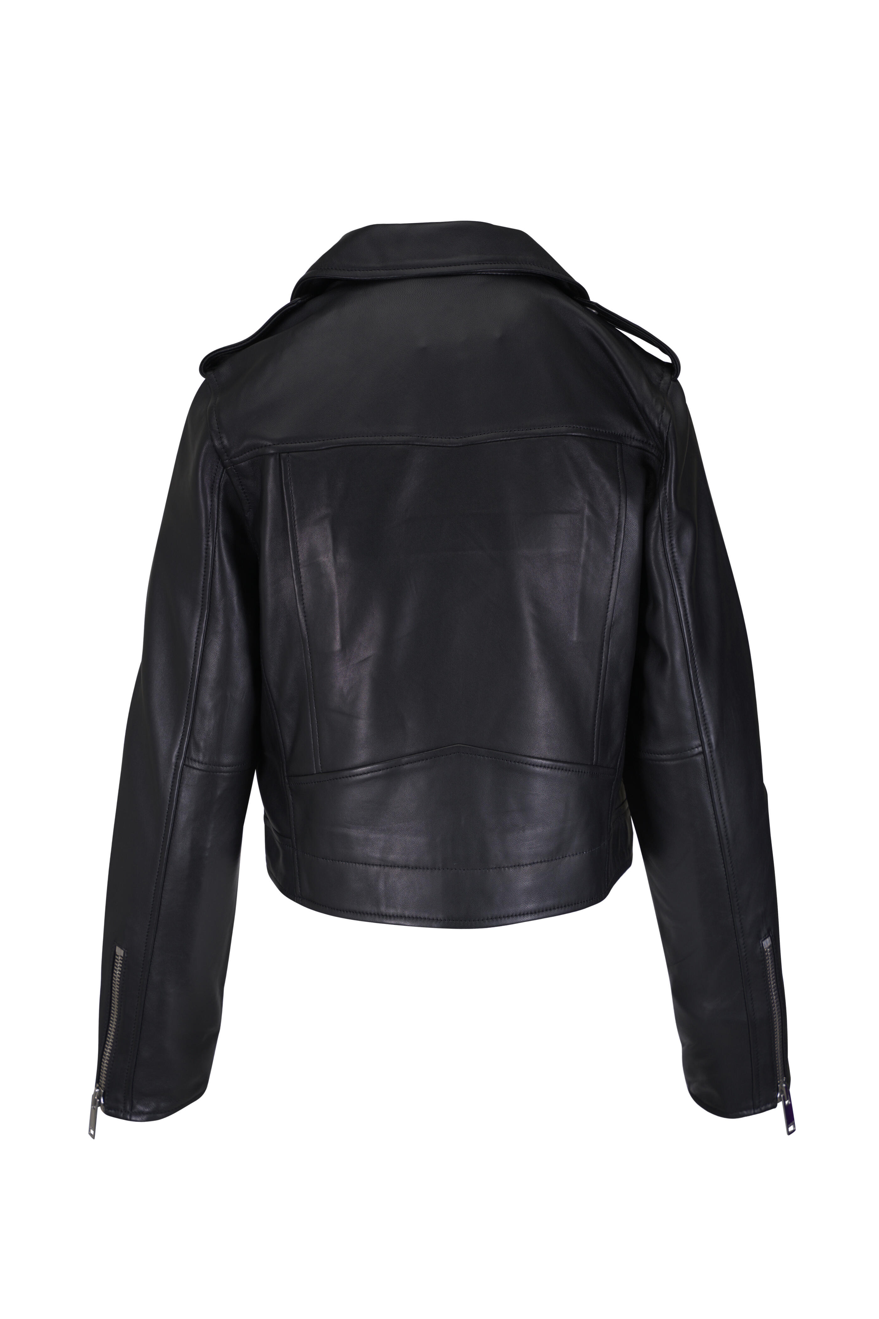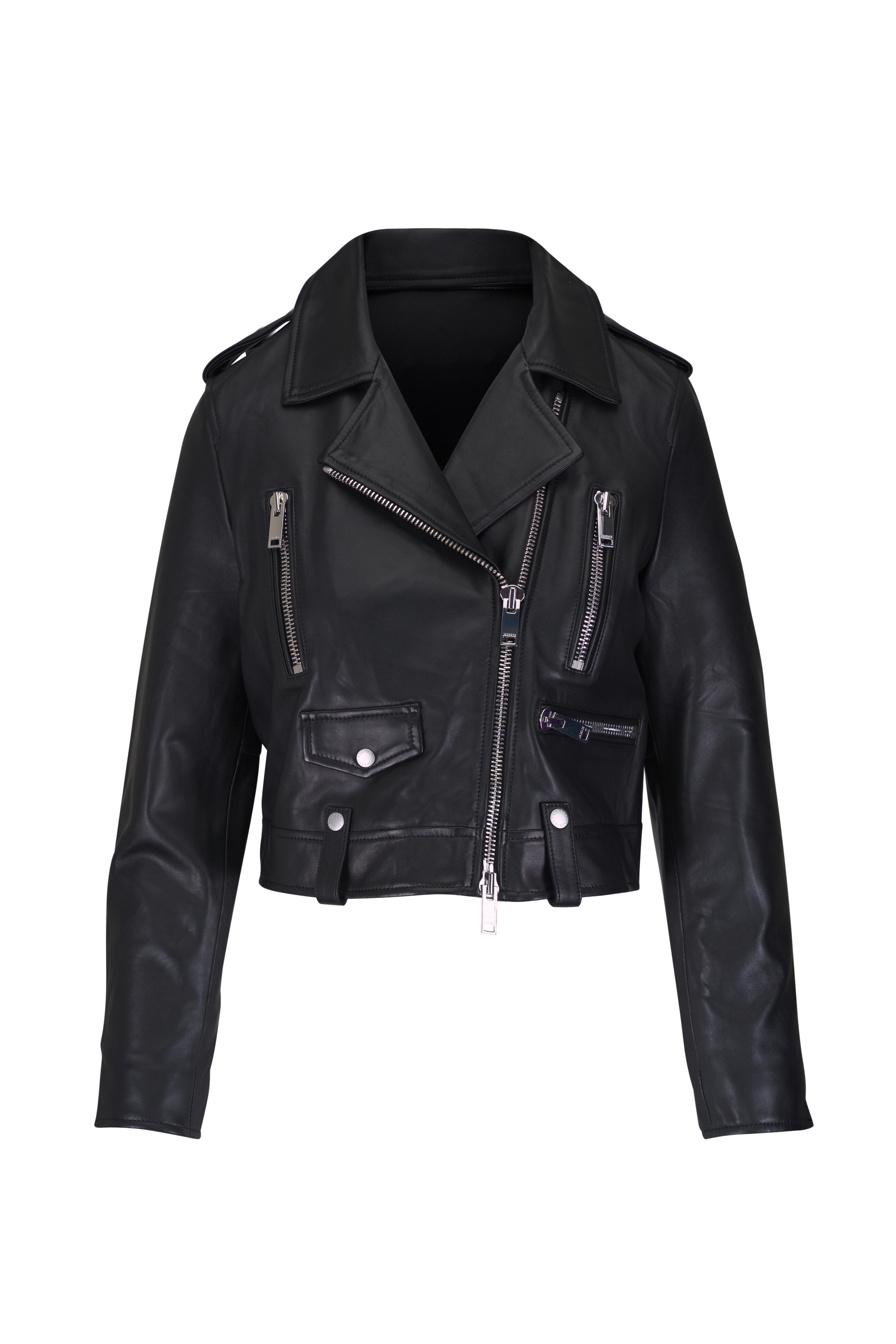 Lamb leather; fully lined. Specialist clean. Notched lapels. Two-way zip closure. Chest zip pockets; lower zip & button pocket. Shoulder epaulette. Zip cuffs. Straight hem. Imported. Shoulder to hem 20" (size s).