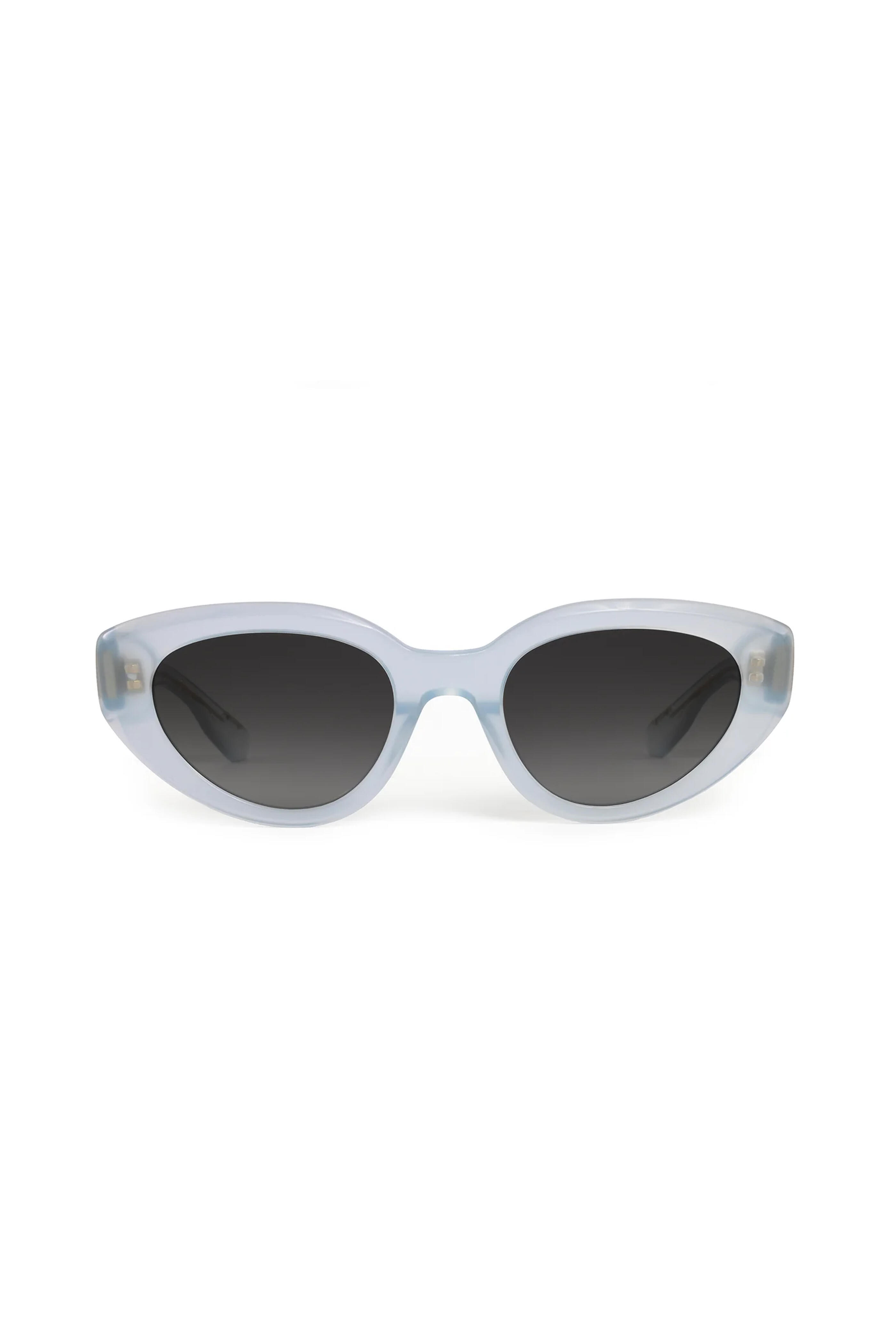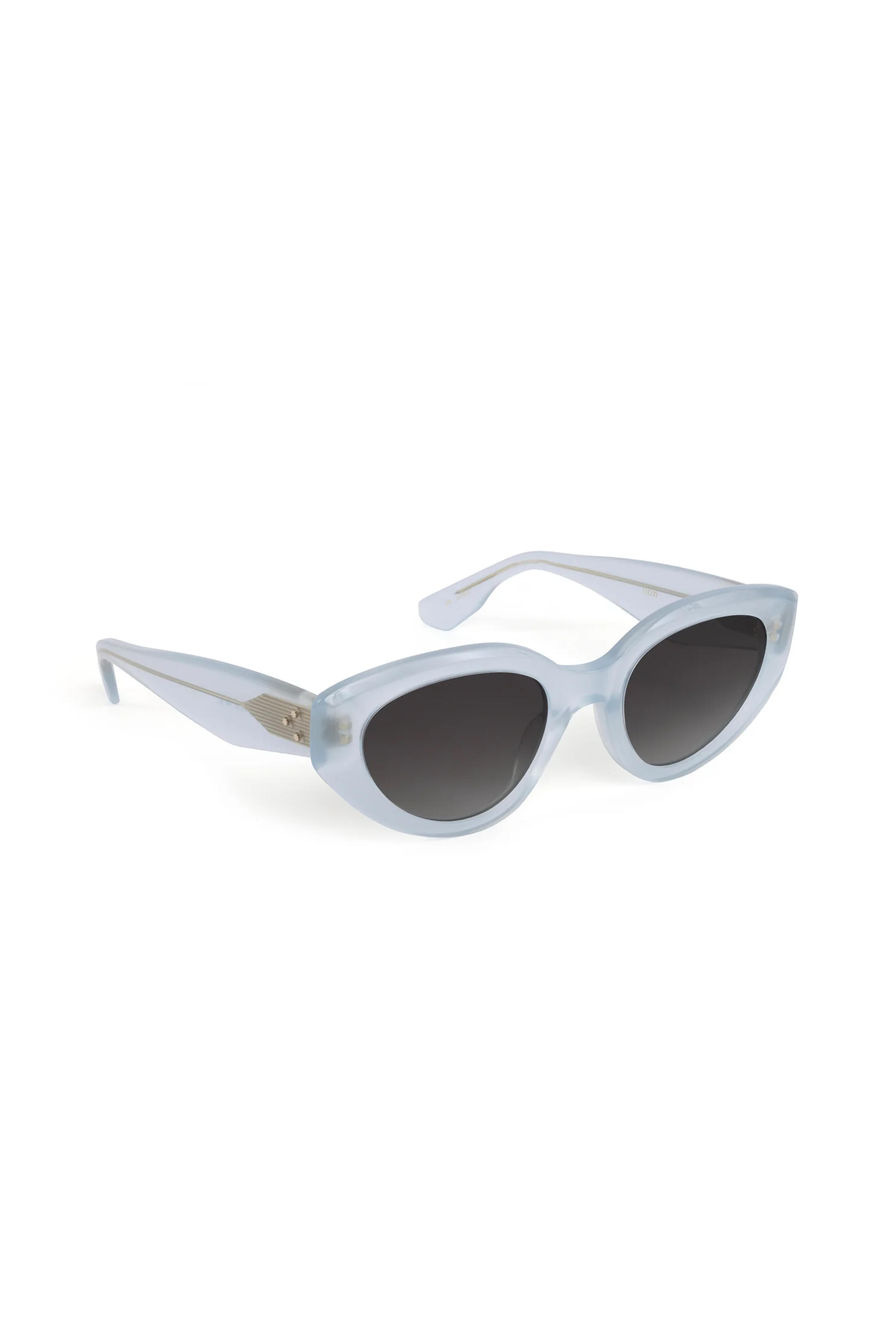 Custom, grey gradient lenses. Handcrafted, acetate frame features a glossy finish. Riveted 5 barrel hinges enhance the frame’s durability. Adjustable temple wire allows for a customized fit. Anti-reflective and scratch-resistant coatings. Fit: 136mm. Eye: 52mm. Temple: 145mm. Bridge: 23mm. 100% UVA and UVB protection.