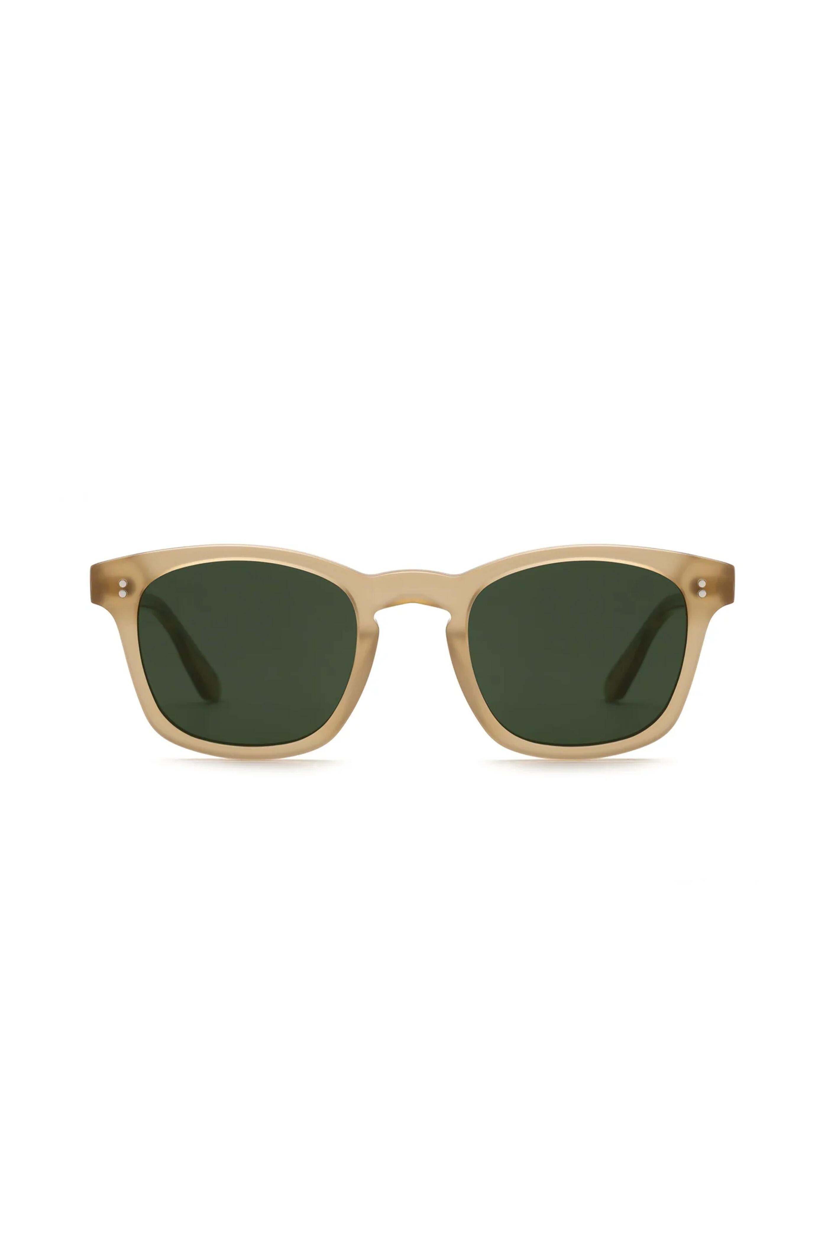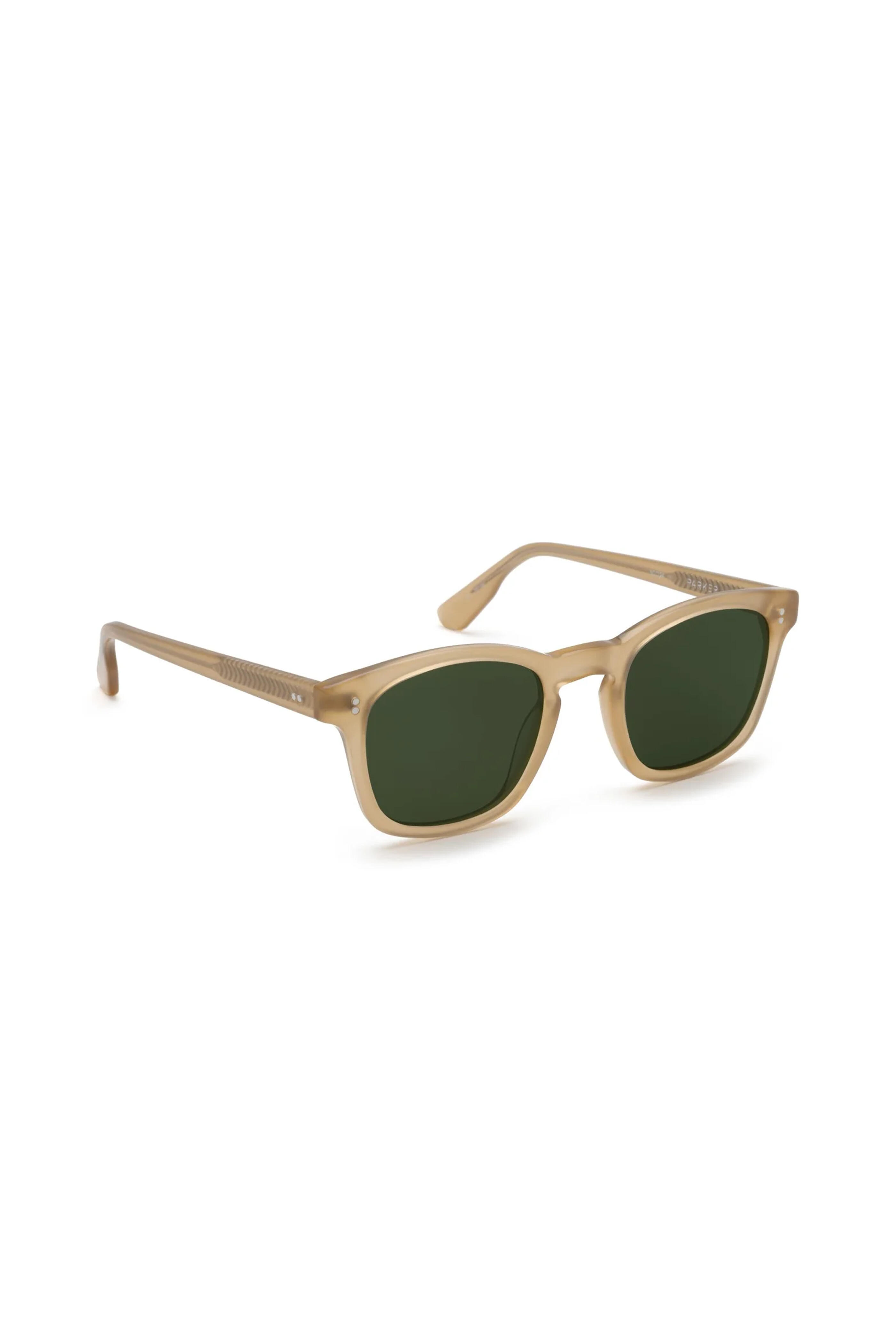 Custom, dark green lenses. Handcrafted, acetate frame features a glossy finish. Riveted 5 barrel hinges enhance the frame’s durability. Adjustable temple wire allows for a customized fit. Anti-reflective and scratch-resistant coatings. Fit: 134mm. Eye: 50mm. Temple: 147mm. Bridge: 24mm. 100% UVA and UVB protection.