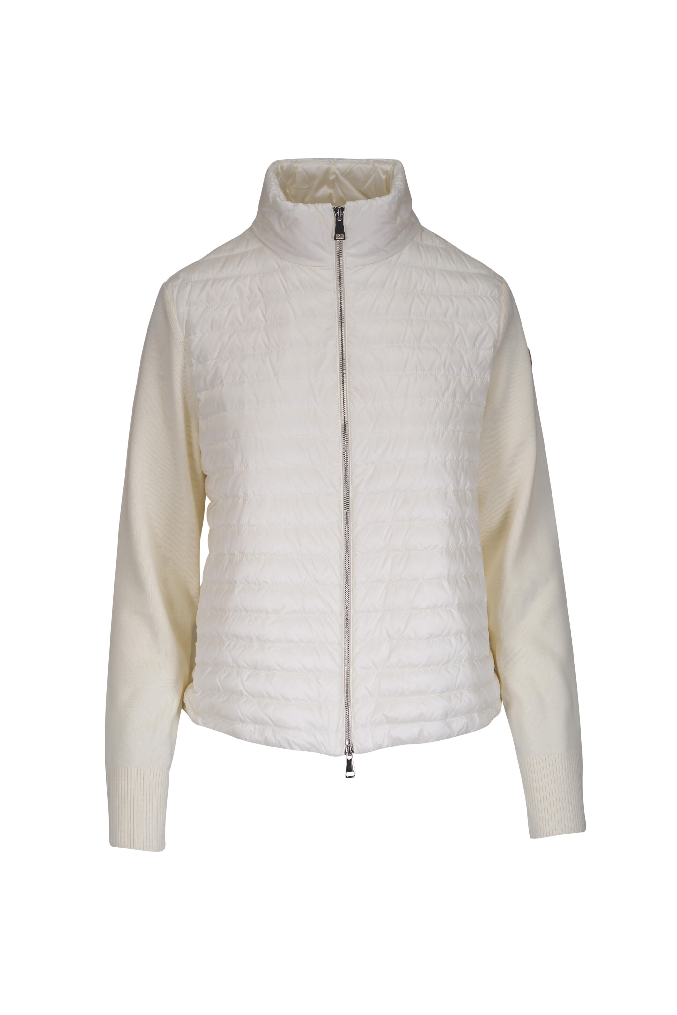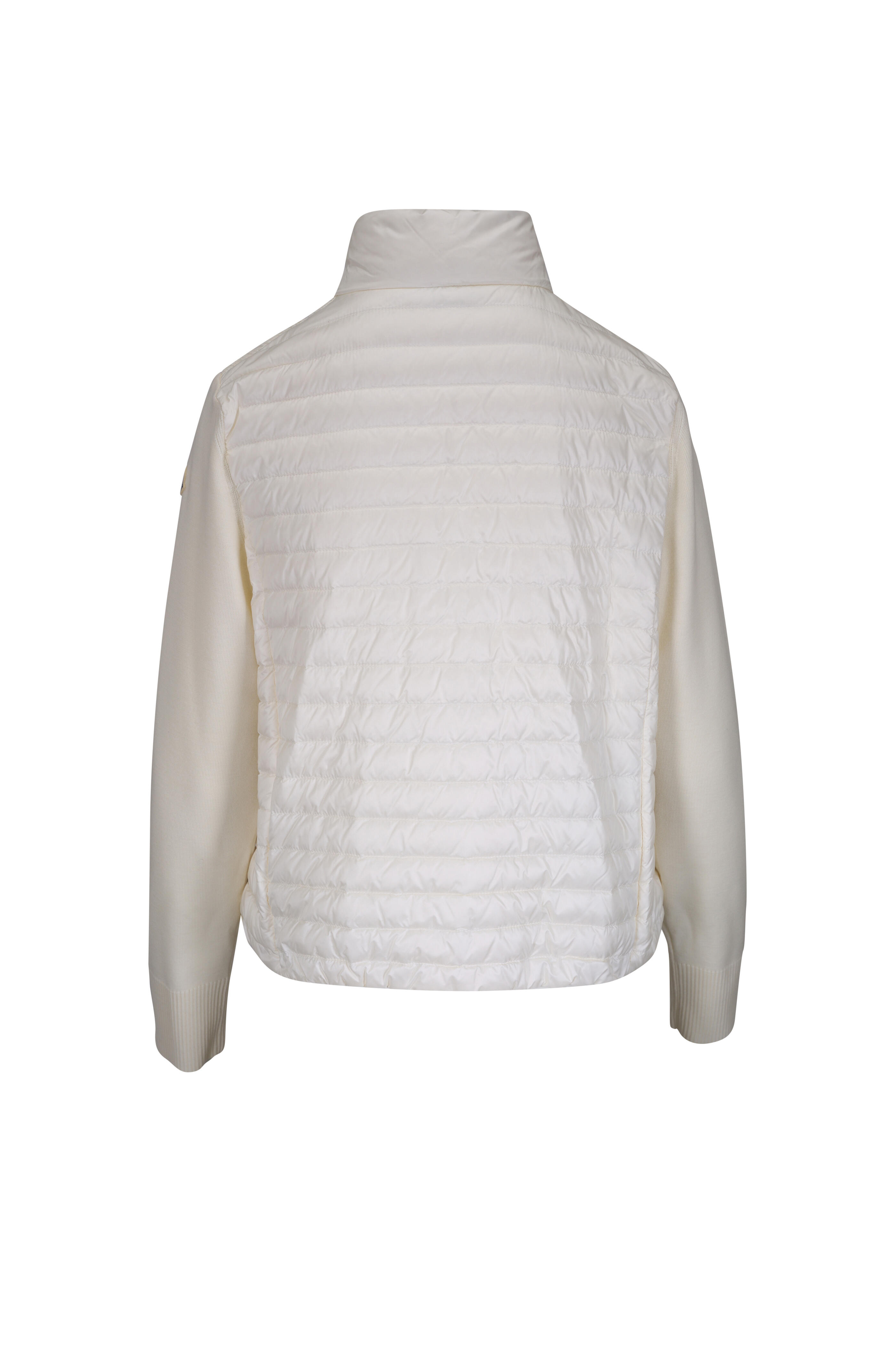 Stand collar. Two-way front zip. Knit long sleeves; ribbed knit cuffs. Side zip pockets. Made in Italy. 100% nylon; fabric 2: 100% virgin wool; fill: 90% goose down, 10% feathers. Dry clean.