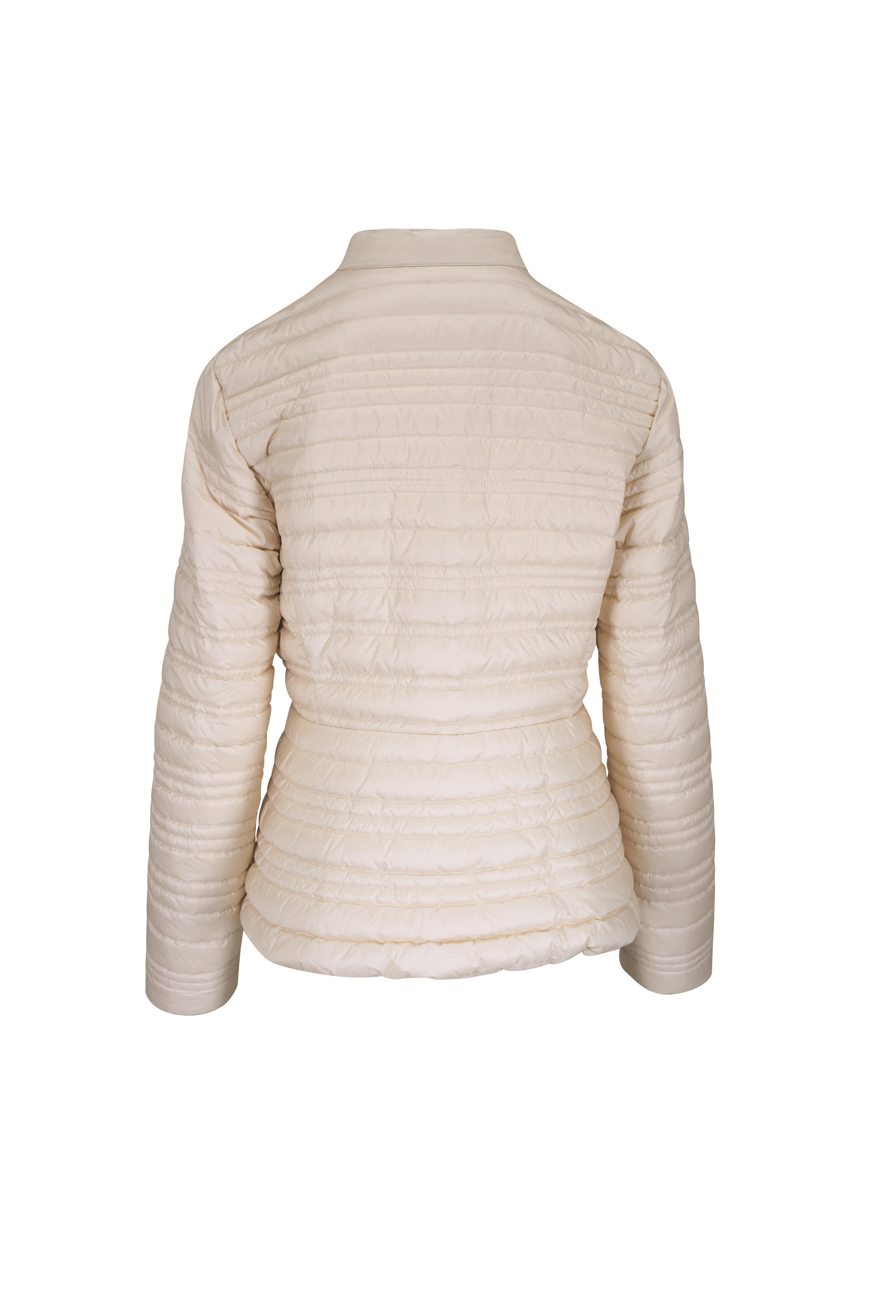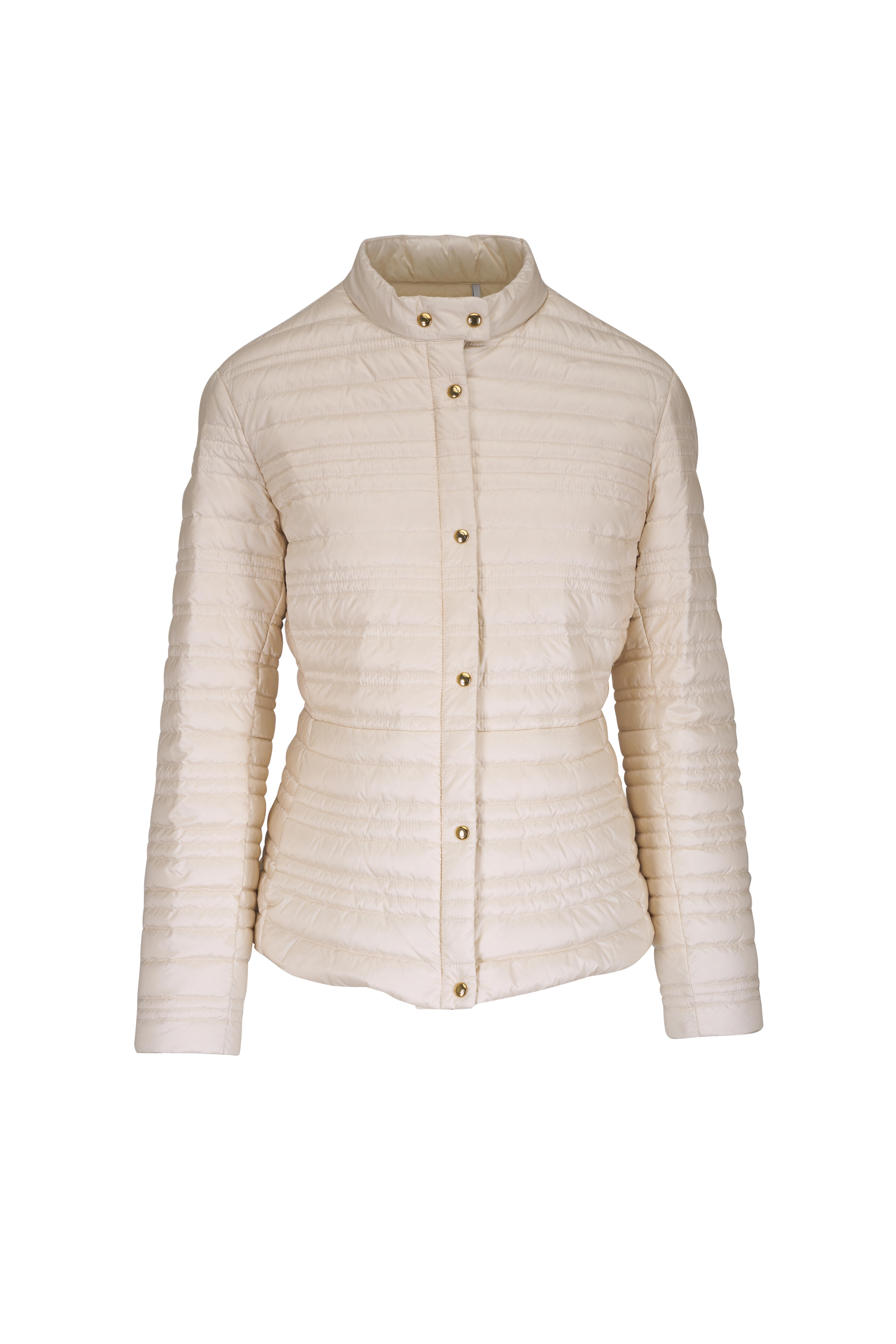 Mandarin collar with snap closure. Front concealed two-way zip placket; snap button placket. Side slip pockets with concealed snap closure. Imported. Approximately 25" should to hem (measurements taken from size 6). 100% polyester; fill: 90% down, 10% feather; lined. Dry clean.