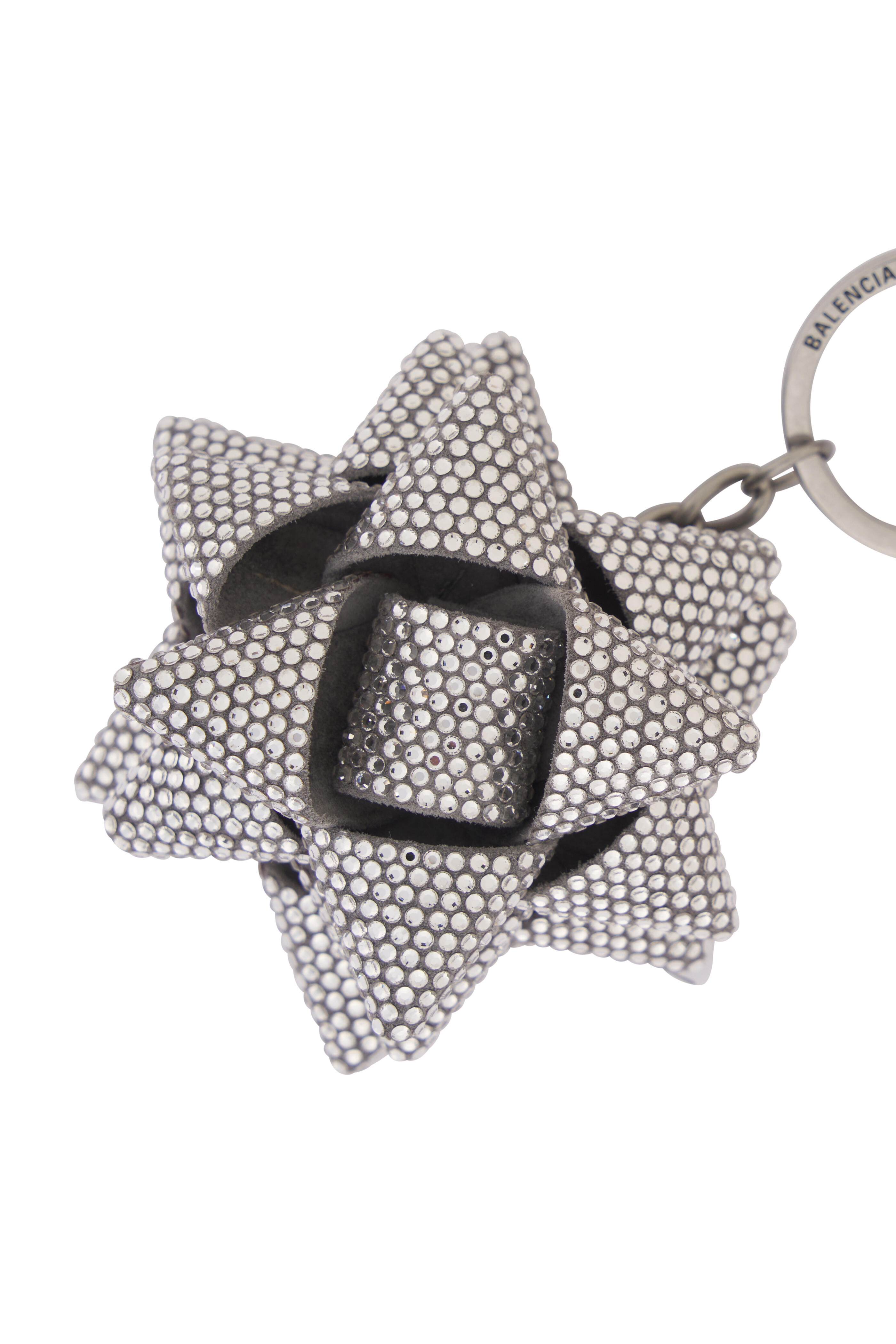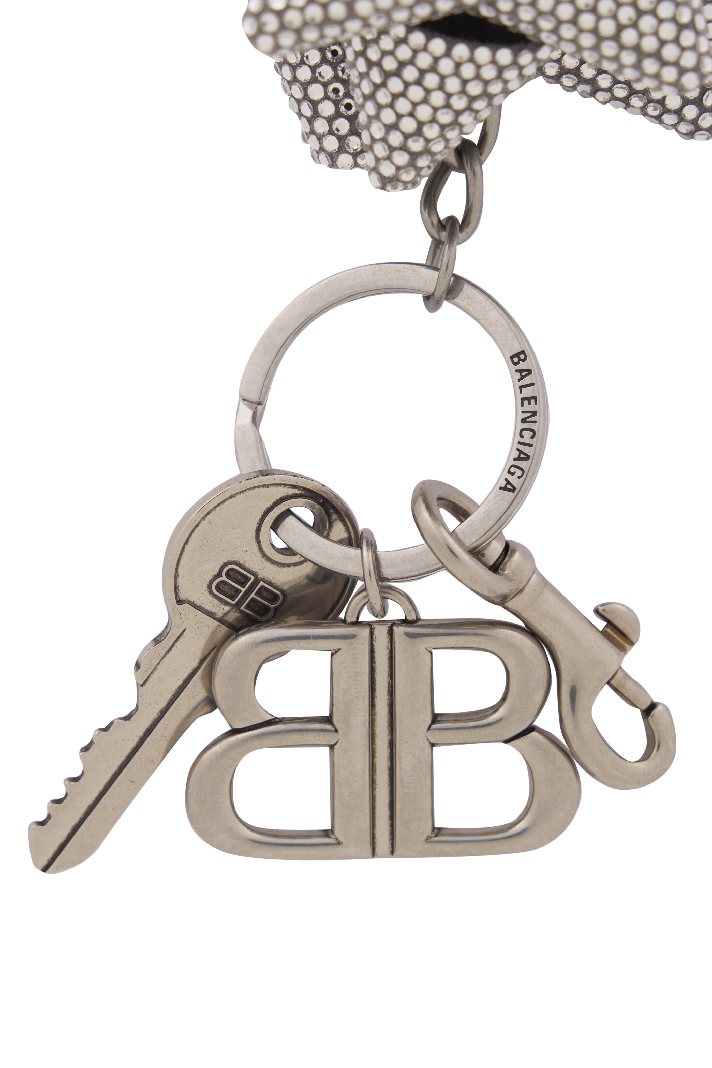 Cashmere calfskin, glass, zamak, brass and steel. BB and Balenciaga logo engraved. Aged-silver hardware. 1 snapped hook. Can be attached to the bag or be used as a keychain. Made in Italy. Height: 3.1". Width: 1.4".