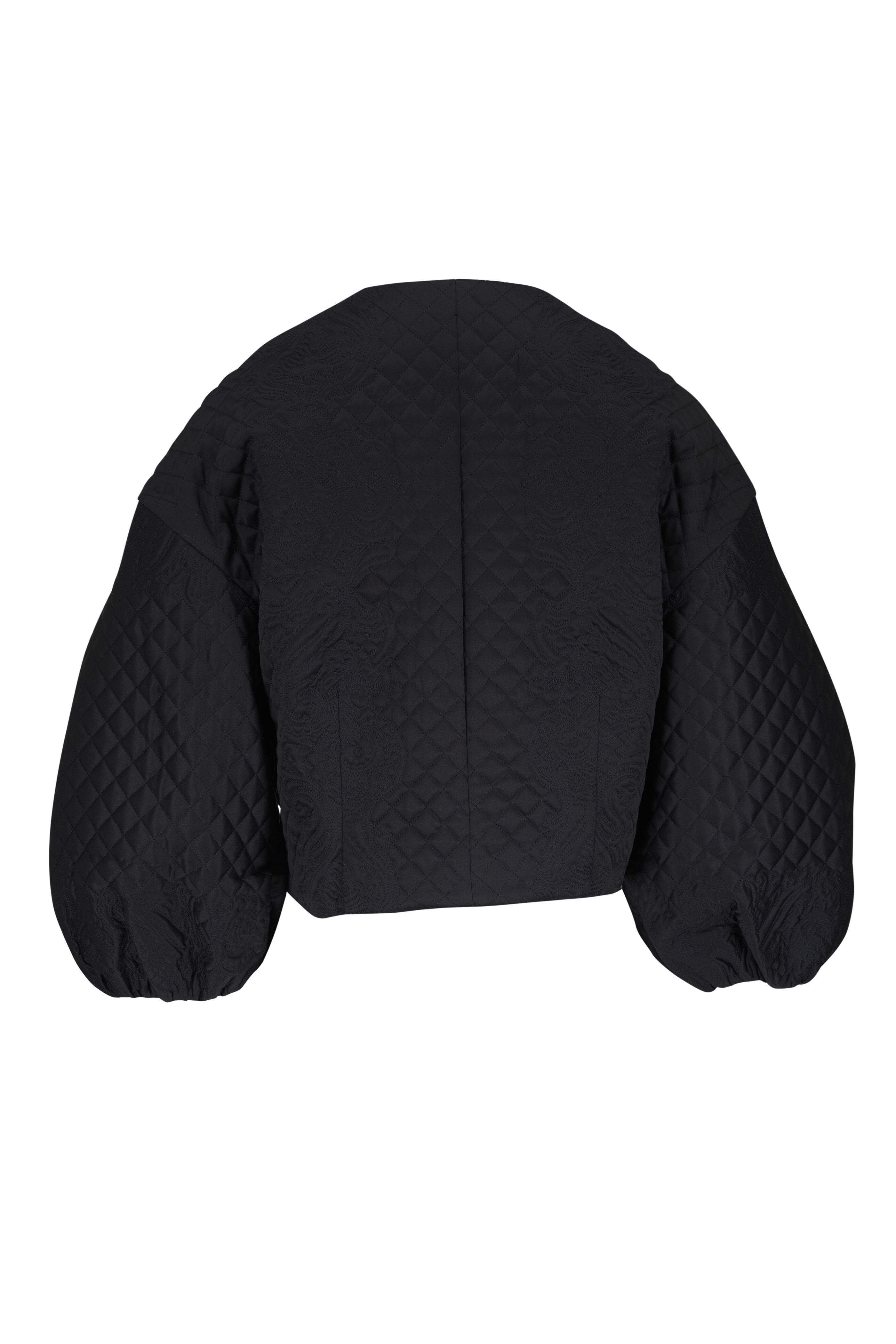 Jewel neckline. Front button placket. Balloon sleeves. Lower welt pockets. Imported. 100% polyester; fill: 100% polyester. Dry clean.
