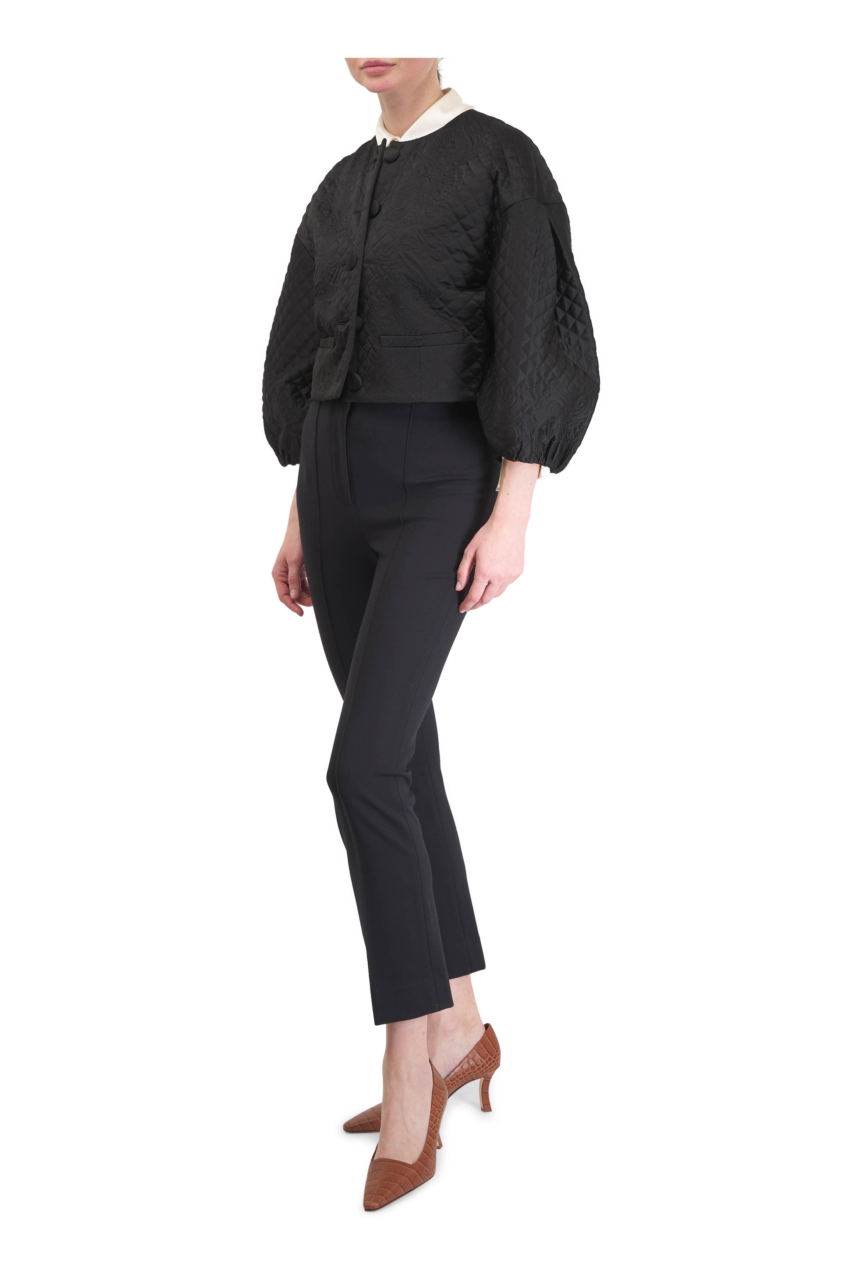 Zip fly; hook-and-bar closure. Front seam. Made in the USA. Inseam: 27”. Rise: 11.125". Leg opening: 15". 68% viscose, 28% polyamide, 4% elastane. Dry clean.