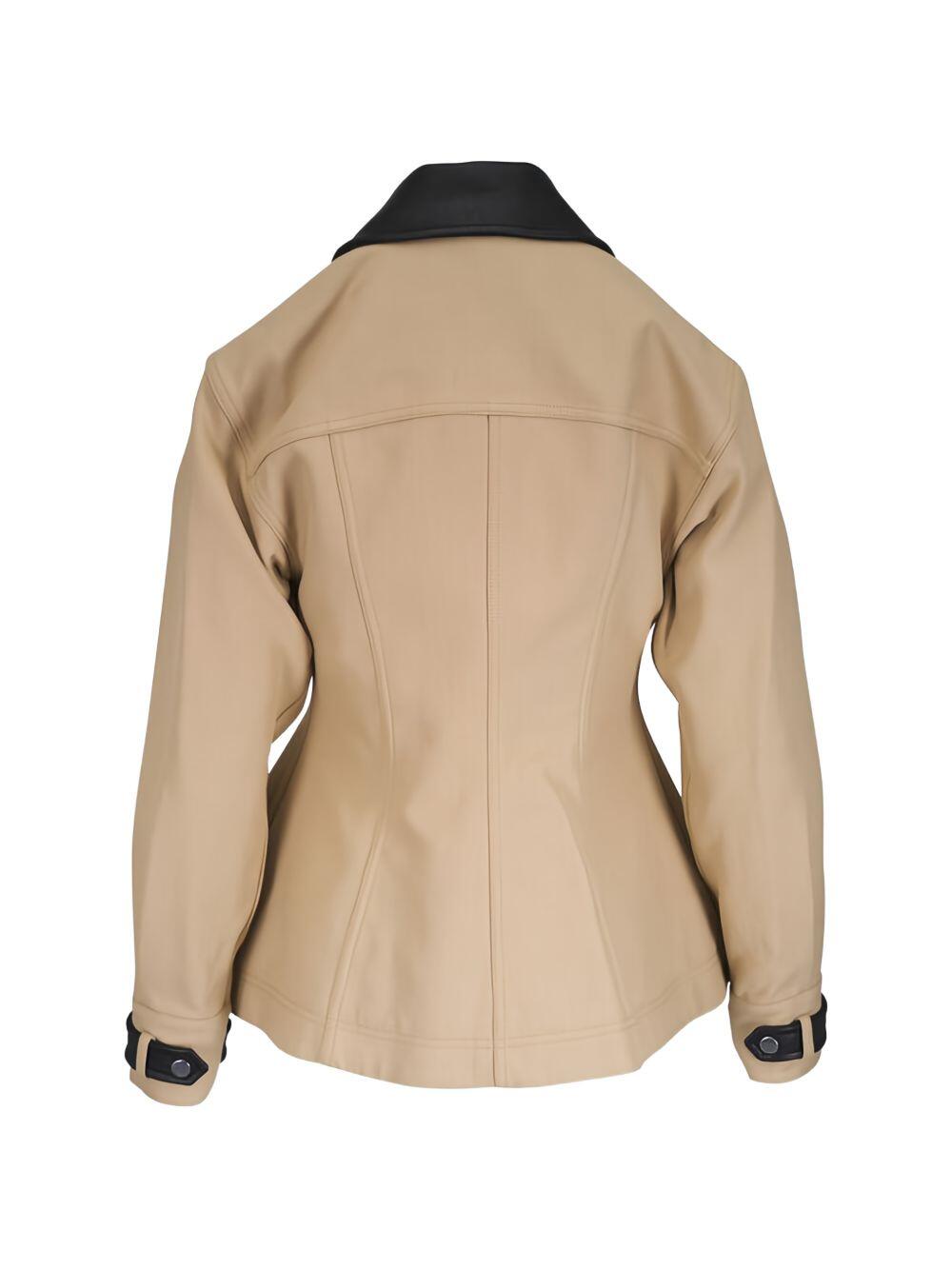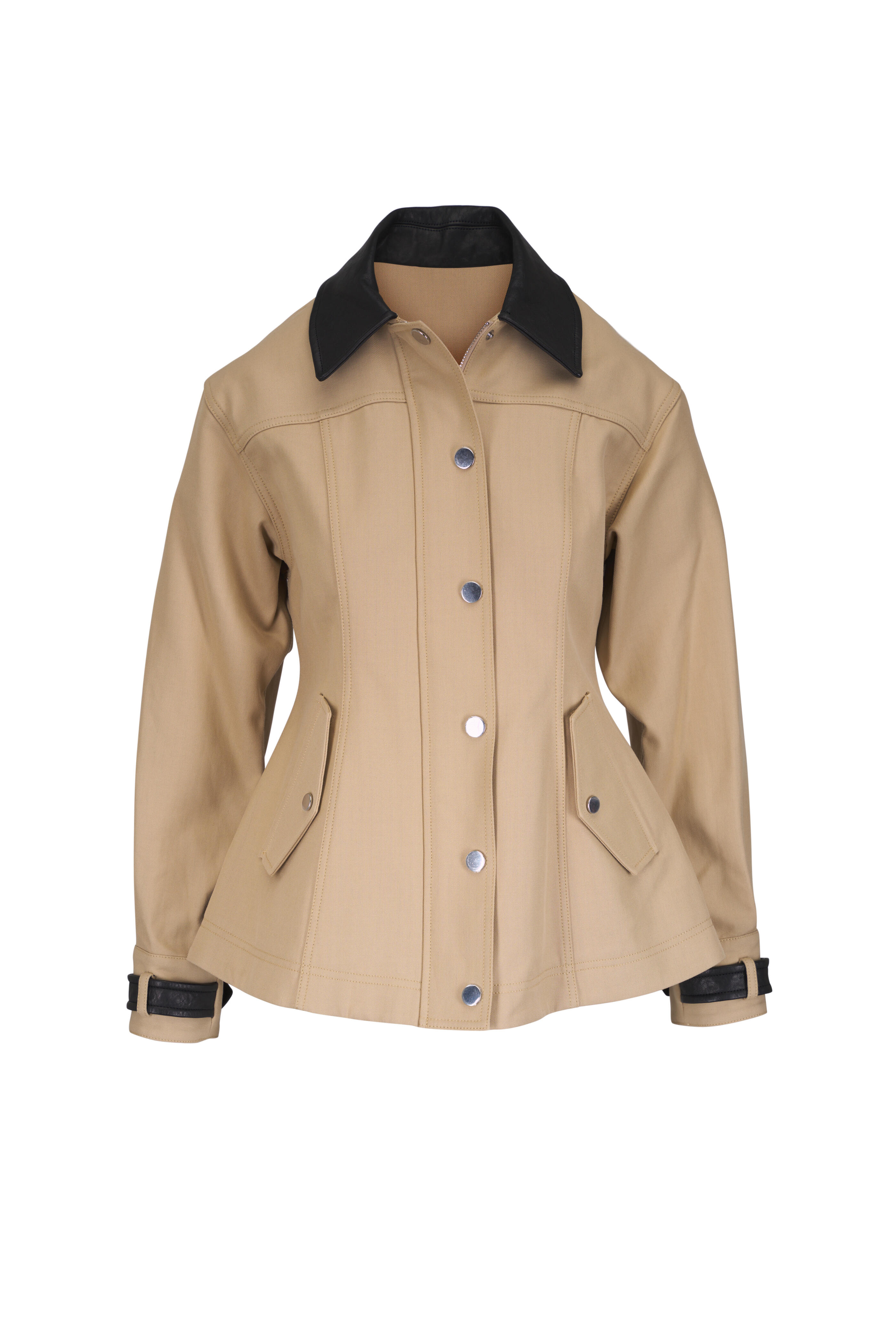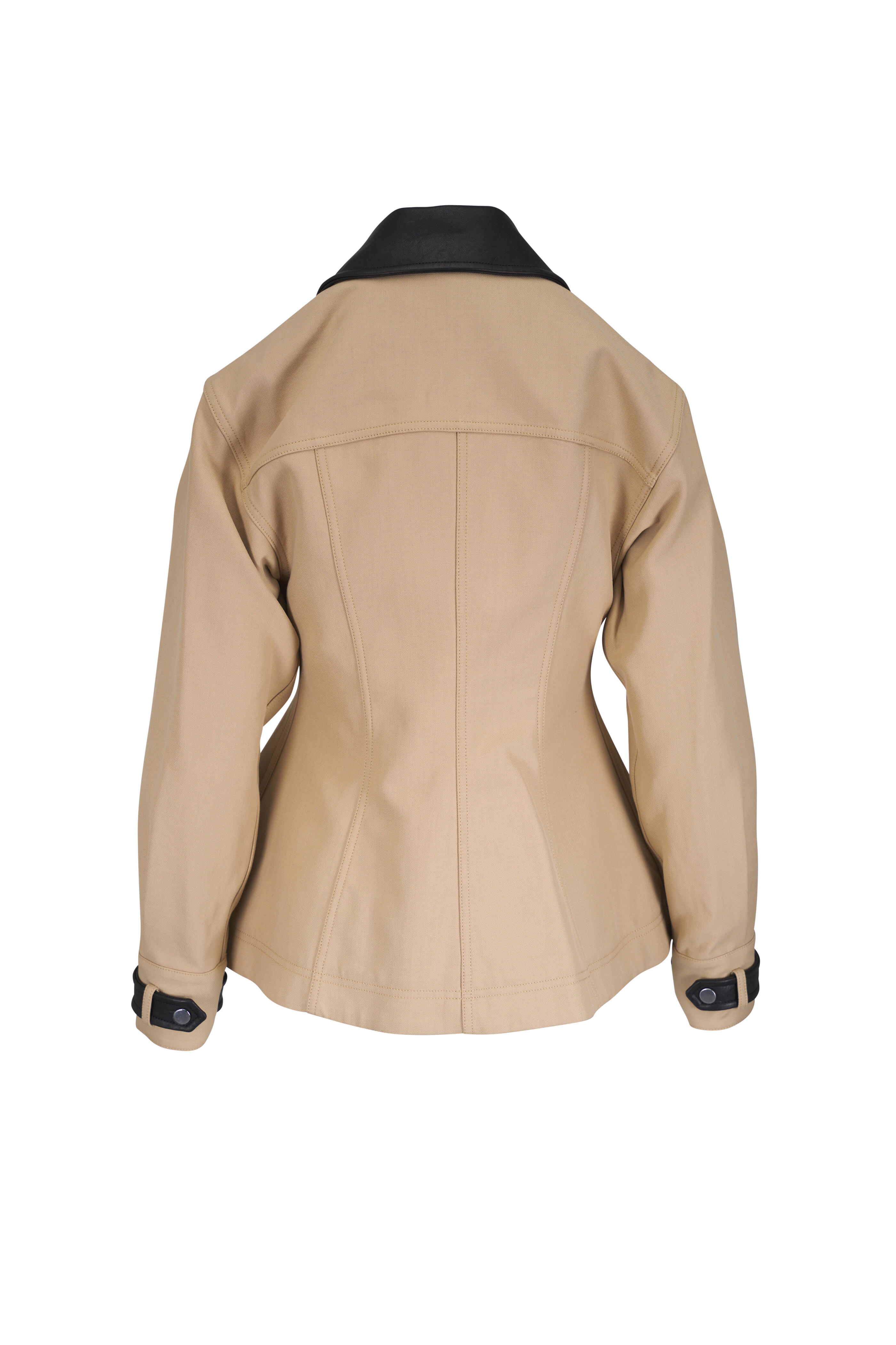 Leather spread collar. Front button placket. Leather sleeve tabs. Angled flap pockets. Imported. 100% cotton; lined. Dry clean.