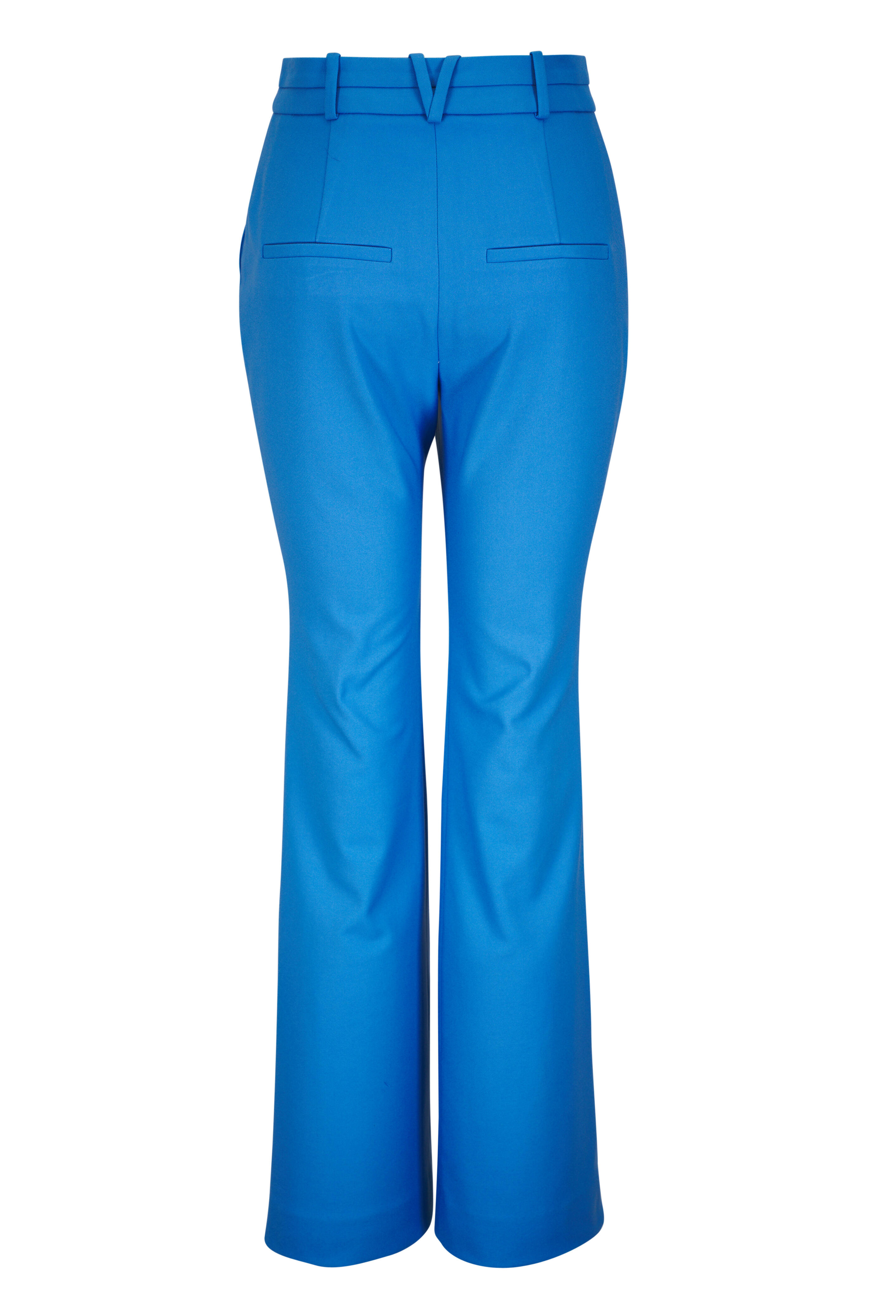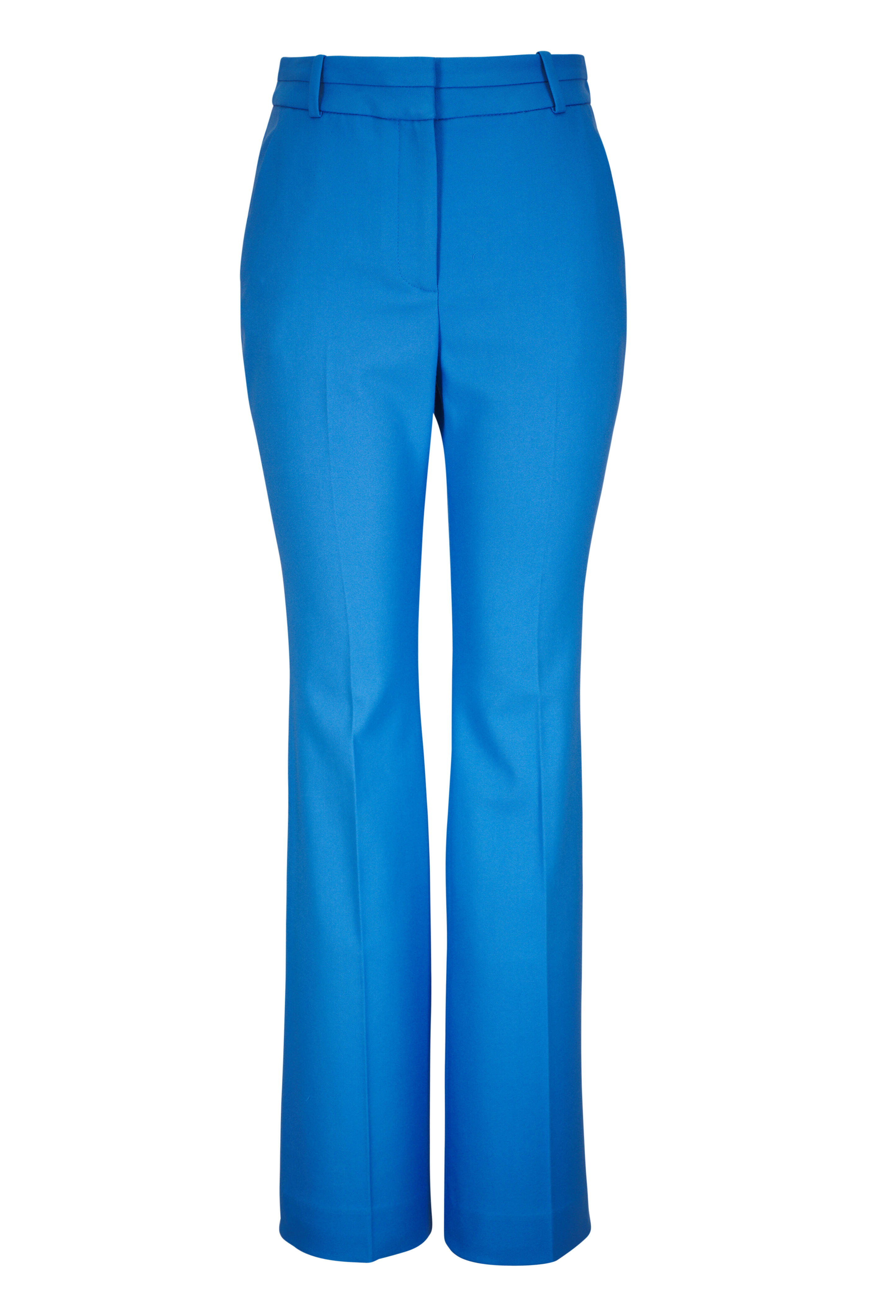 Zip fly; hook-and-bar closure. Banded waist; belt loops. Side slip pockets; back welt pockets. Front pleats. Made in the USA. Inseam: 34". Leg opening: 19 ½". Rise: 10 ¾". 63% polyester, 34% viscose, 3% elastane; lined. Dry clean.