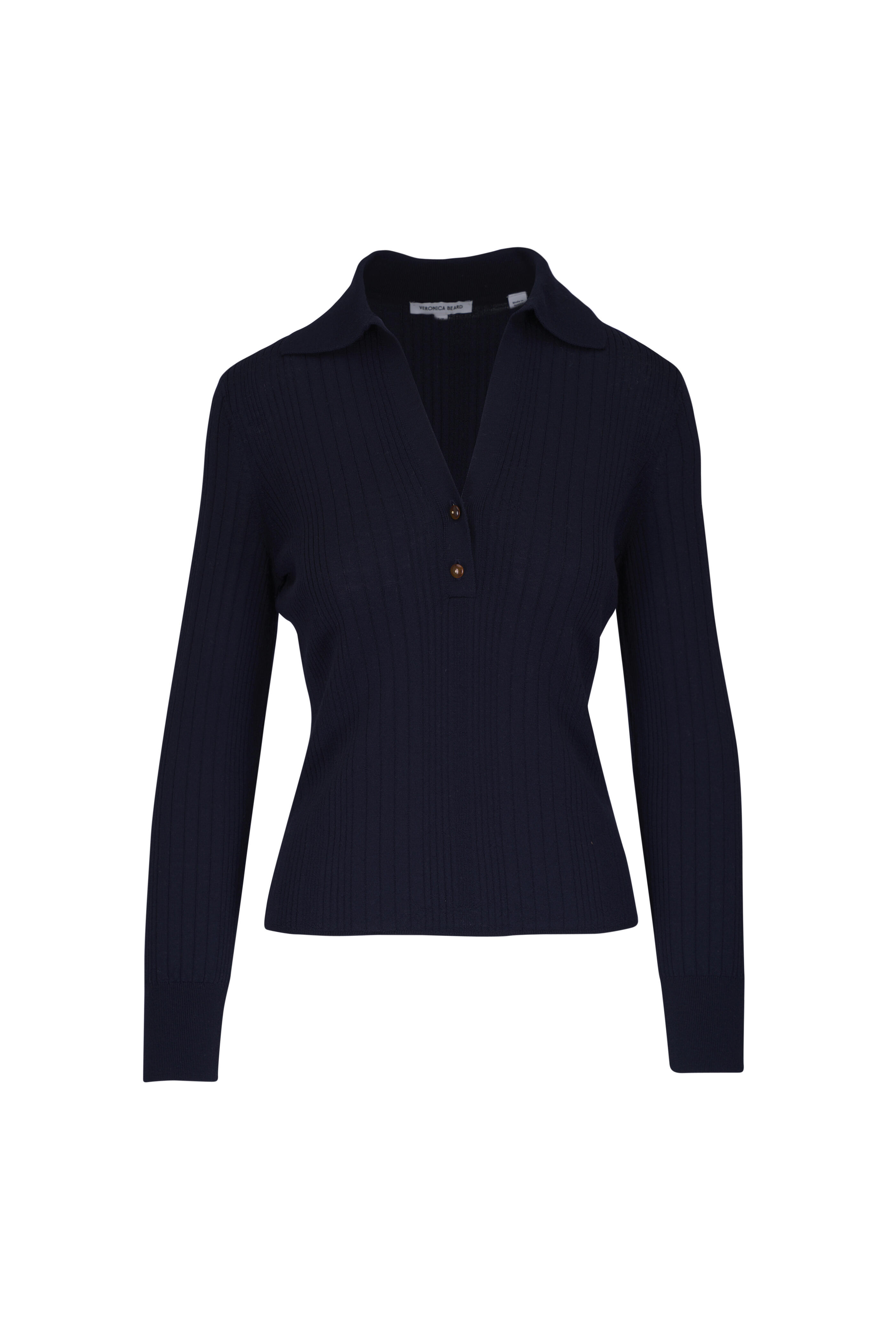 Spread collar. Partial front button placket. Ribbed throughout. Imported. Approximately 22" shoulder to hem (measurements taken from size S). 100% merino wool. Dry clean.