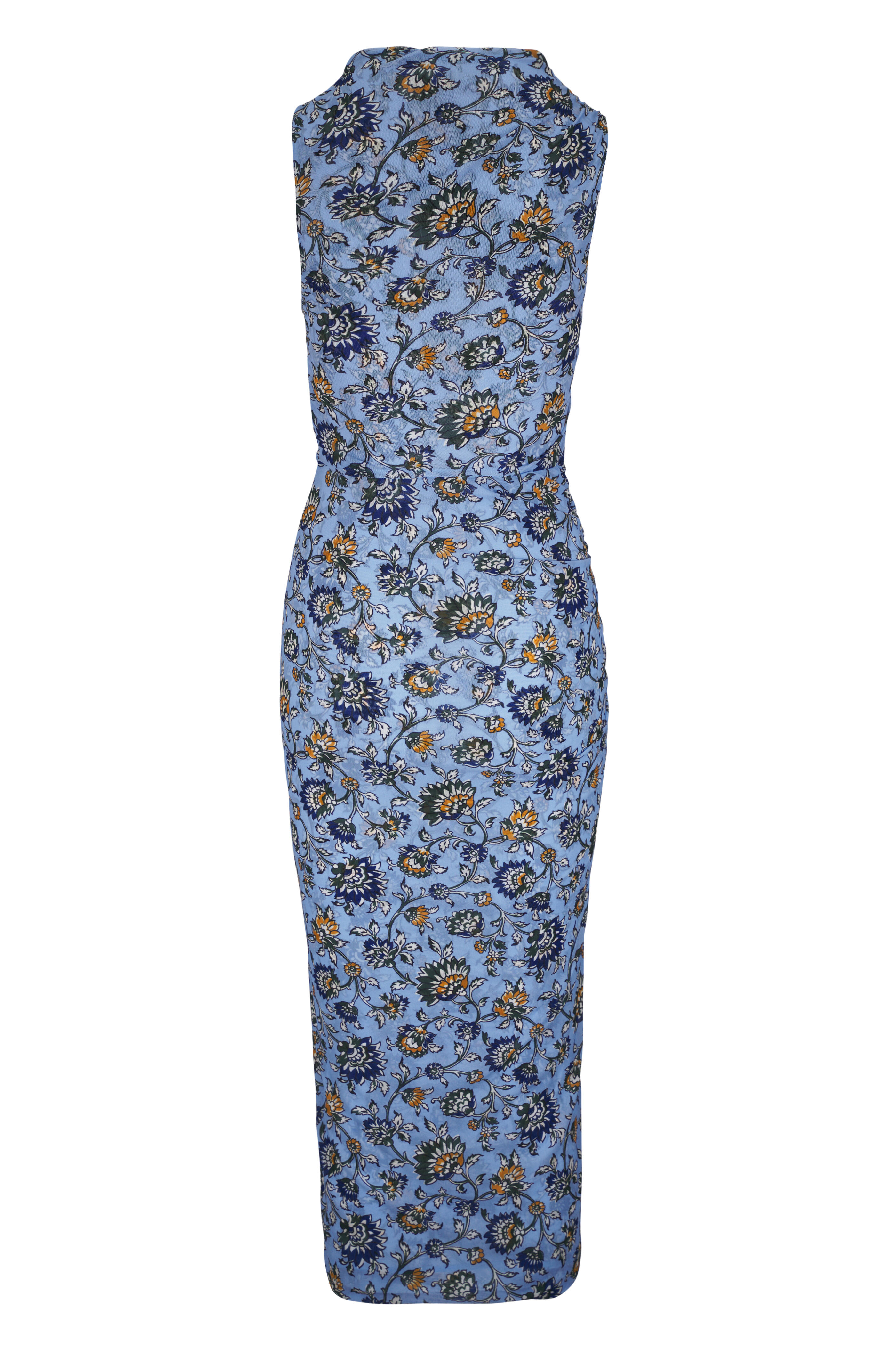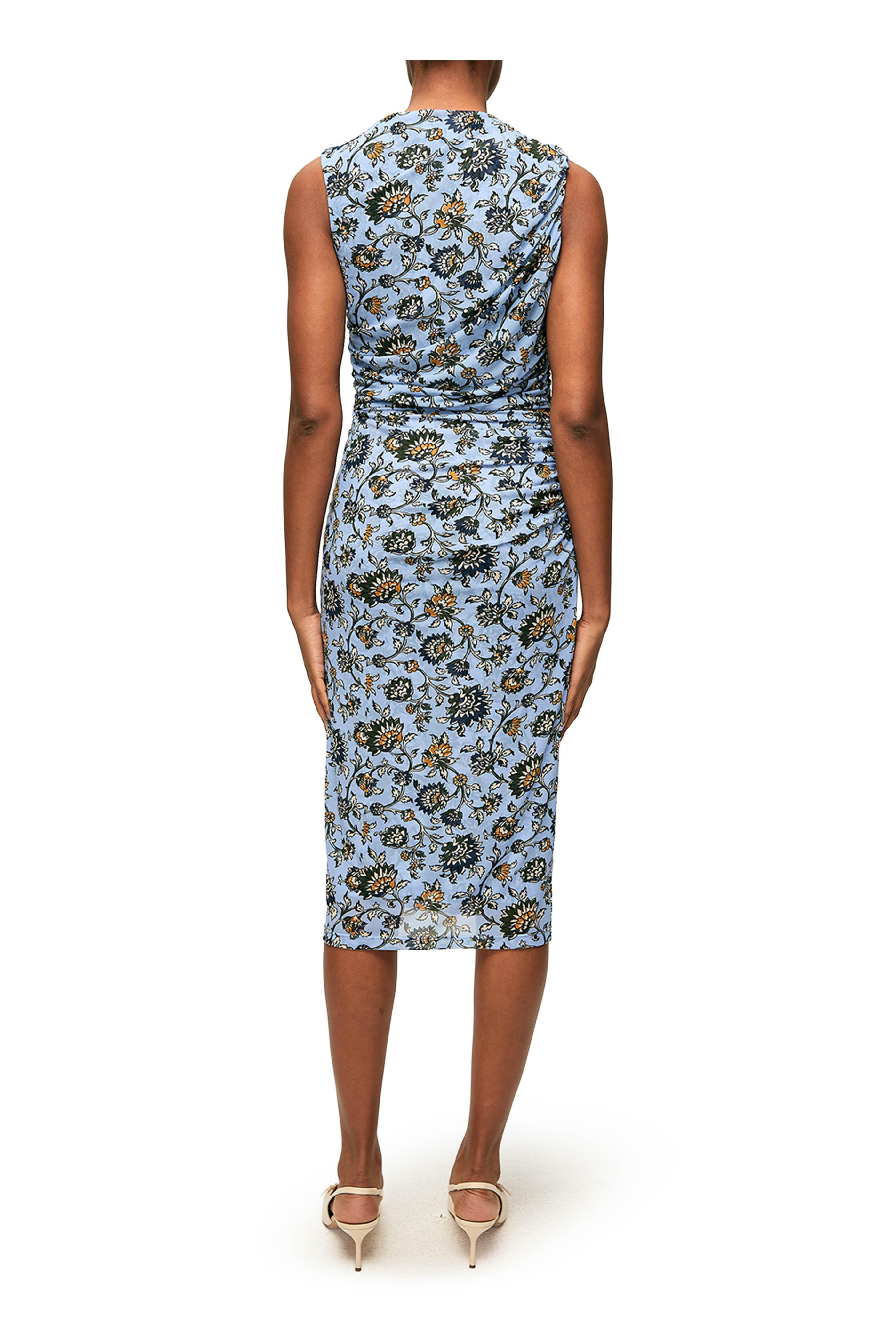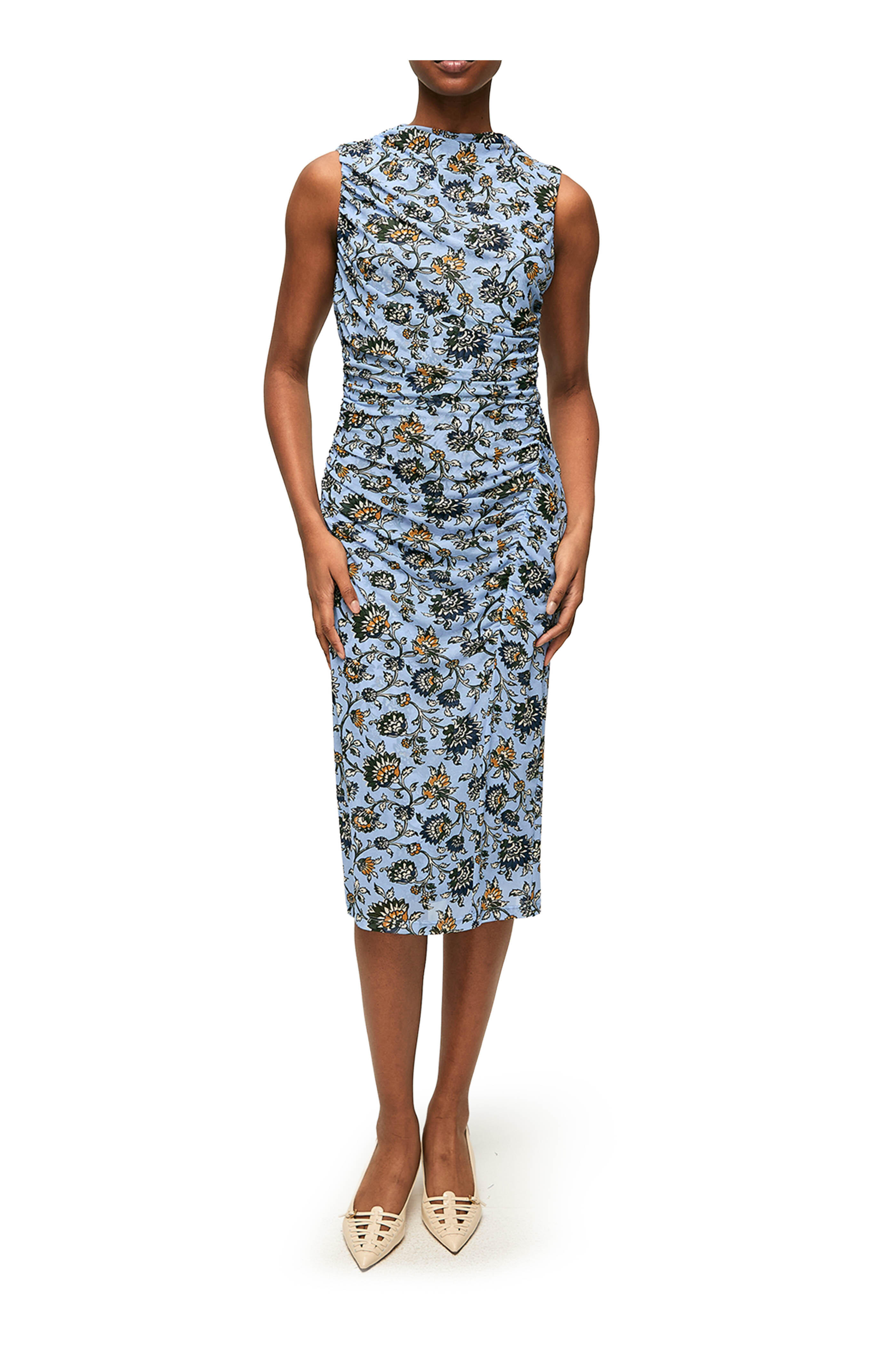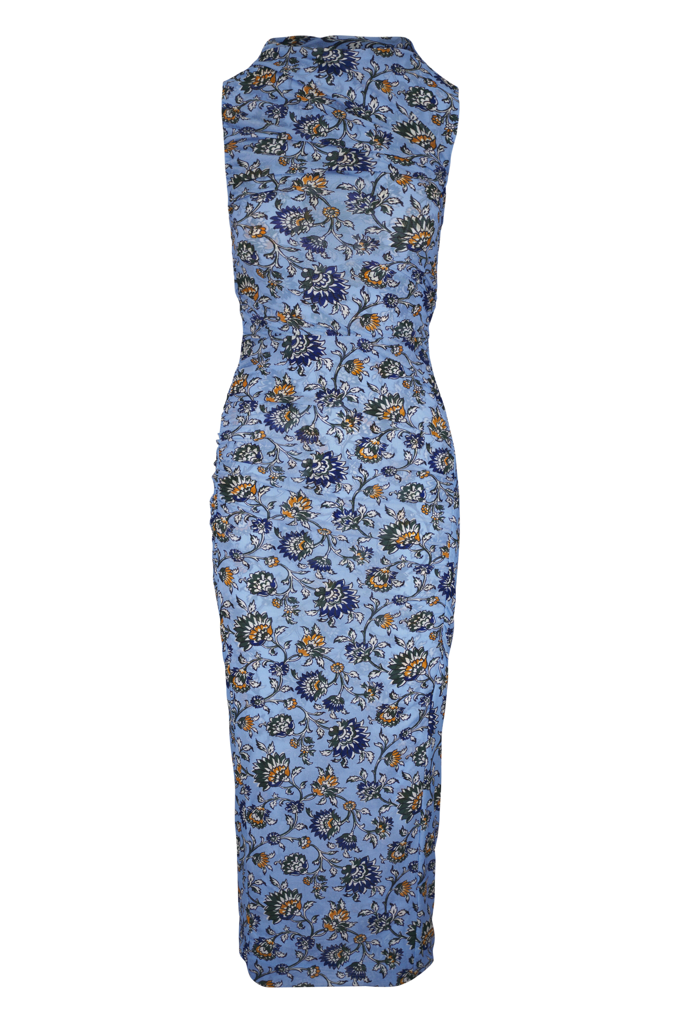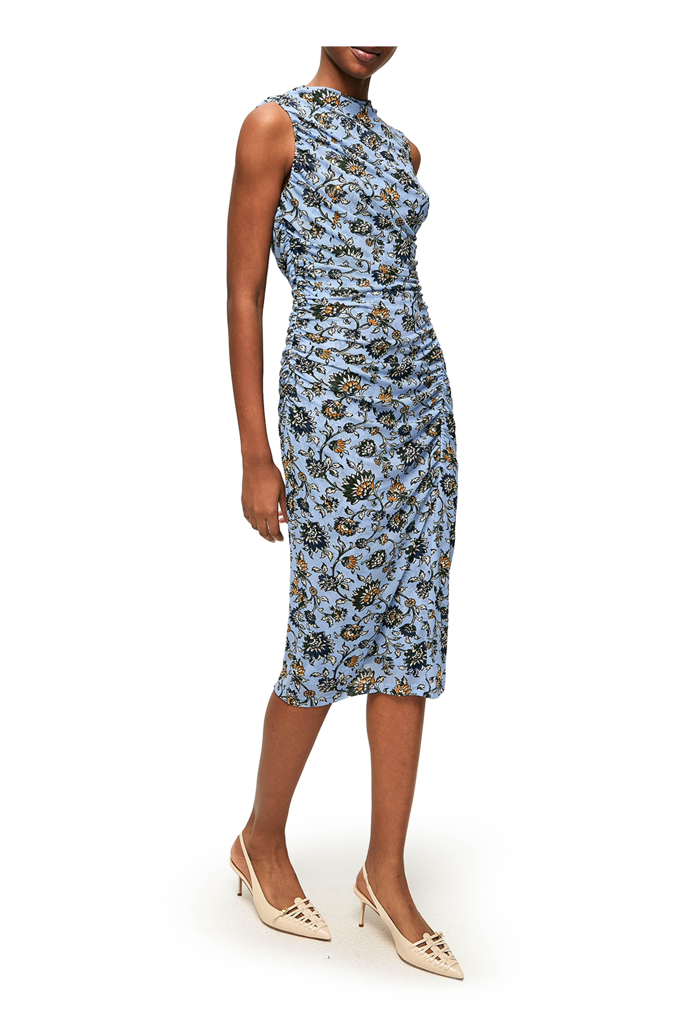 Cowl neckline. Pullover style. Ruched sides. Straight hem. Imported. Shoulder to hem 51" (size s). 95% Polyamide, 5% elastane; lined. Dry clean.