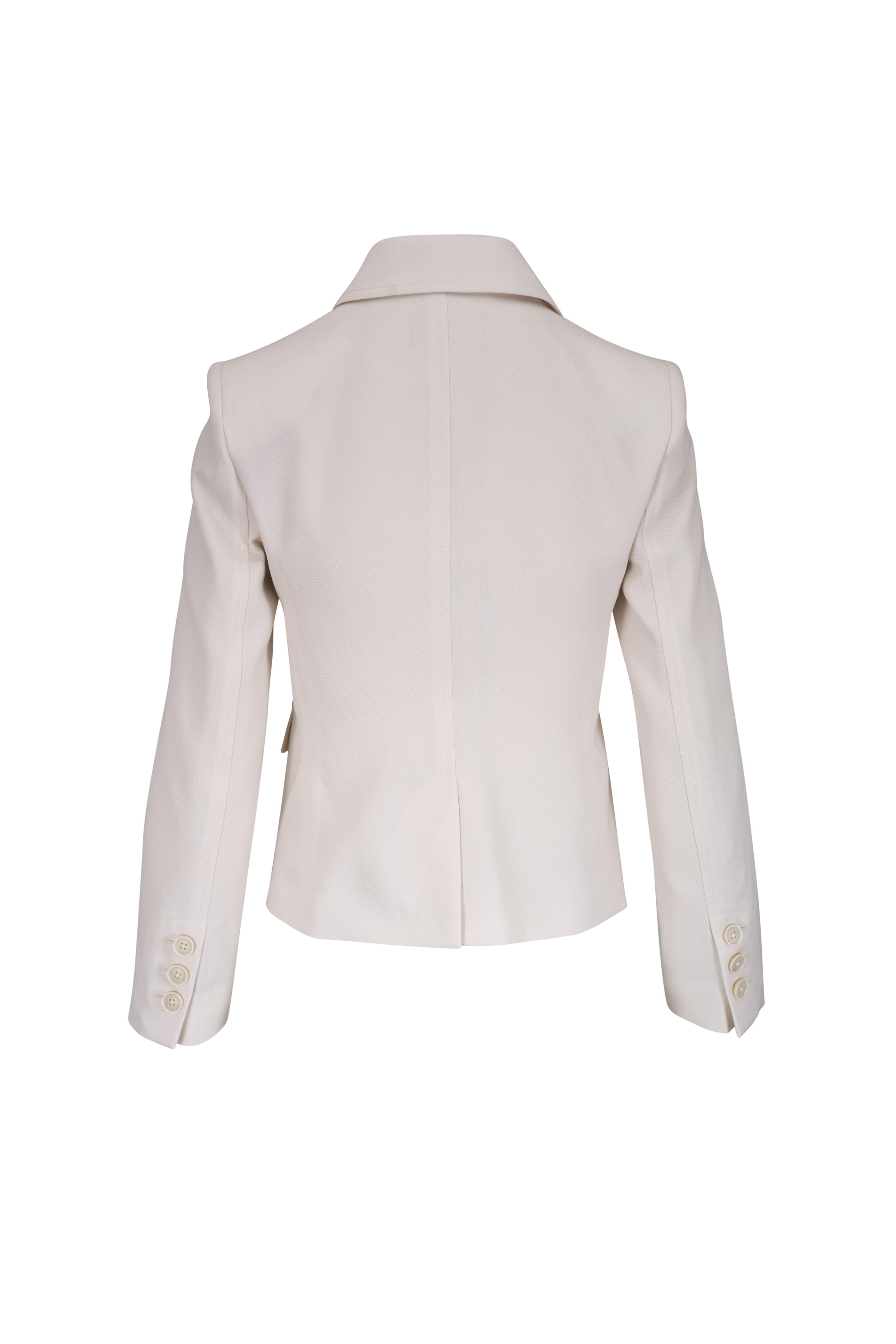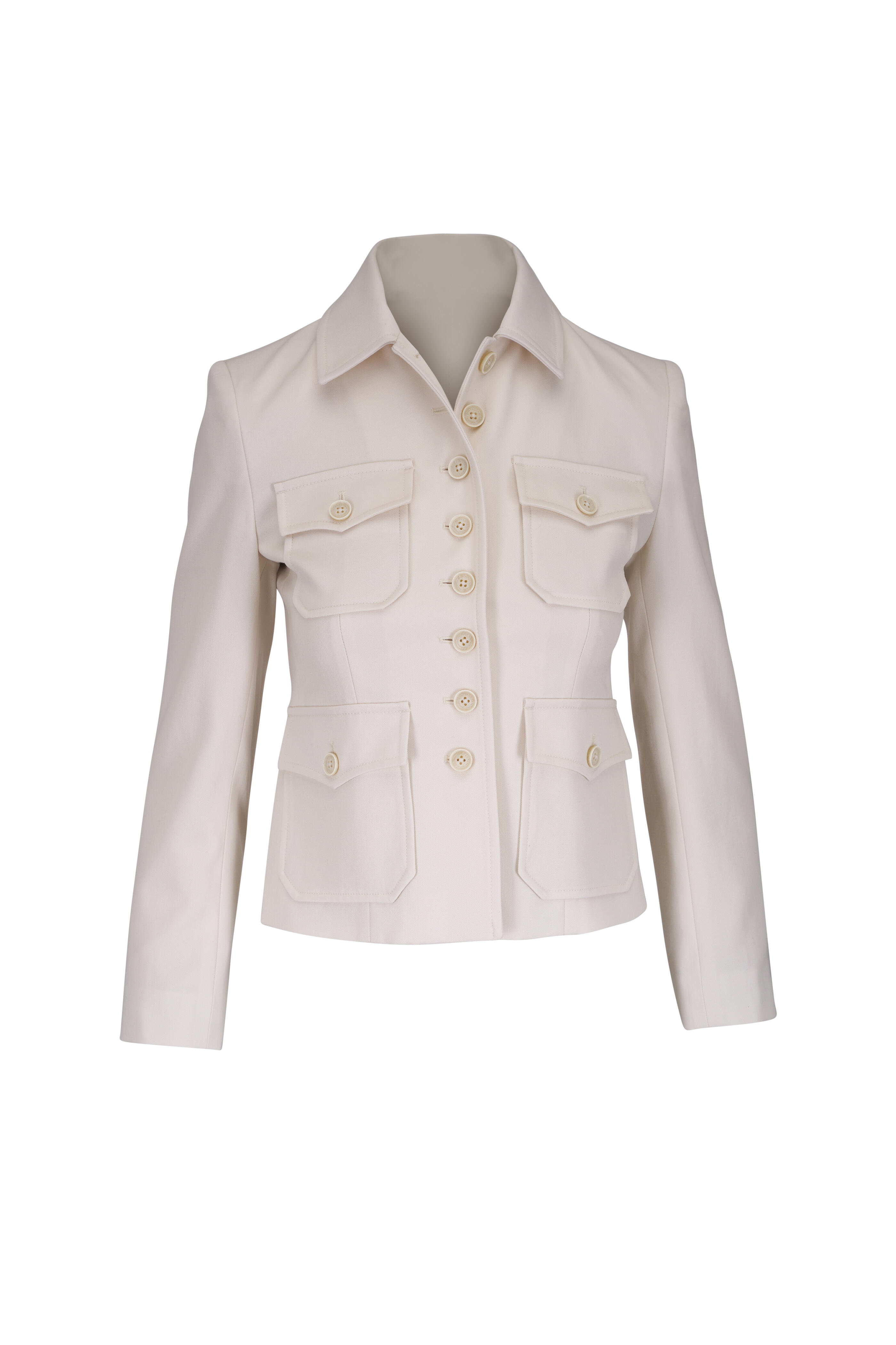 Spread collar. Front button placket. Front patch pockets with flaps; chest flap pockets. Buttoned cuffs. Soft shoulder pads. Center back seam. Imported. Shoulder to hem 20" (size 0). 100% Virgin wool; fully lined. Dry clean.