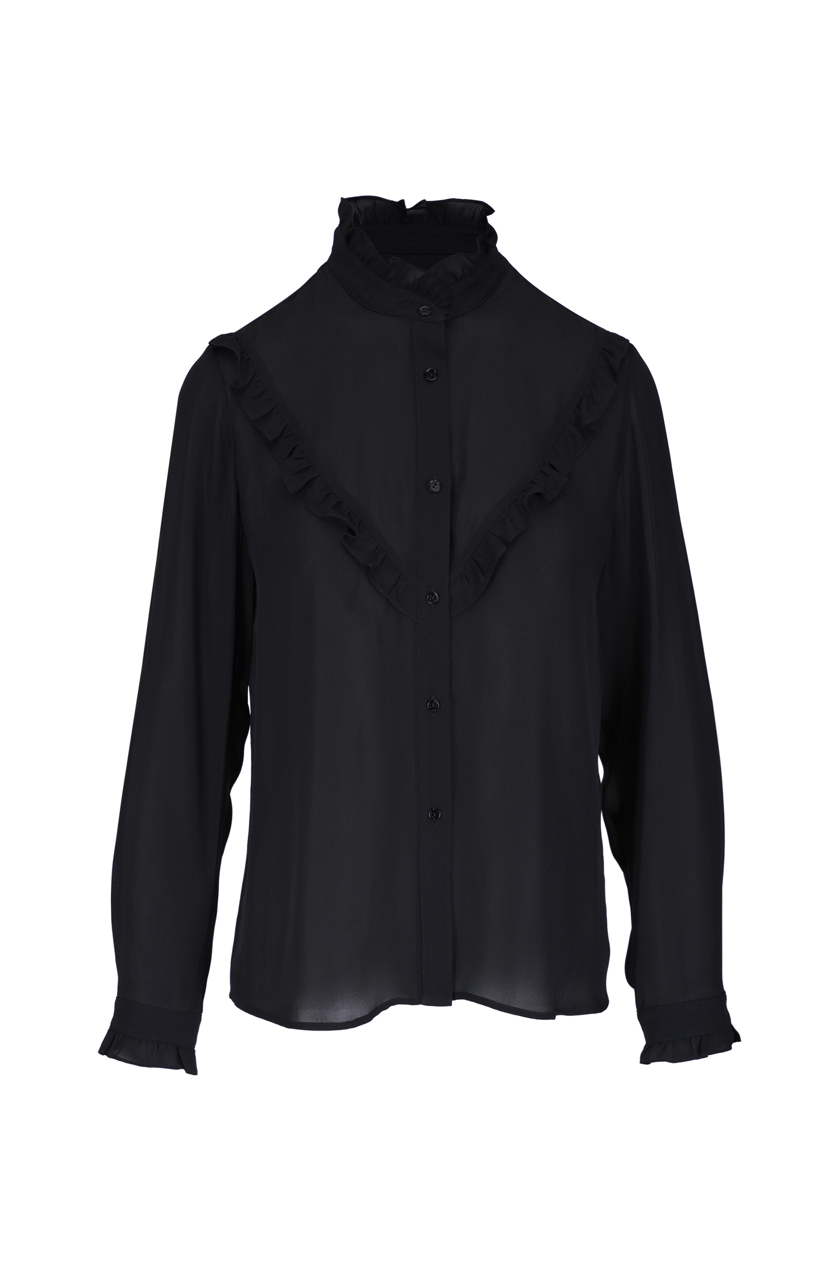 Ruffle collar. Front button placket. Single button cuffs. Made in the USA. 100% silk. Dry clean.