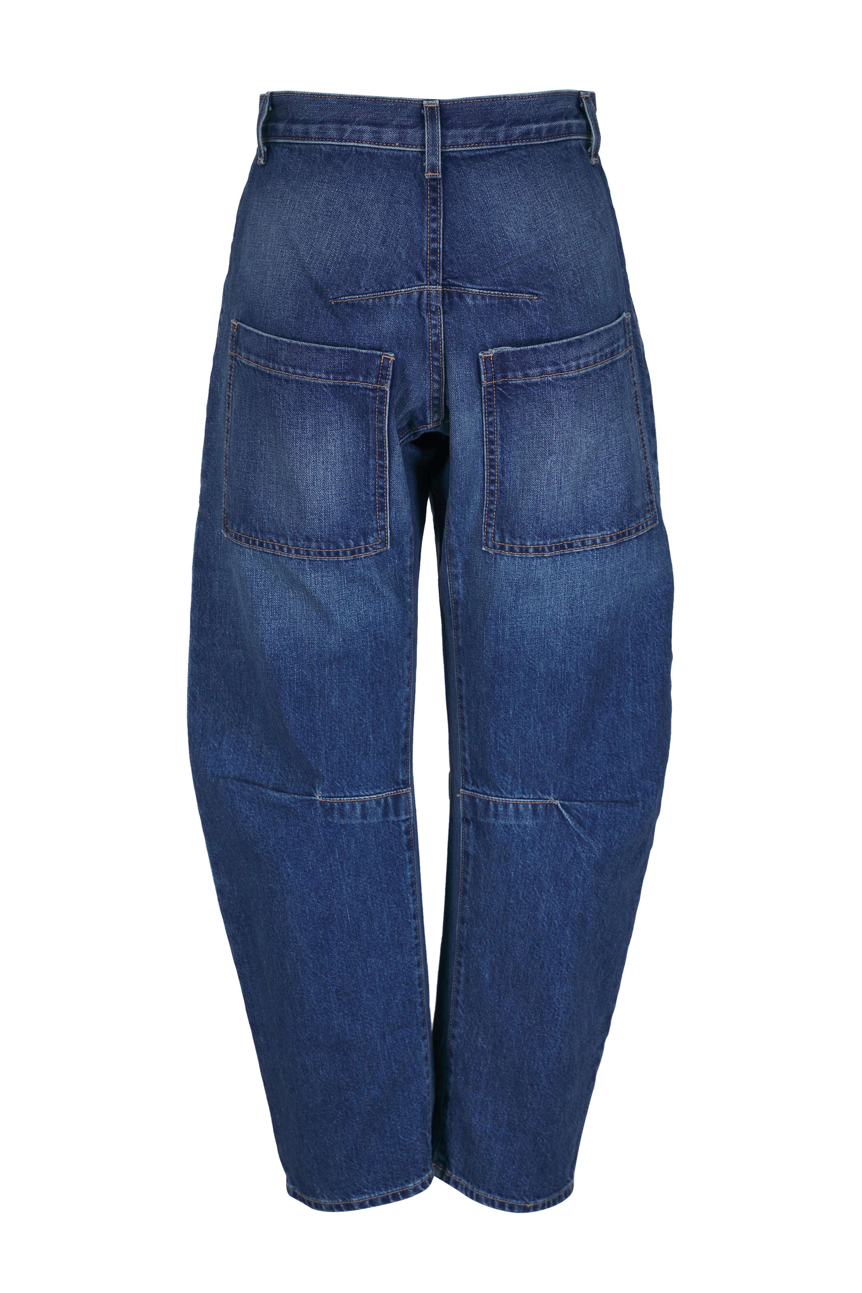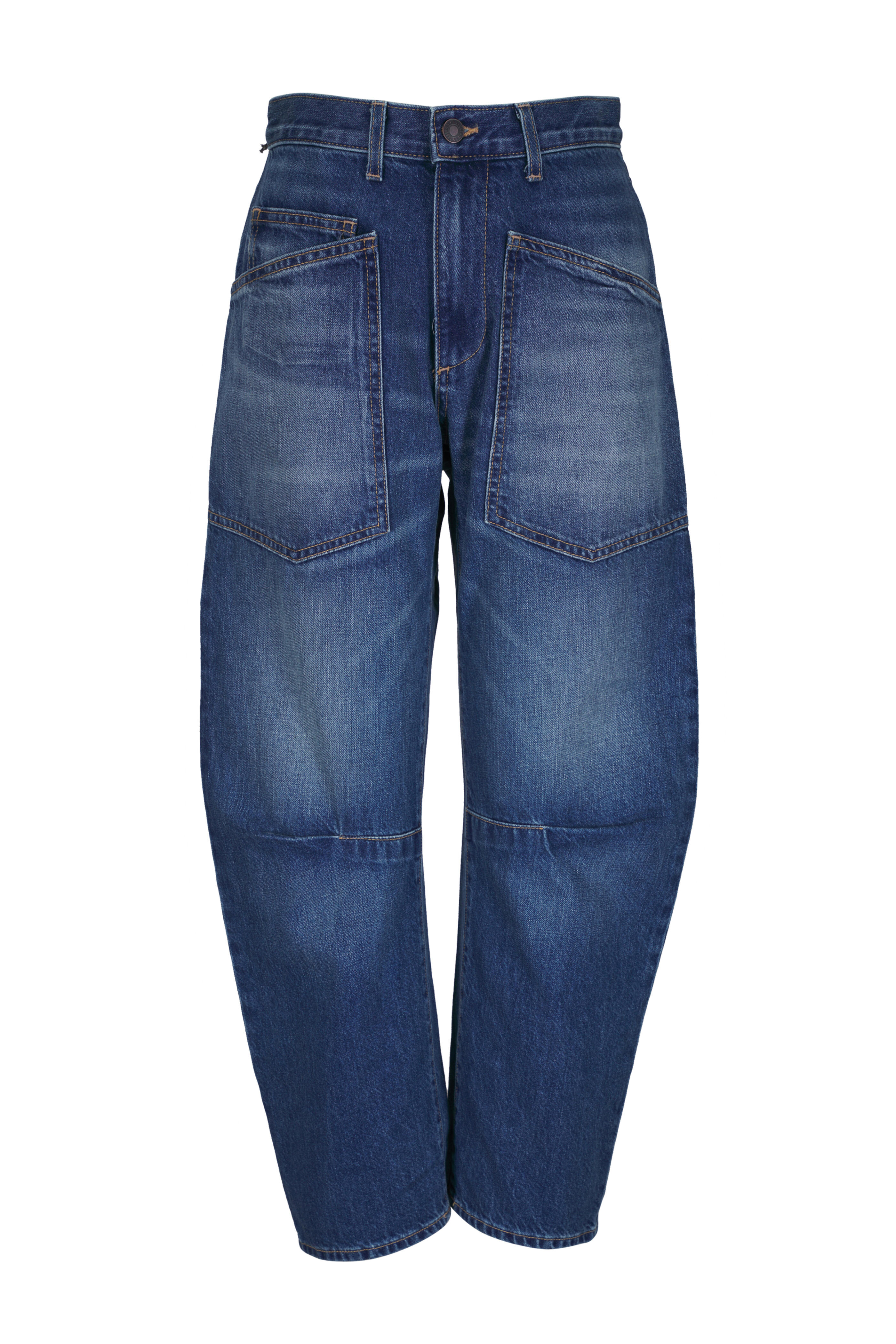 Zip fly; button closure. Banded waist; belt loops. Front and back patch pockets; ticket pocket. Made in the USA. Inseam 26" (size 25). 100% Cotton. Machine wash cold separate.