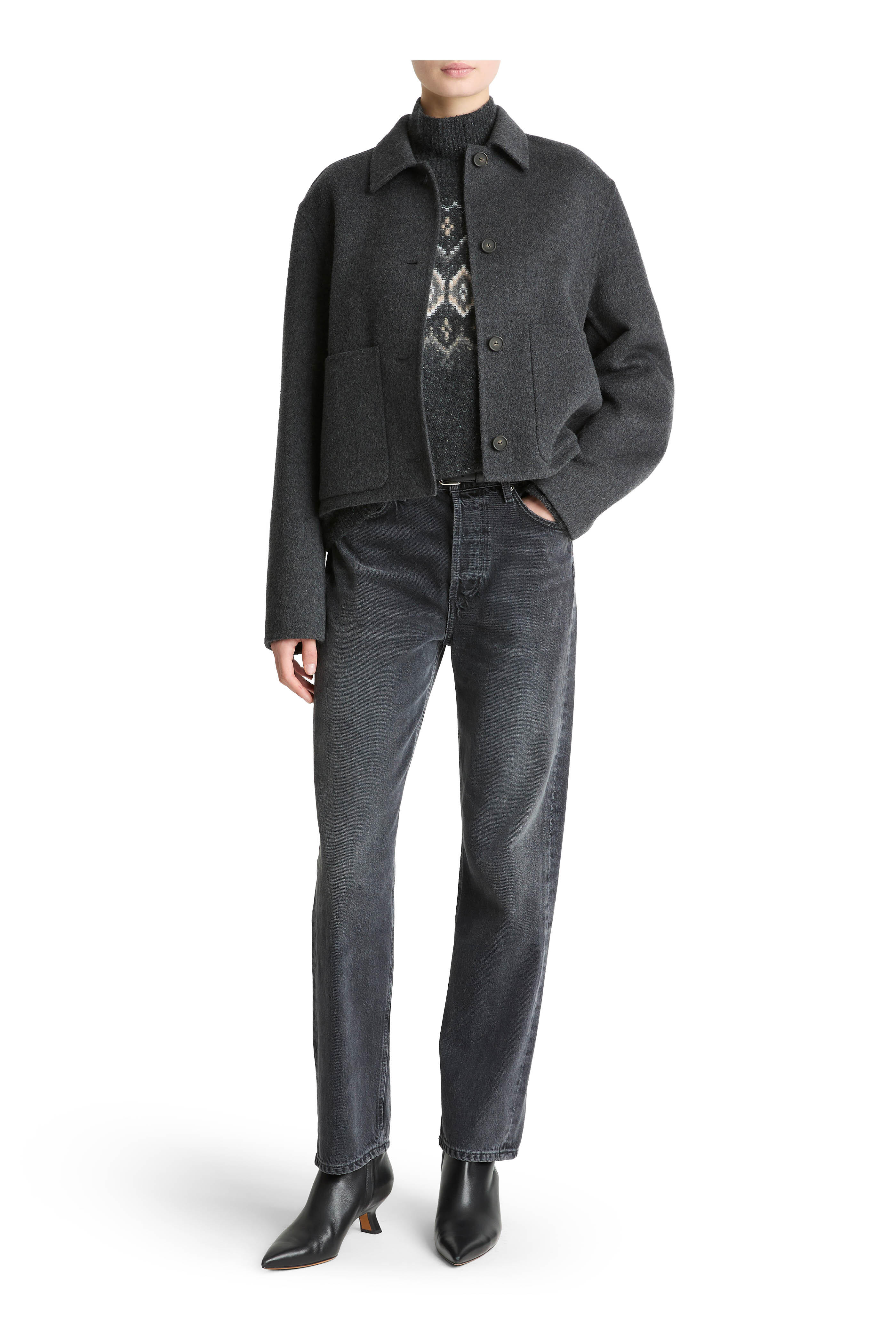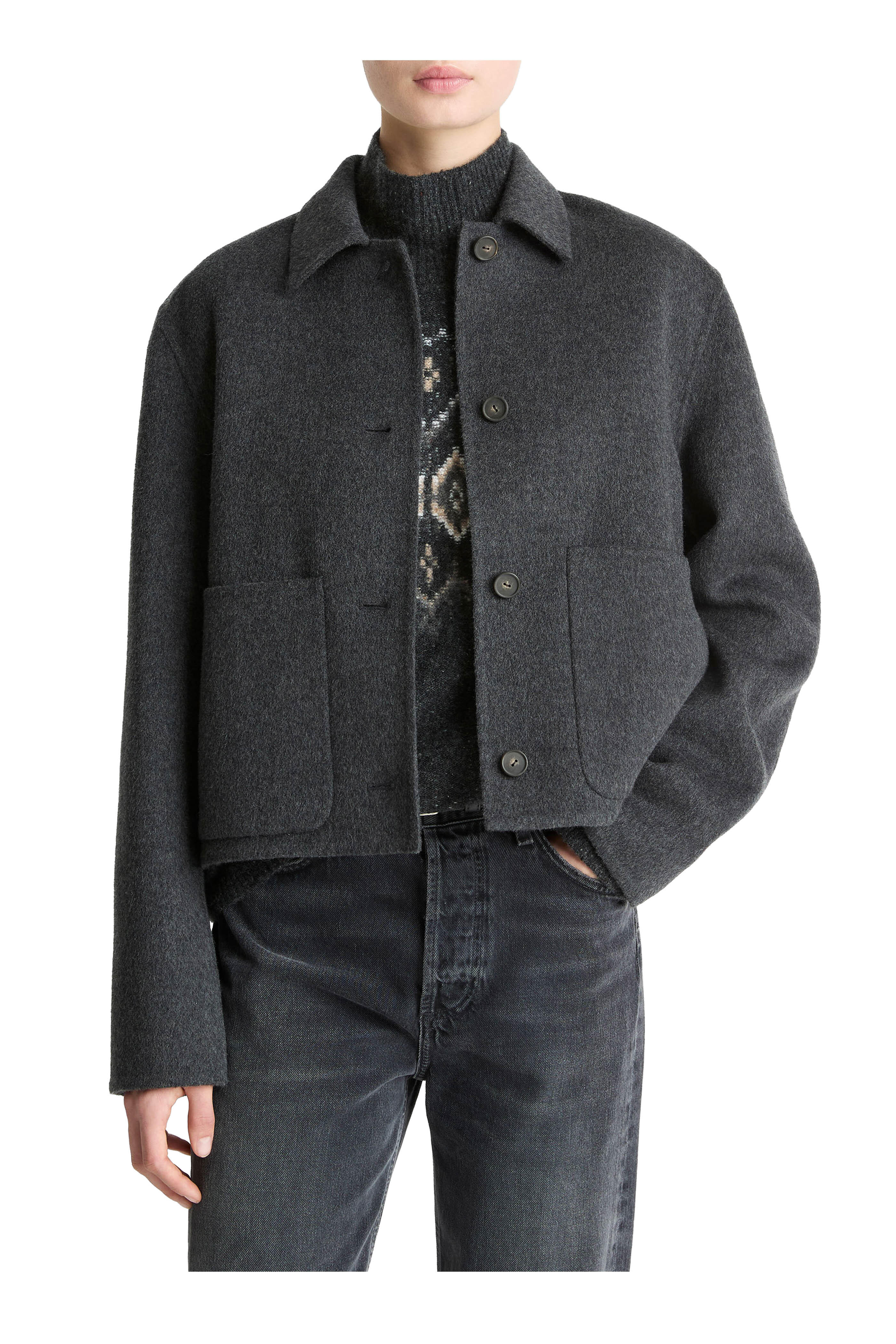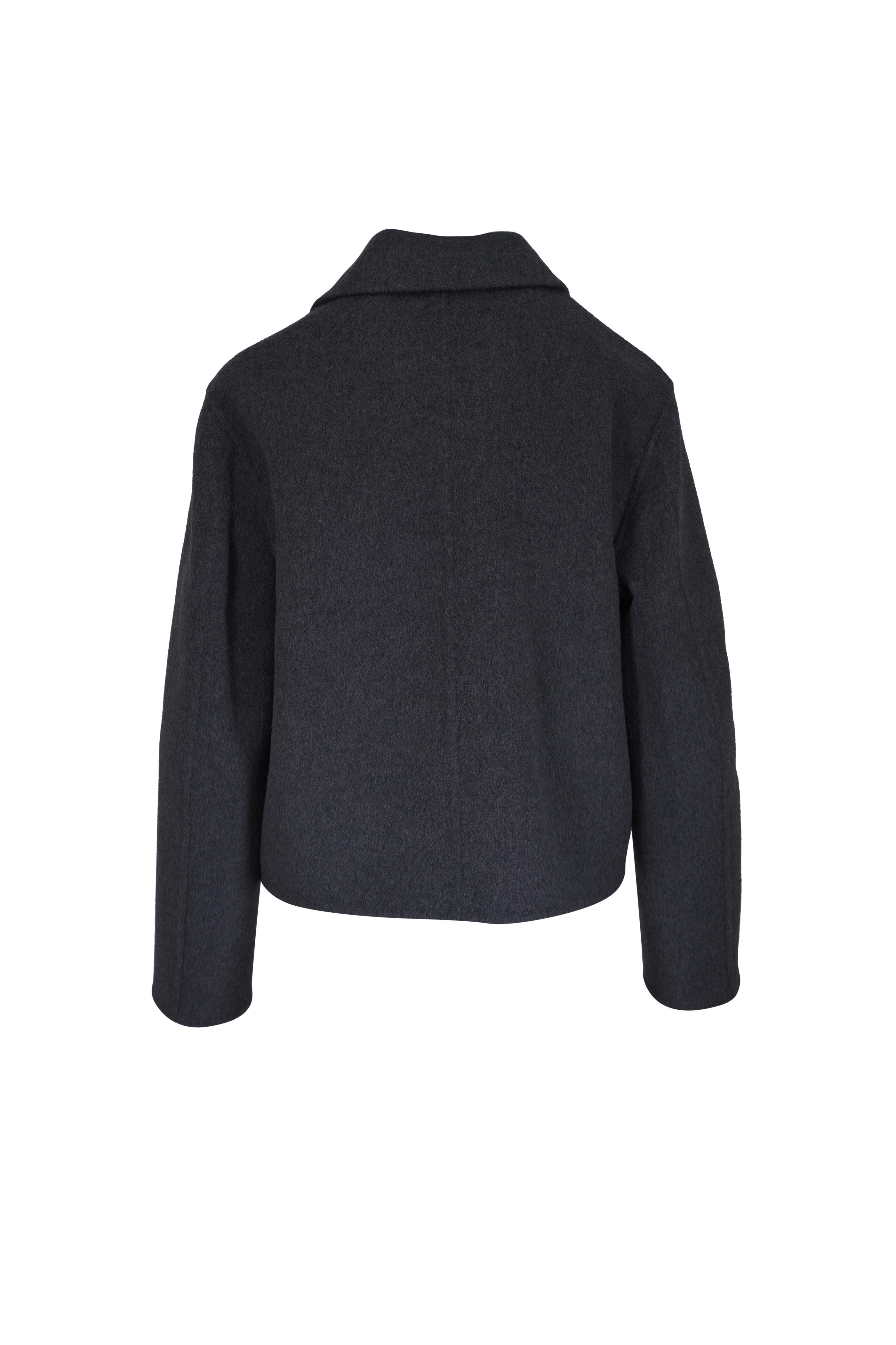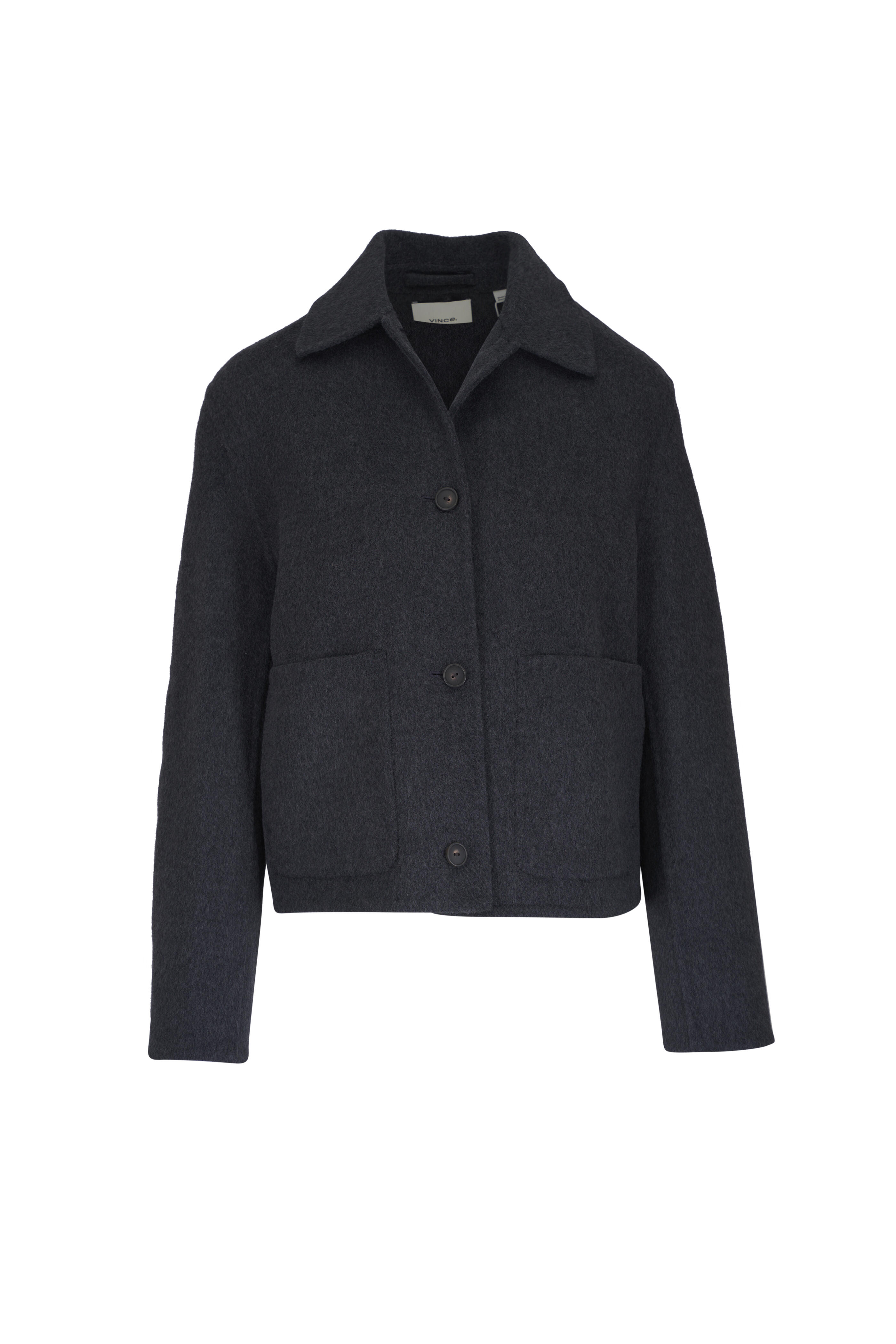 Spread collar. Front button placket. Front patch pockets. Imported. 75% wool, 20% nylon, 5% cashmere. Dry clean.