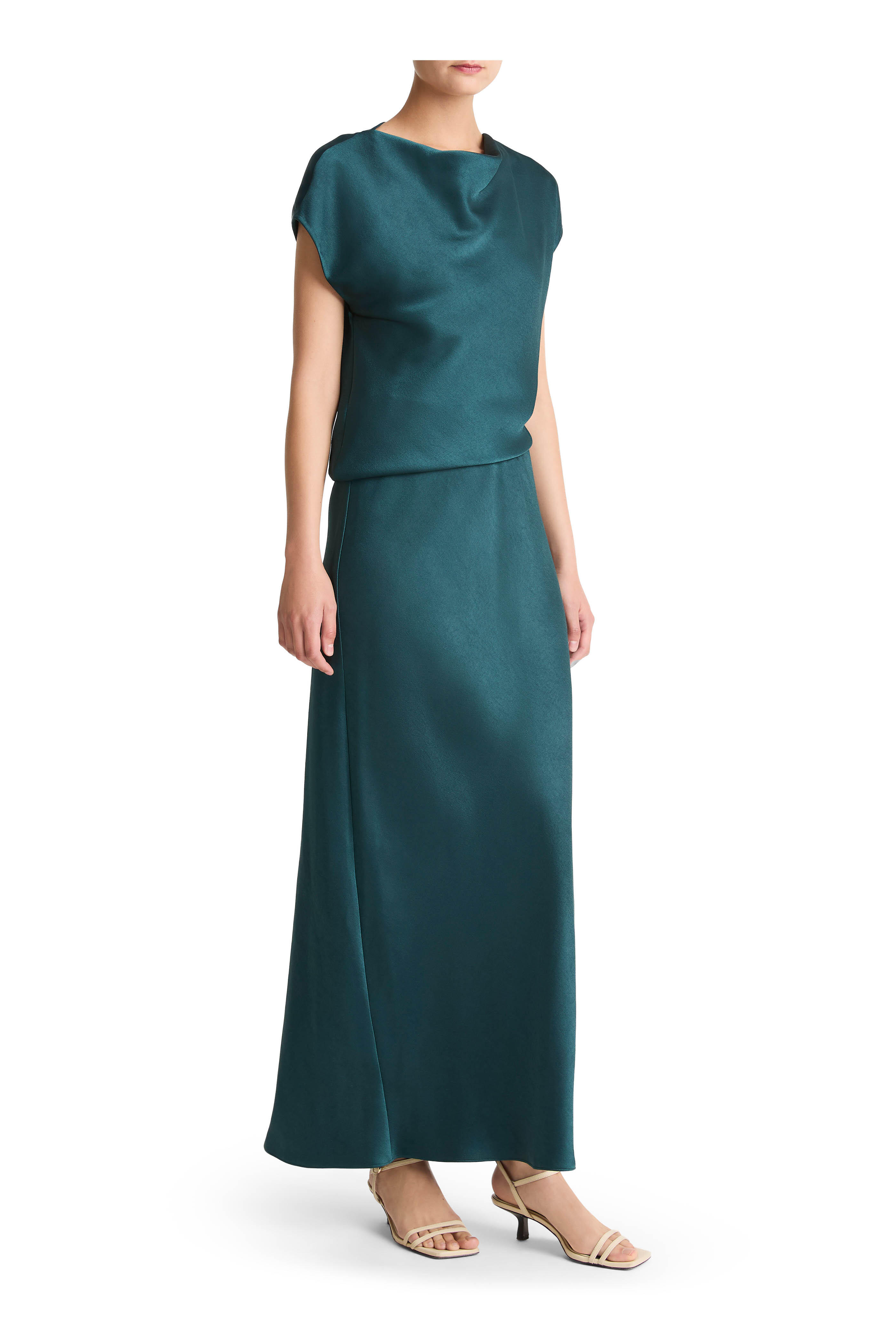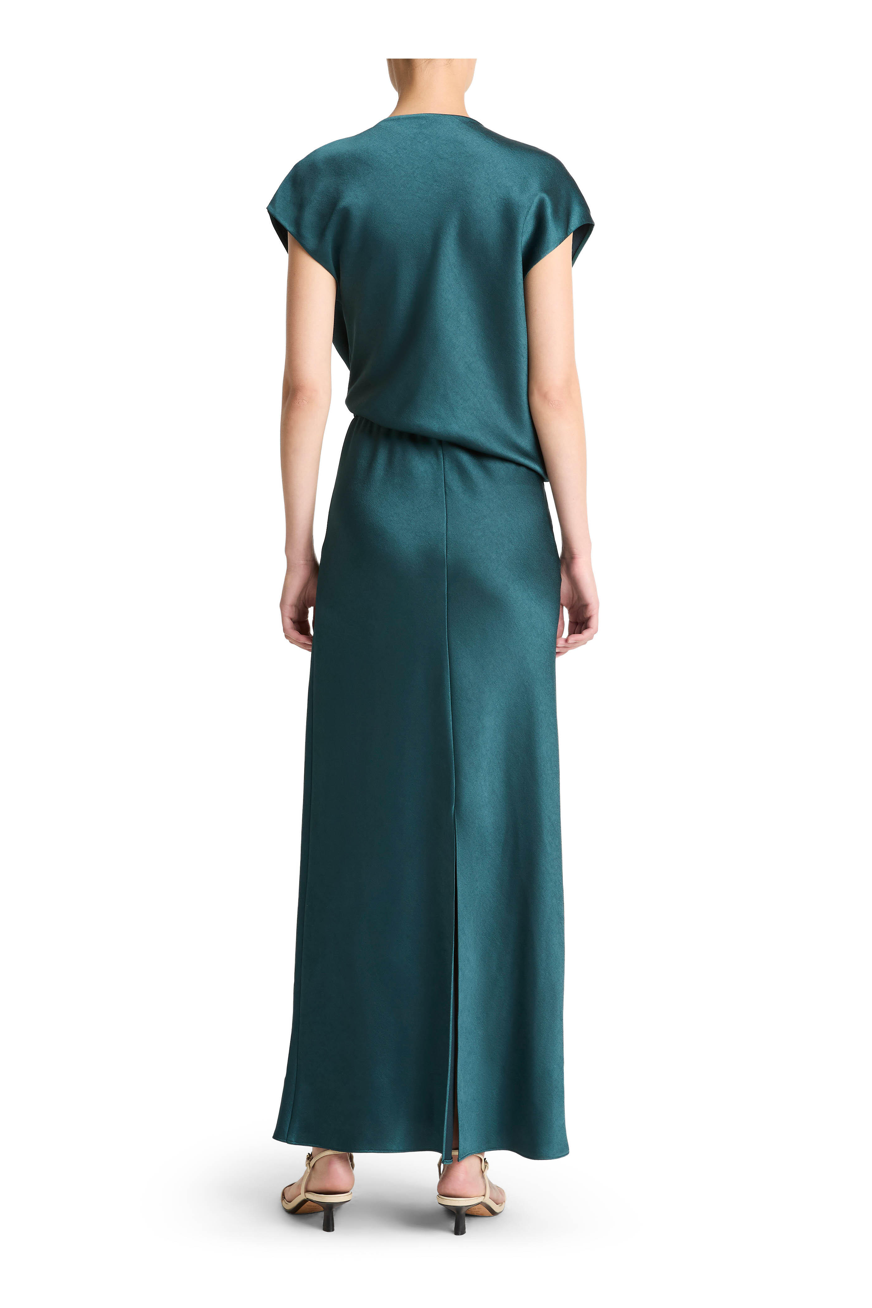 Cowl neckline. Elasticized waistband. Slip-on style. Back vent. Imported. Approximately 56" shoulder to hem. 100% polyester. Dry clean.