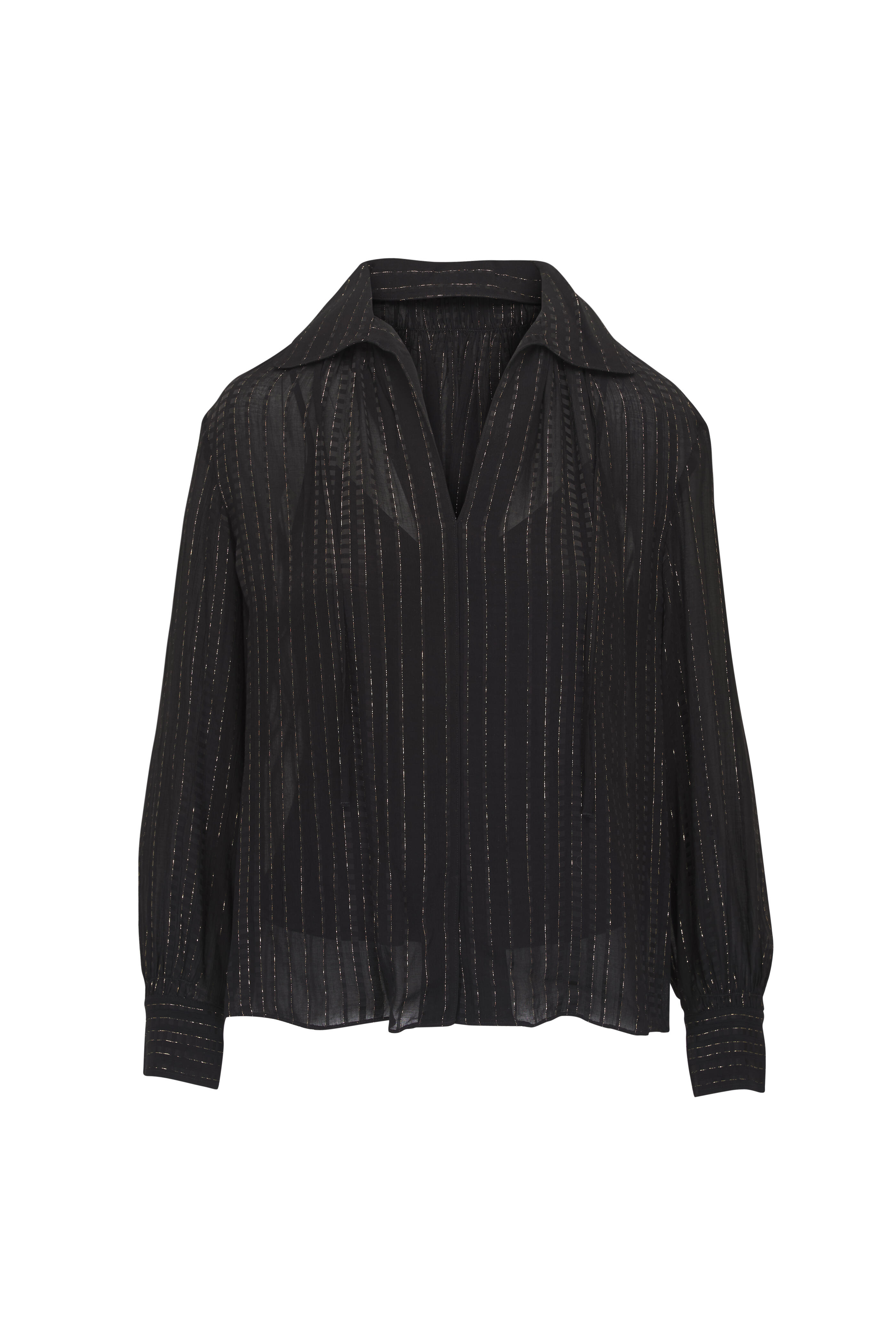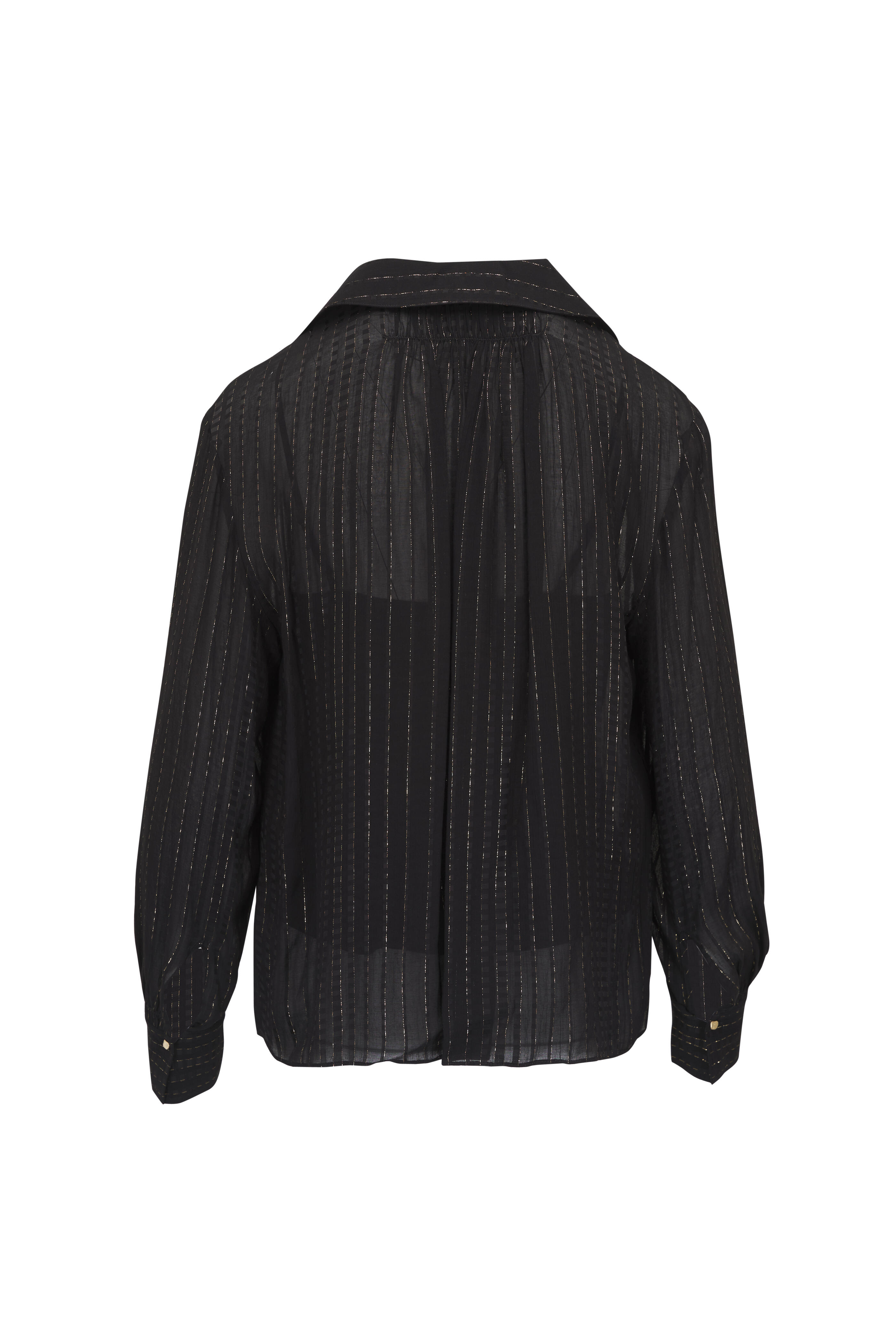 Spread collar; self-ties at neck. Slip on style. Hammered metal single button cuffs. Straight hem. Imported. Shoulder to hem 23" (size xs). 99% Viscose, 1% metallic; lined. Hand wash.