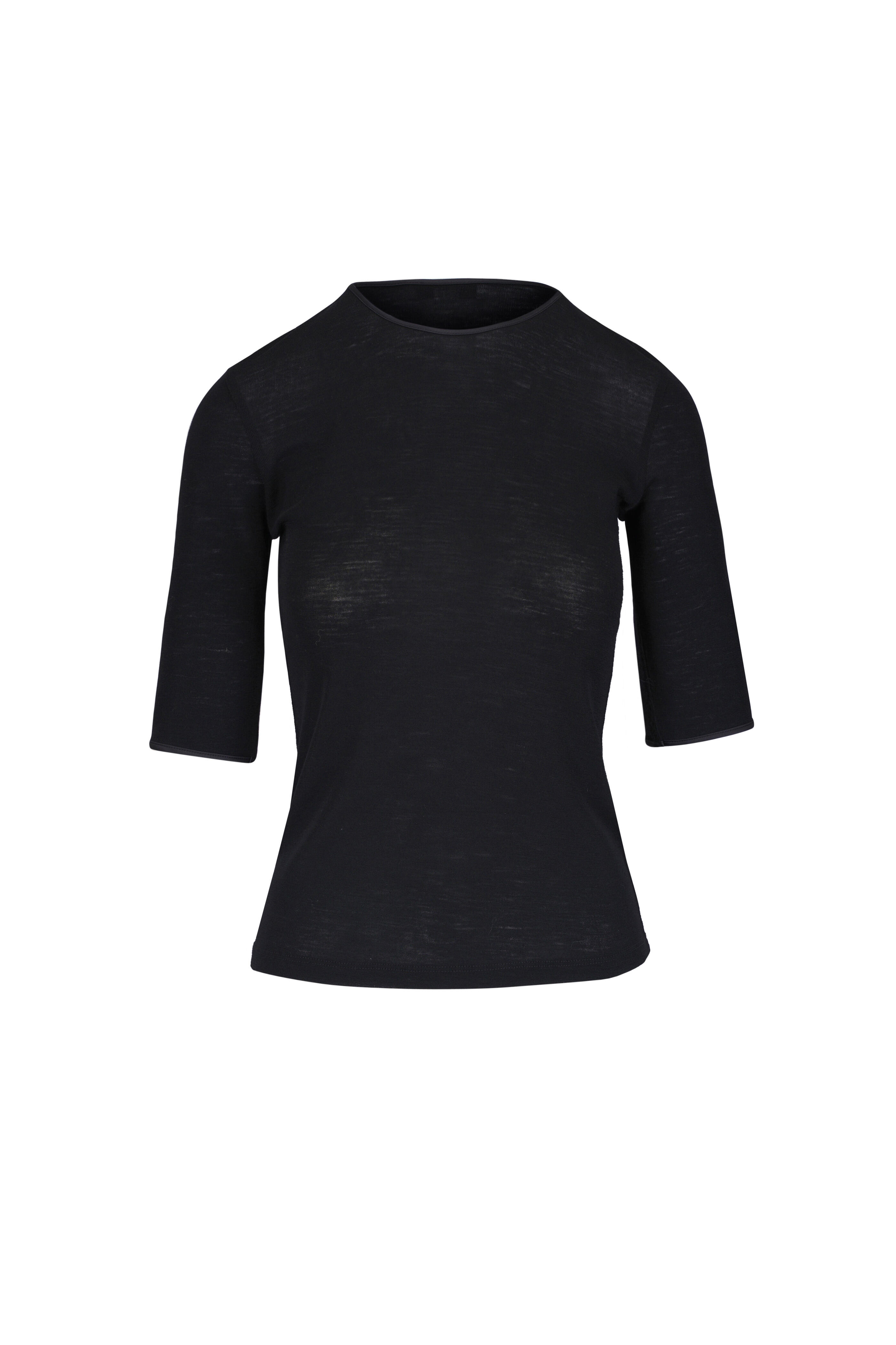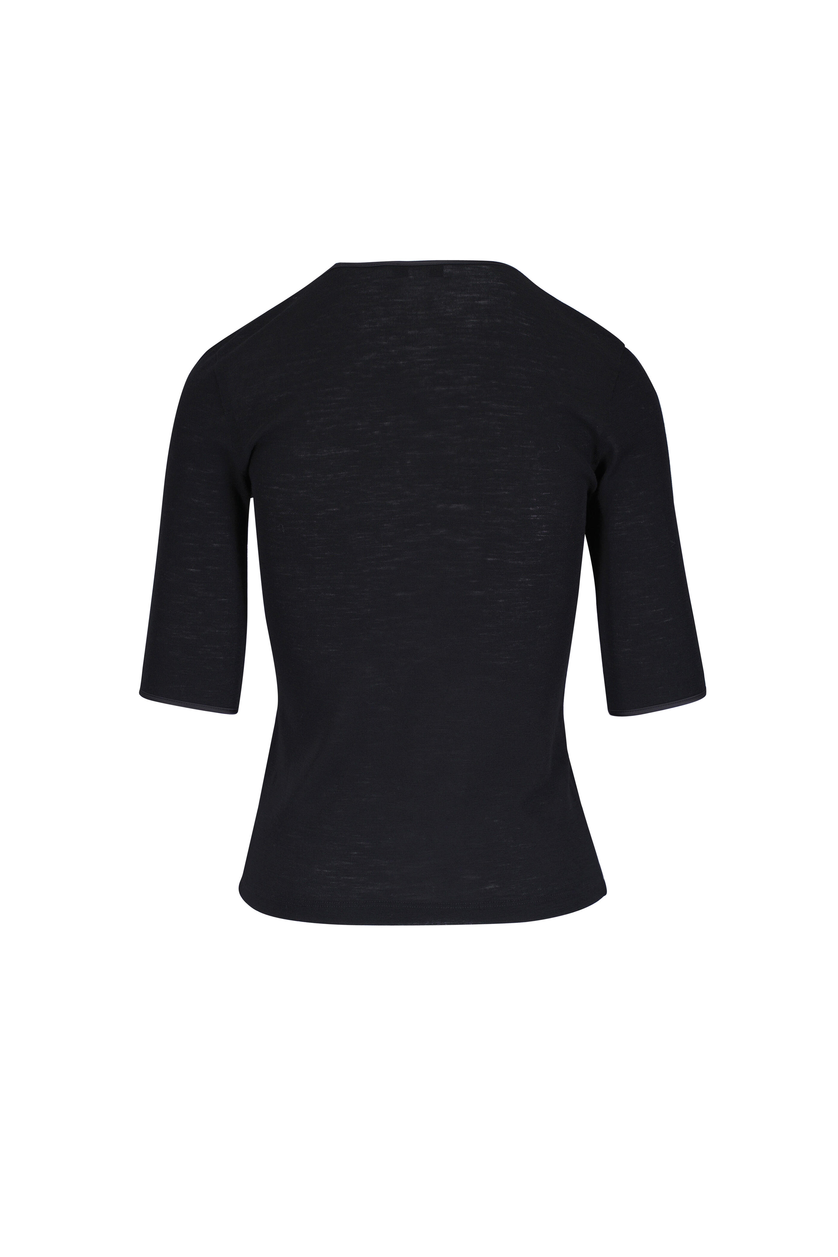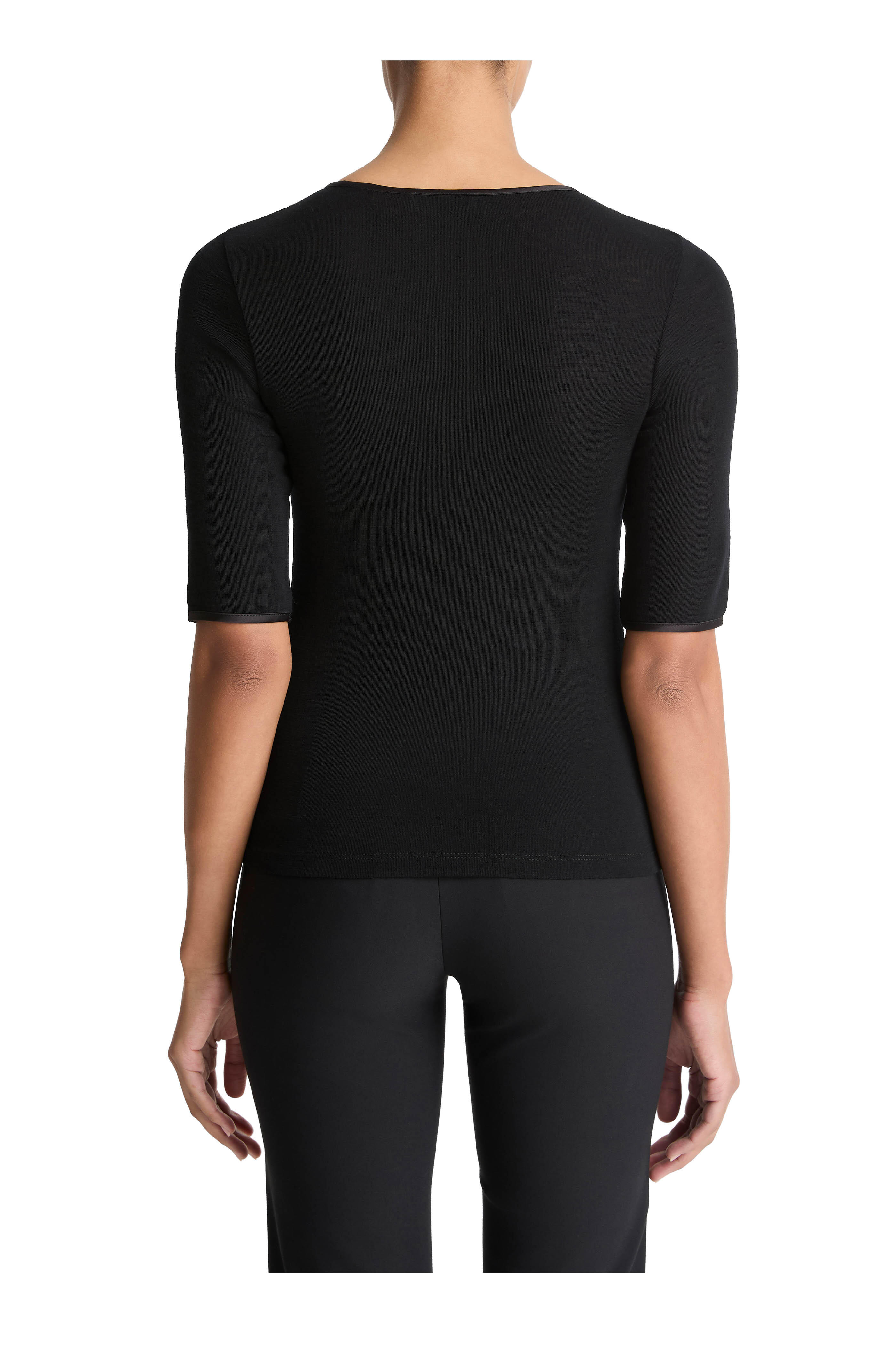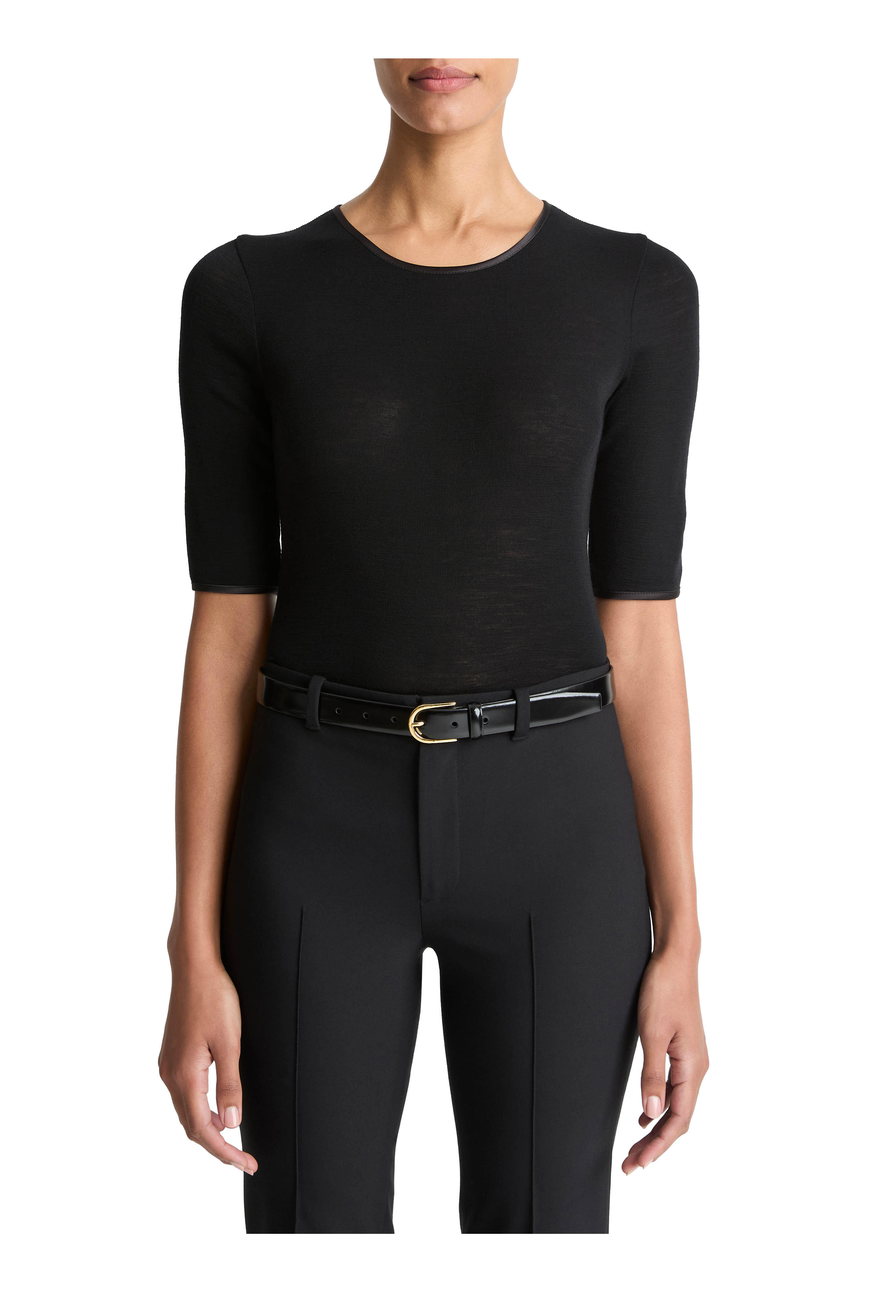 Crew neckline. Tonal satin trim detailing. Imported. 23.5" length. 100% wool. Hand wash.
