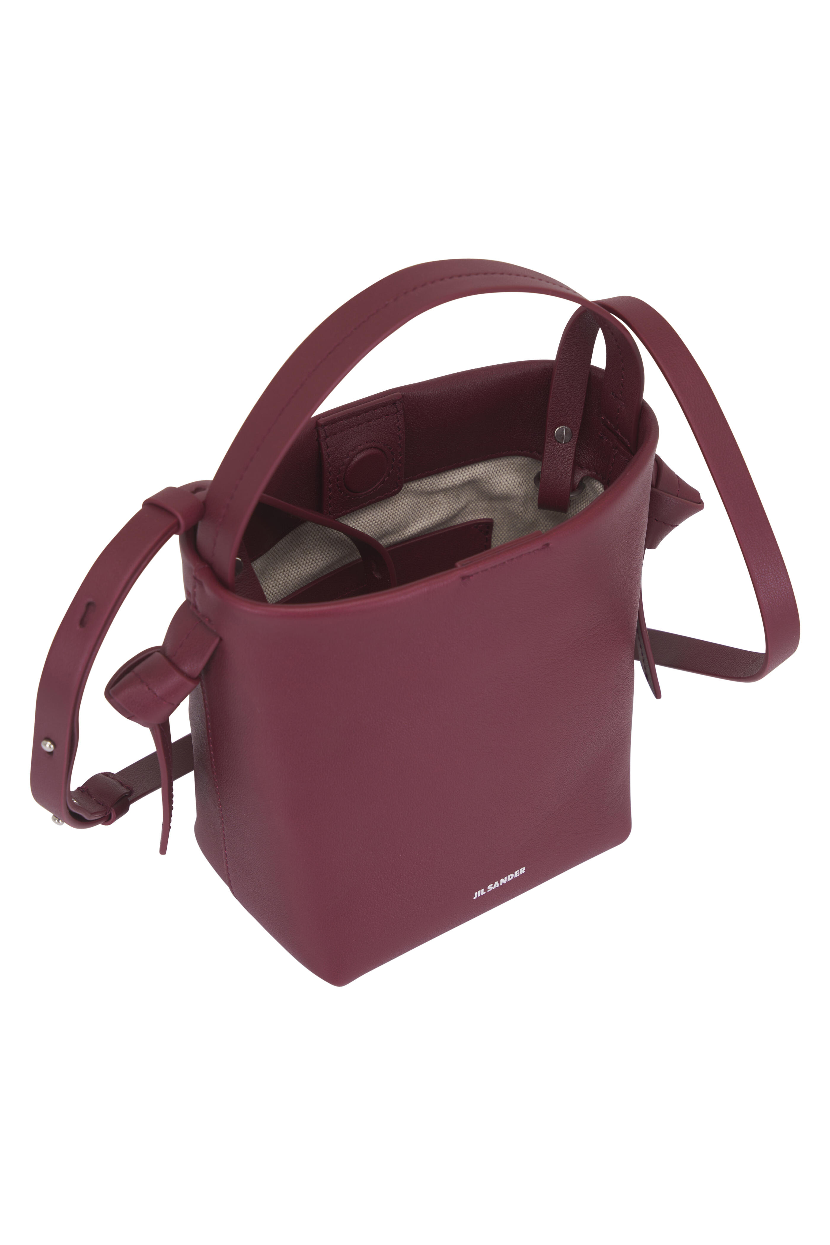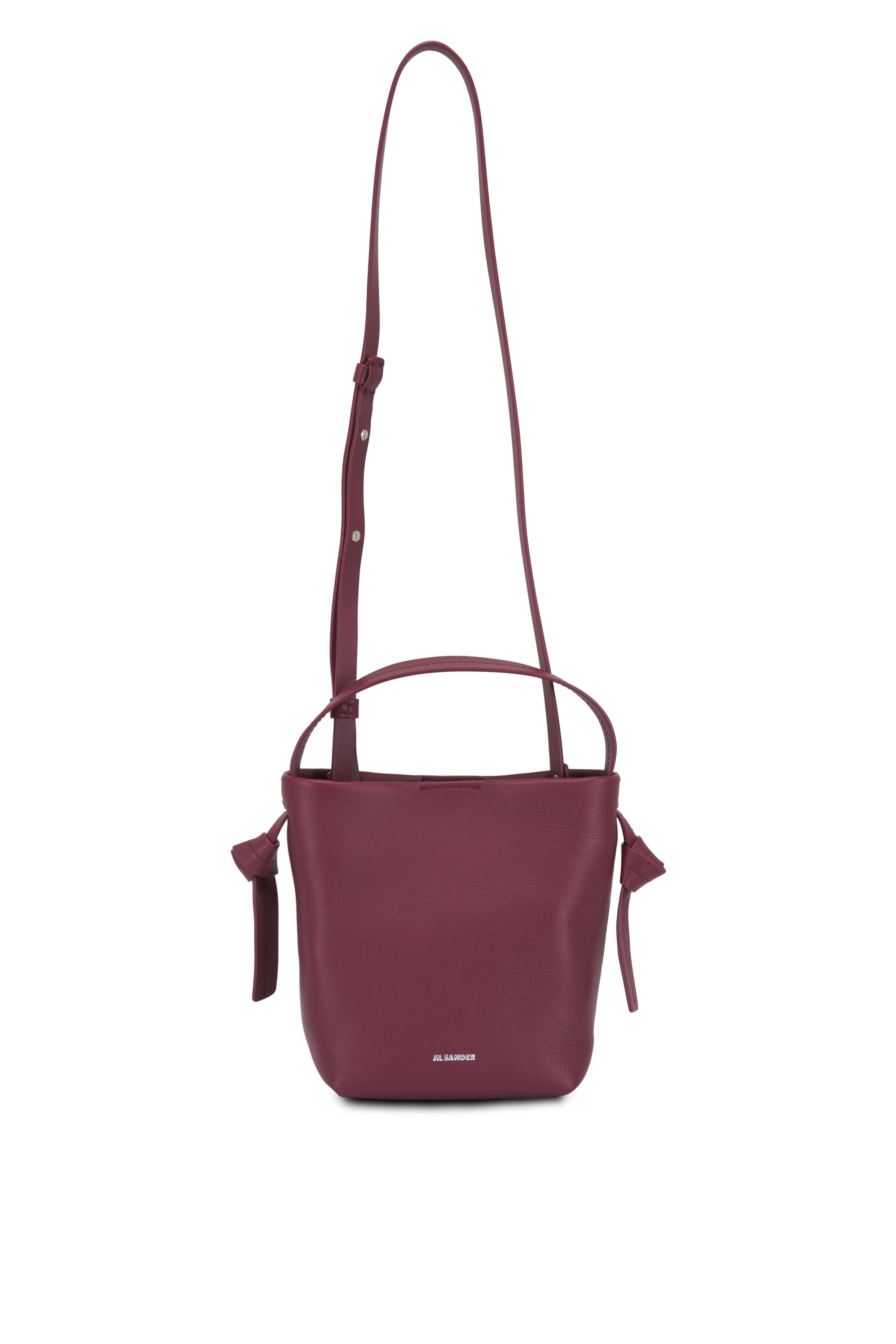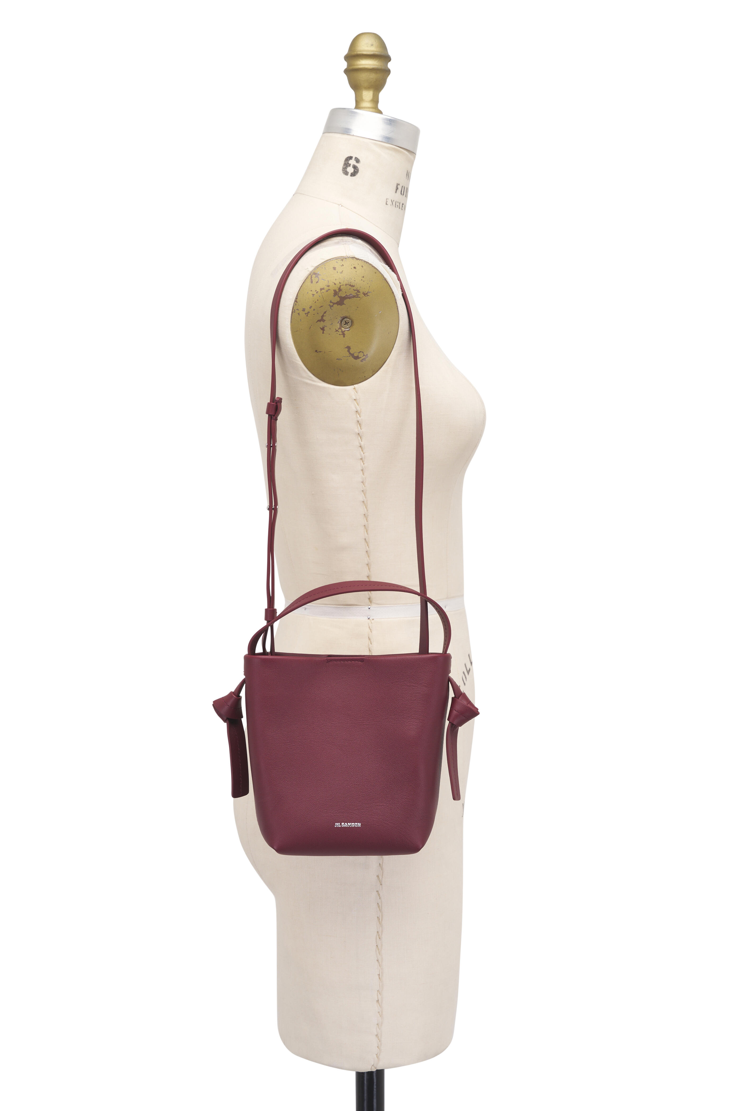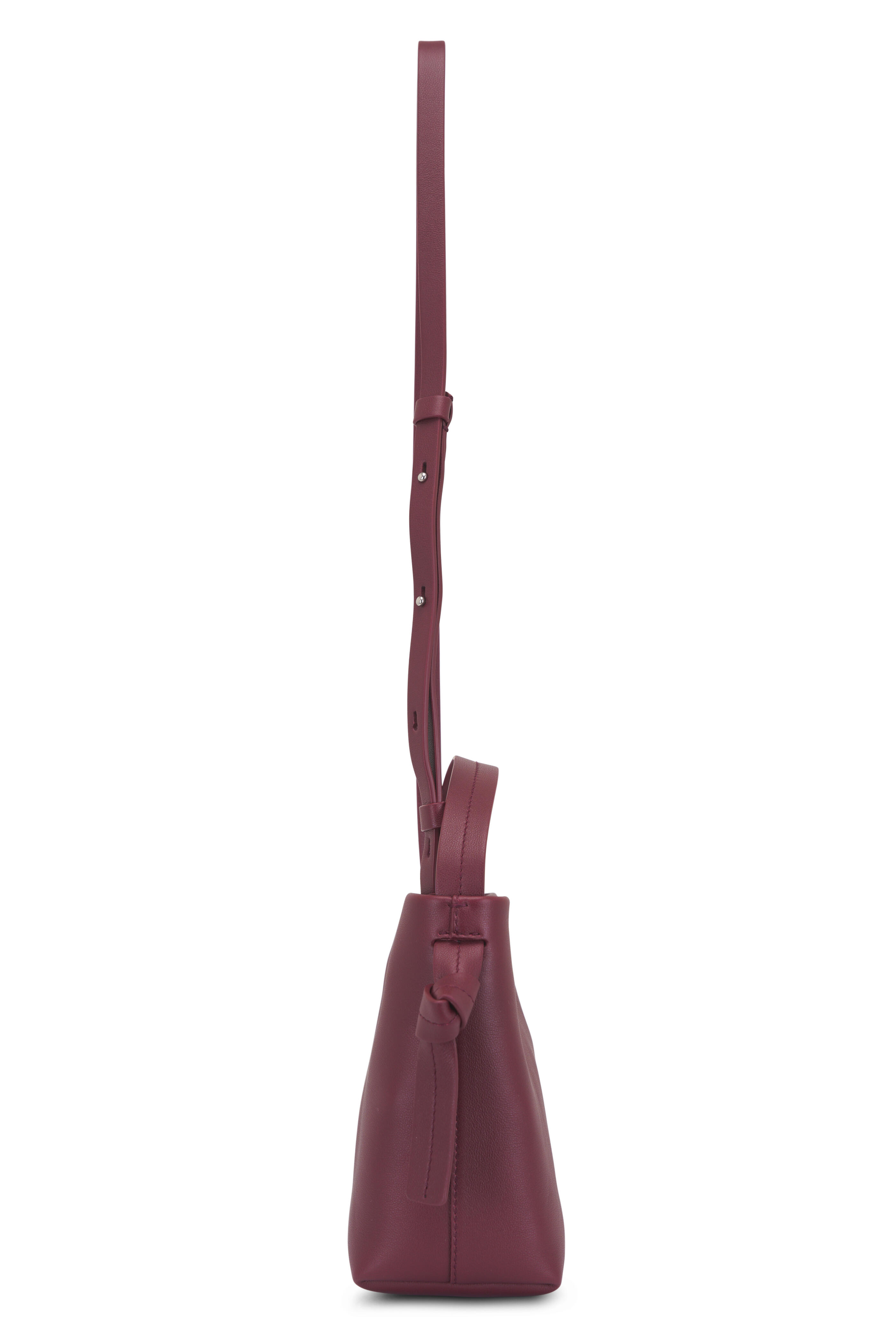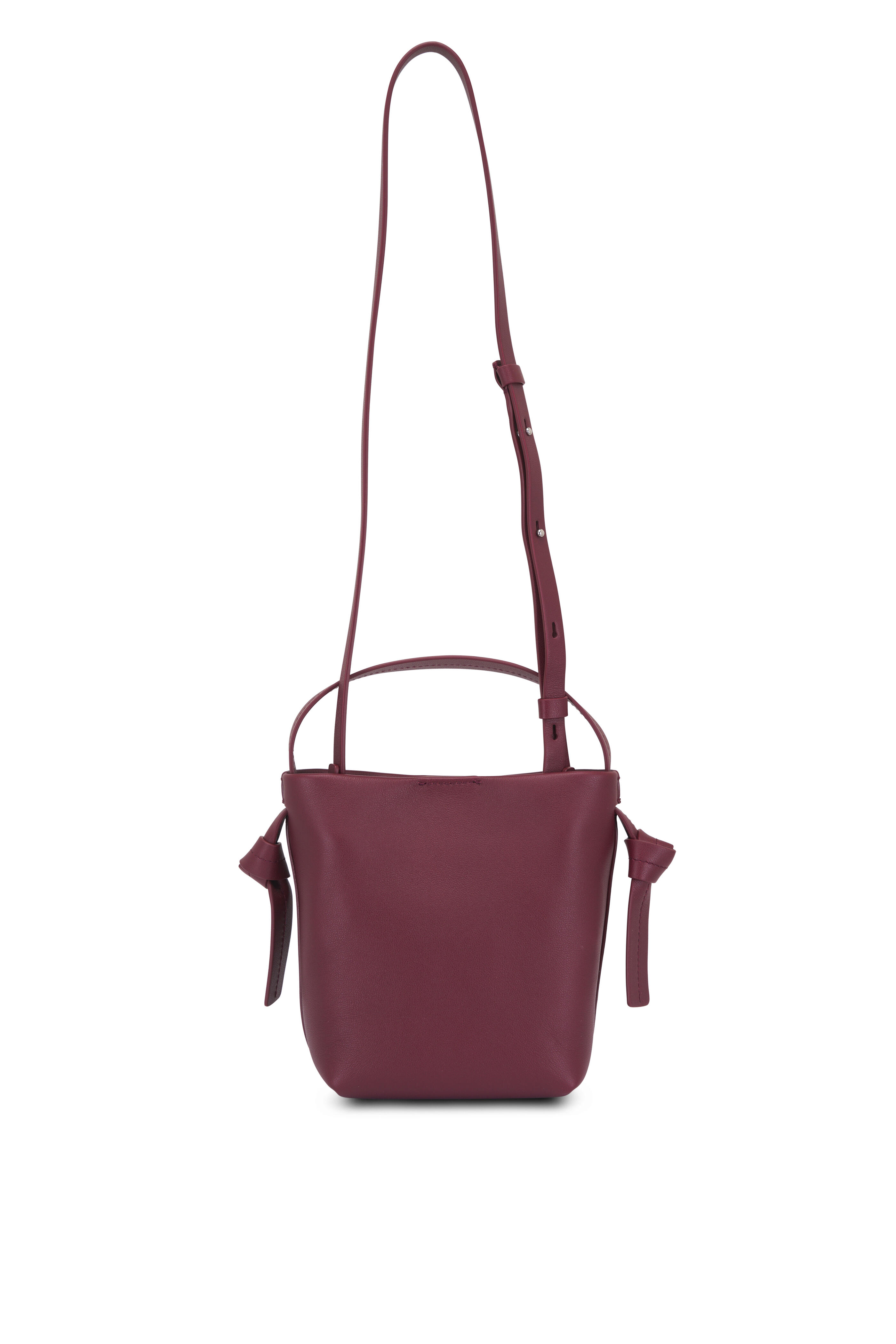 Calfskin leather. Top handle with knot detail. Adjustable and detachable crossbody strap. Magnetic button closure. Interior flat leather pocket. Canvas lining. Embossed logo. Made in Italy. Height: 6.3". Width: 3.5". Length: 5.9".