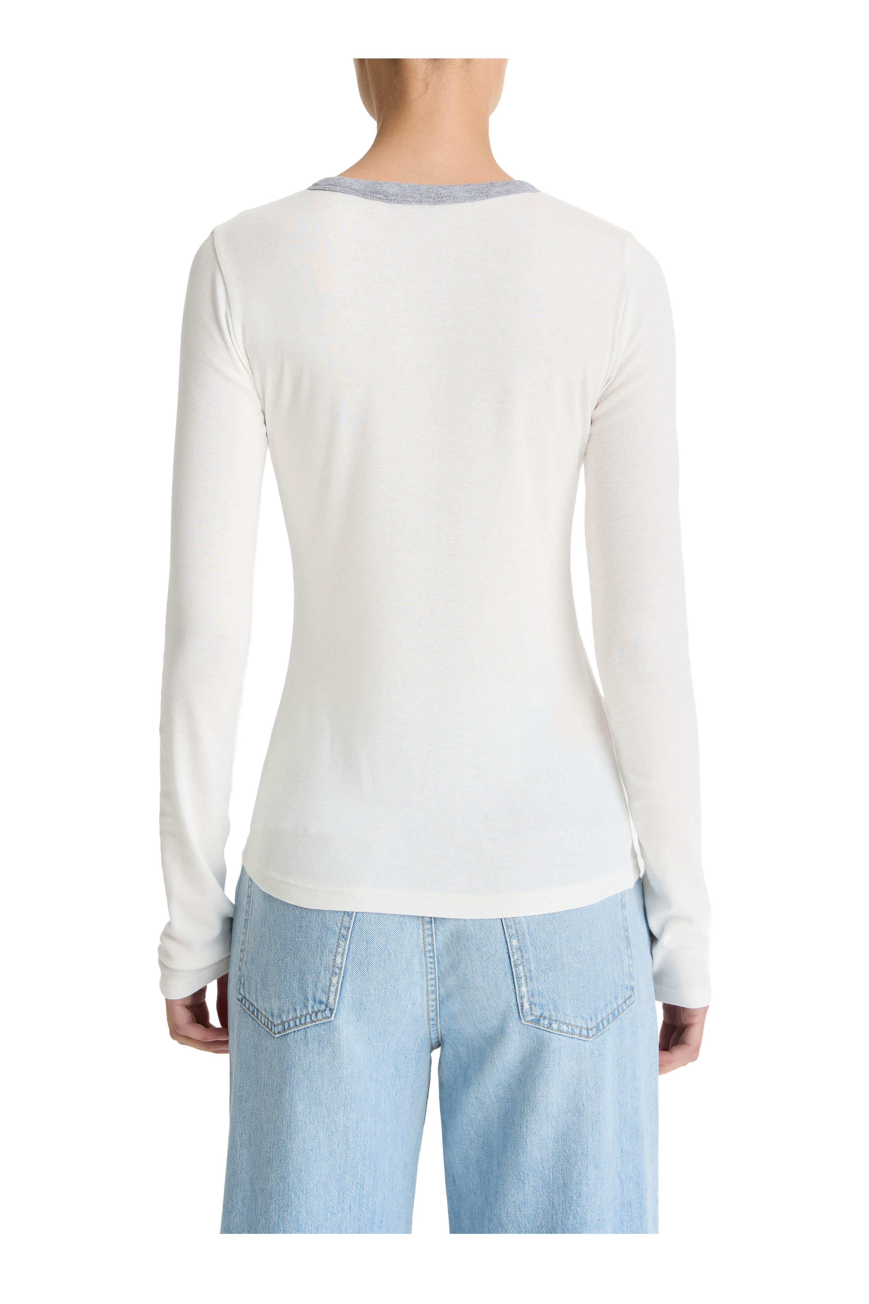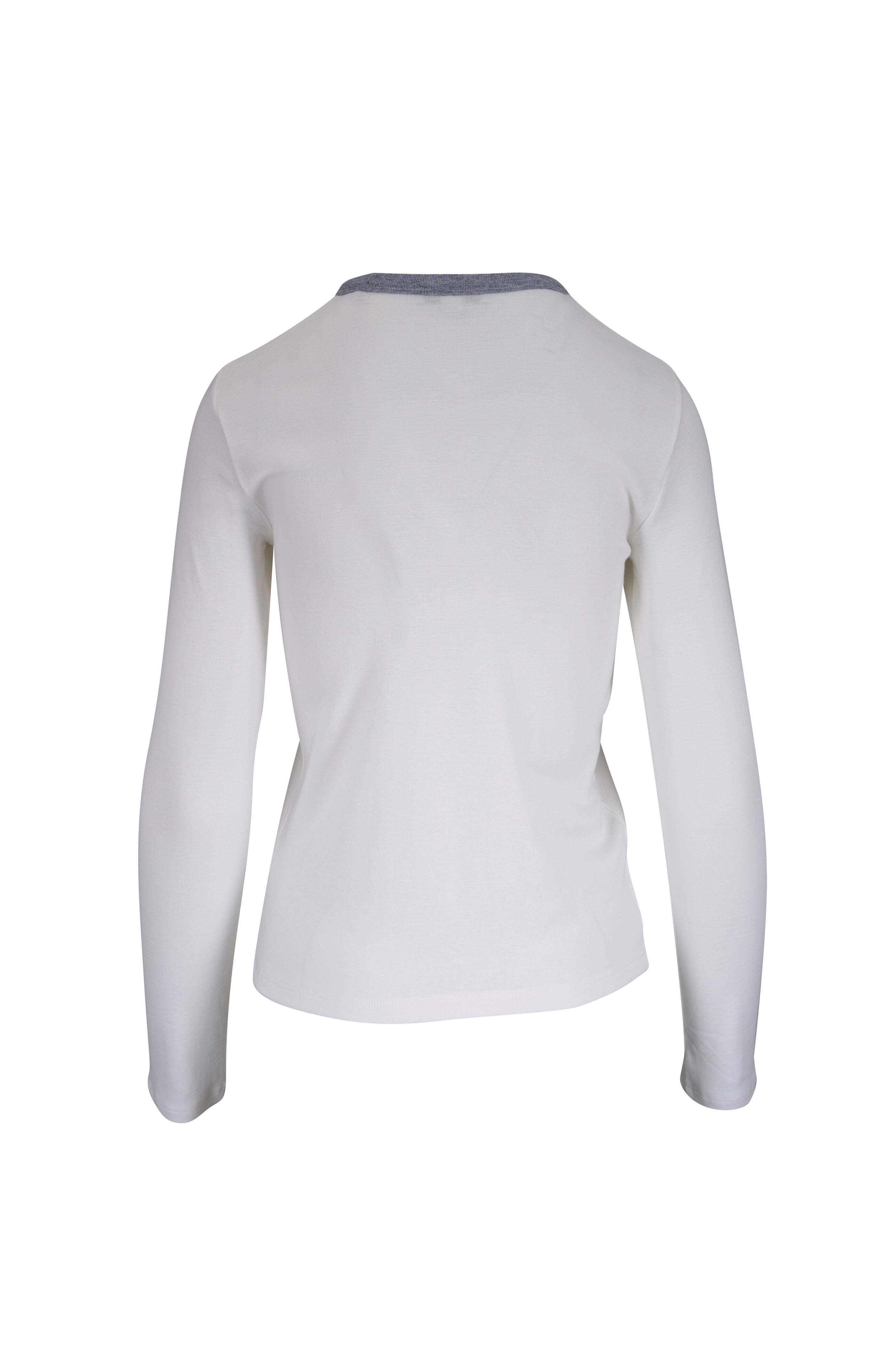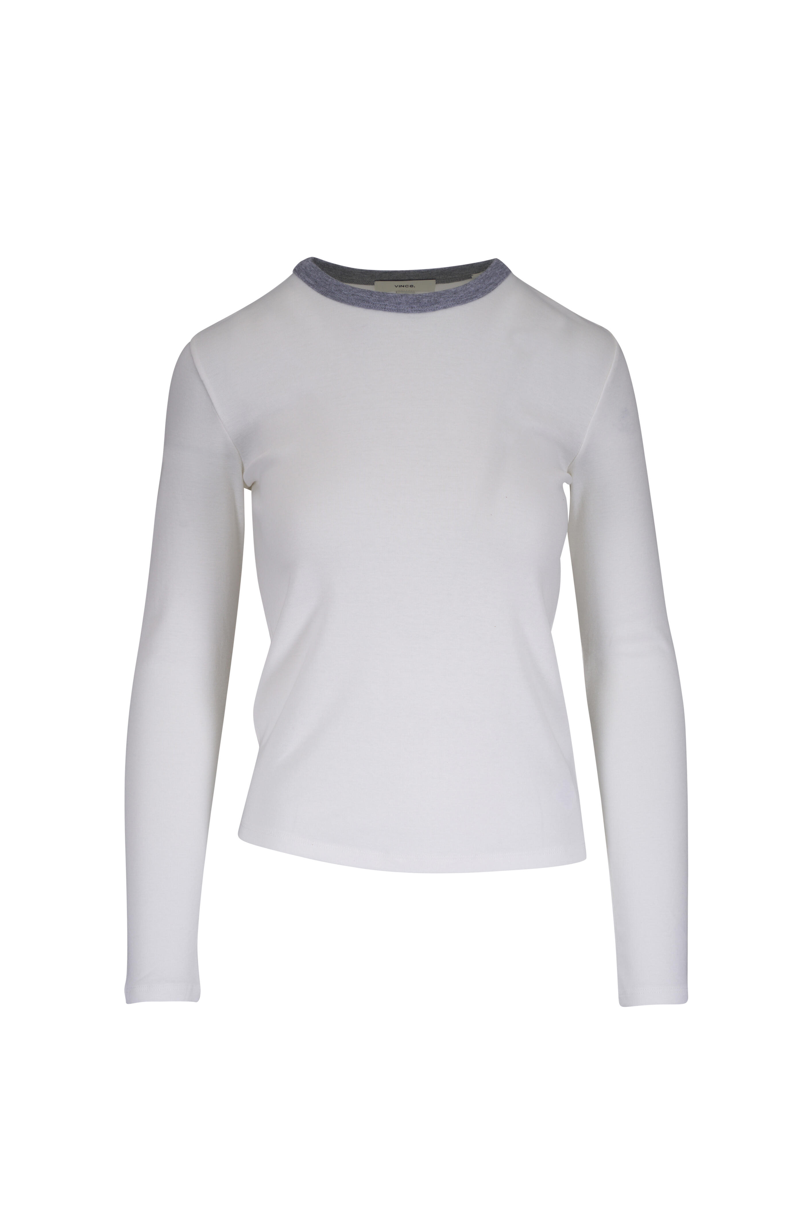 Crew neckline. Contrasting trim neckline. Made in Peru. 70% pima cotton, 30% modal. Machine wash.