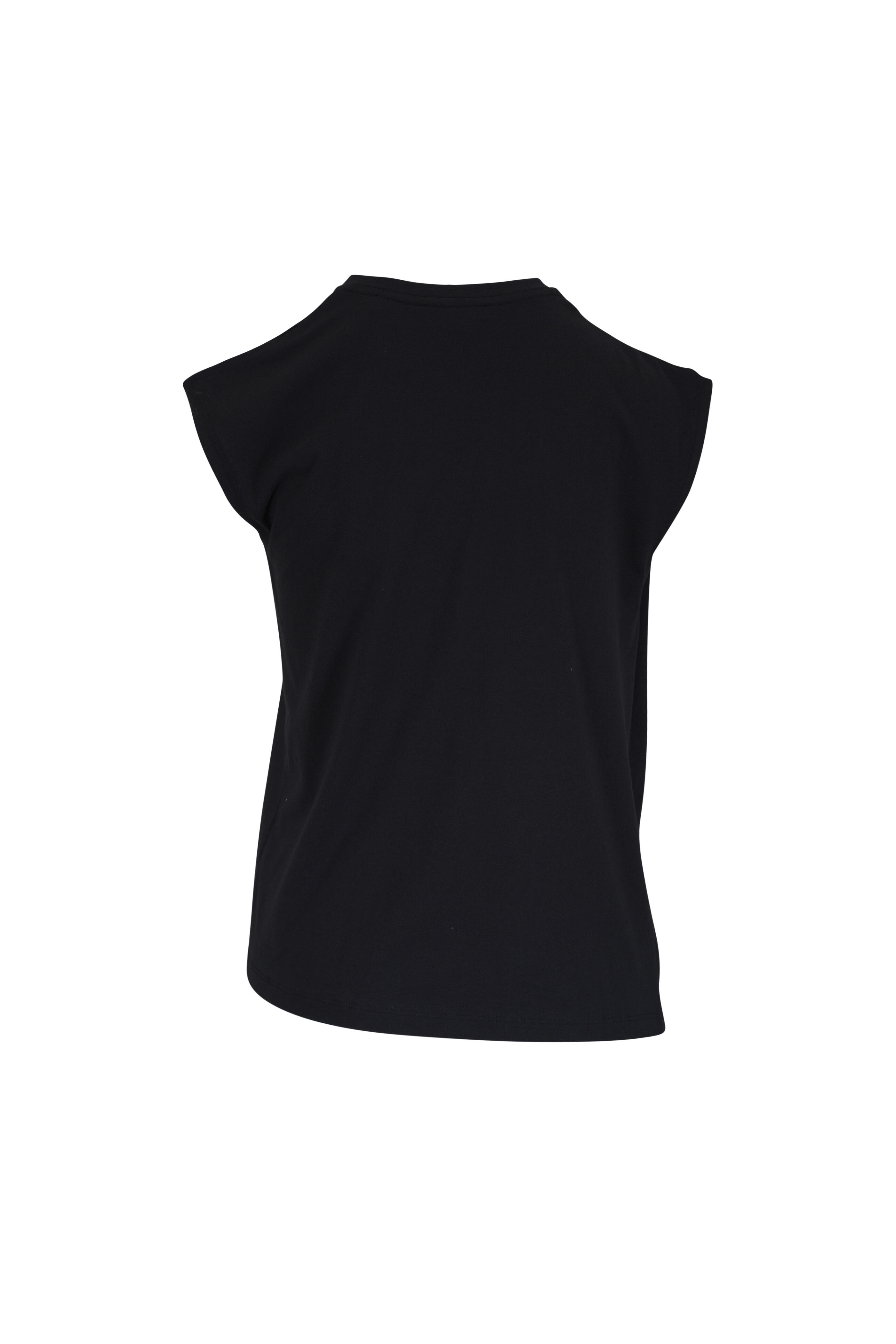 Crew neckline. Draped shoulder detailing. Cap sleeves. Made in Peru. Approximately 25" shoulder to hem (measurements taken from size XS). 75% pima cotton, 25% acetate. Machine wash.