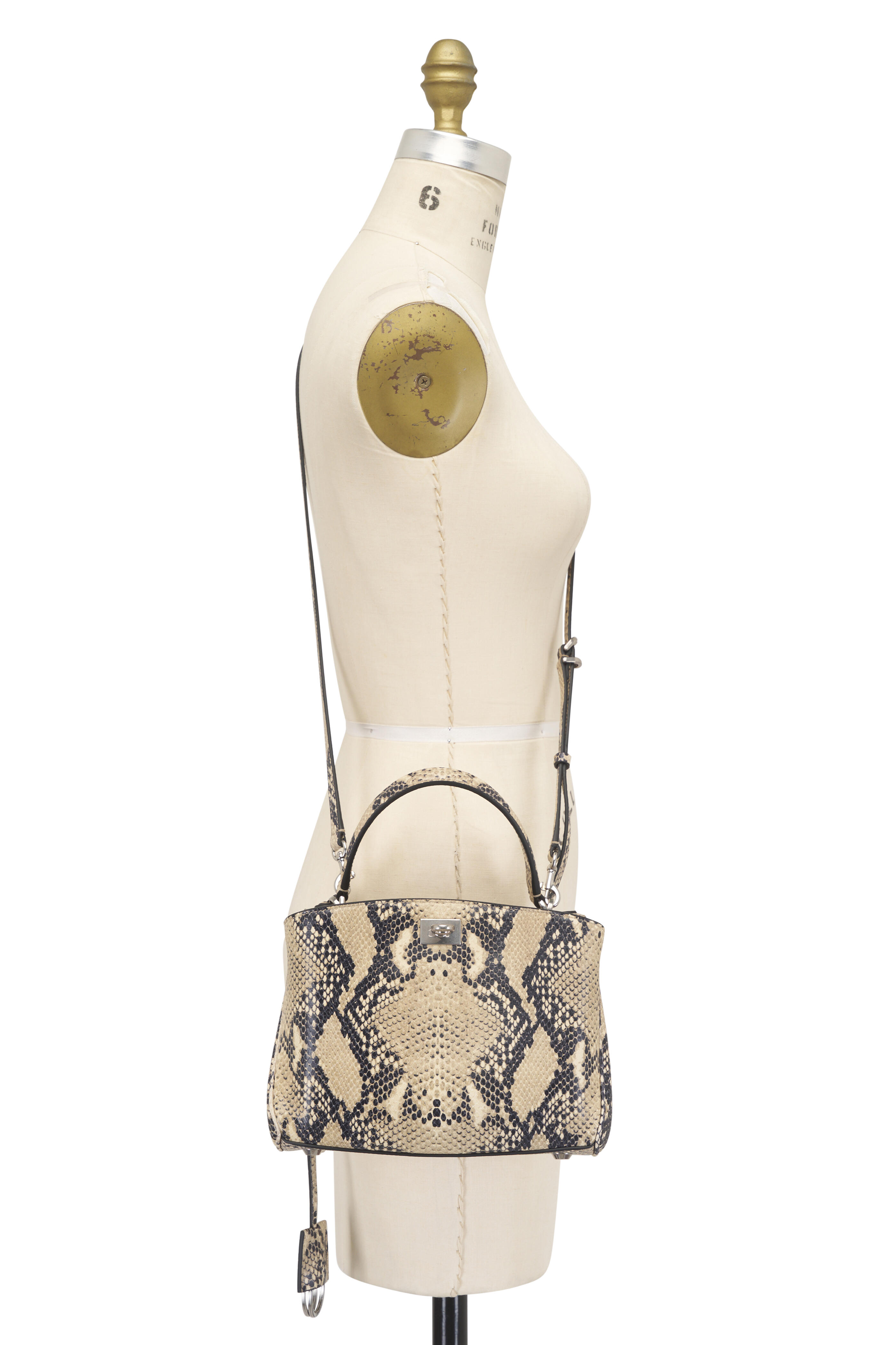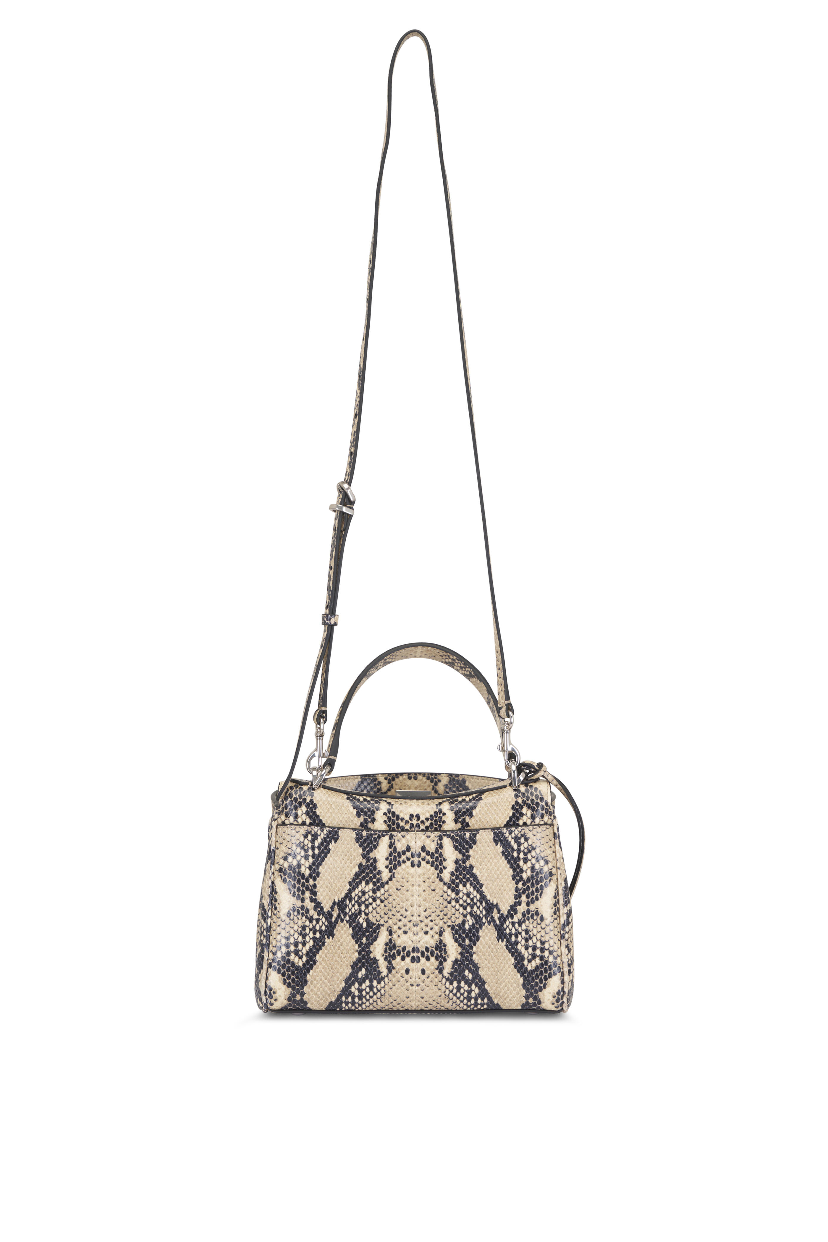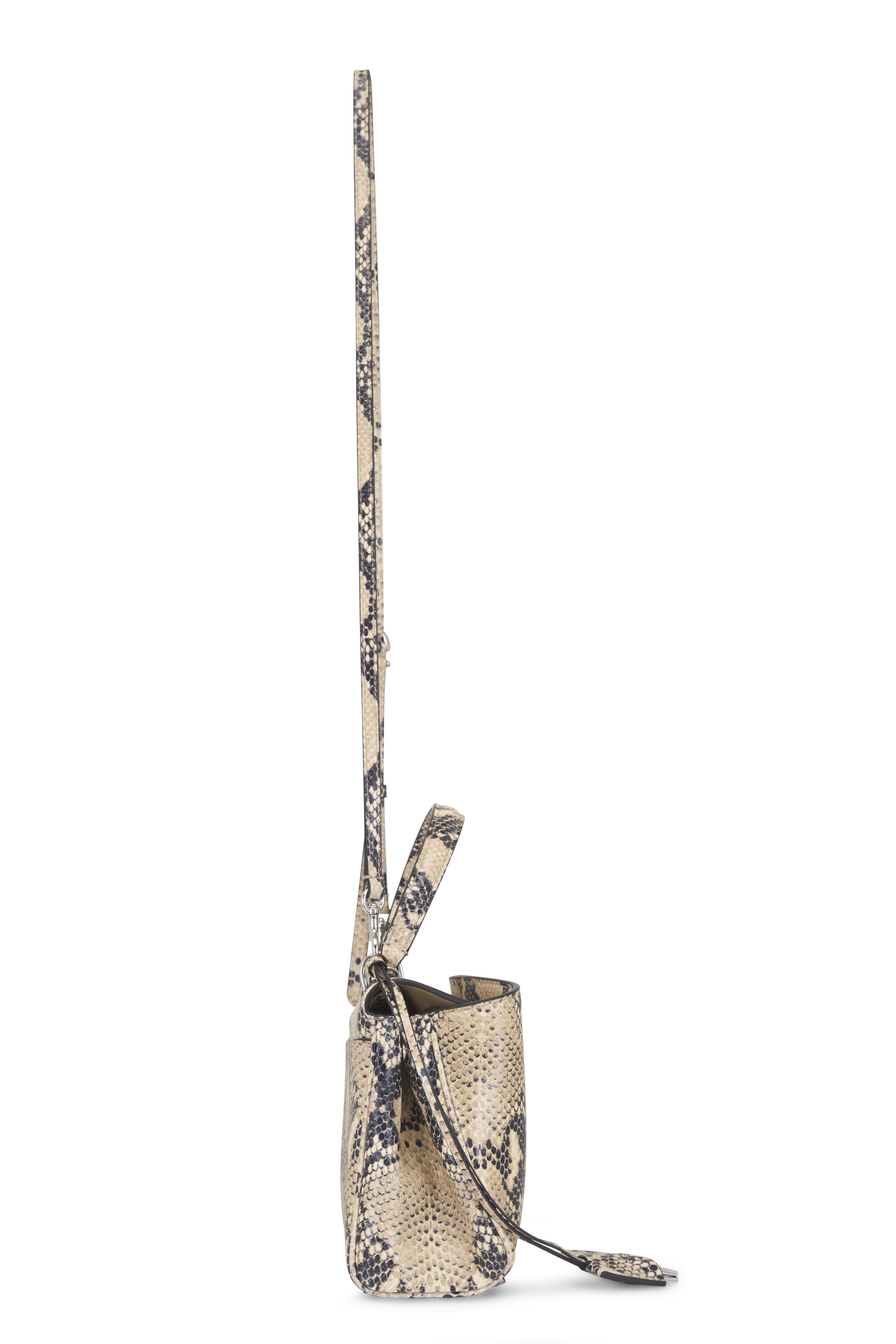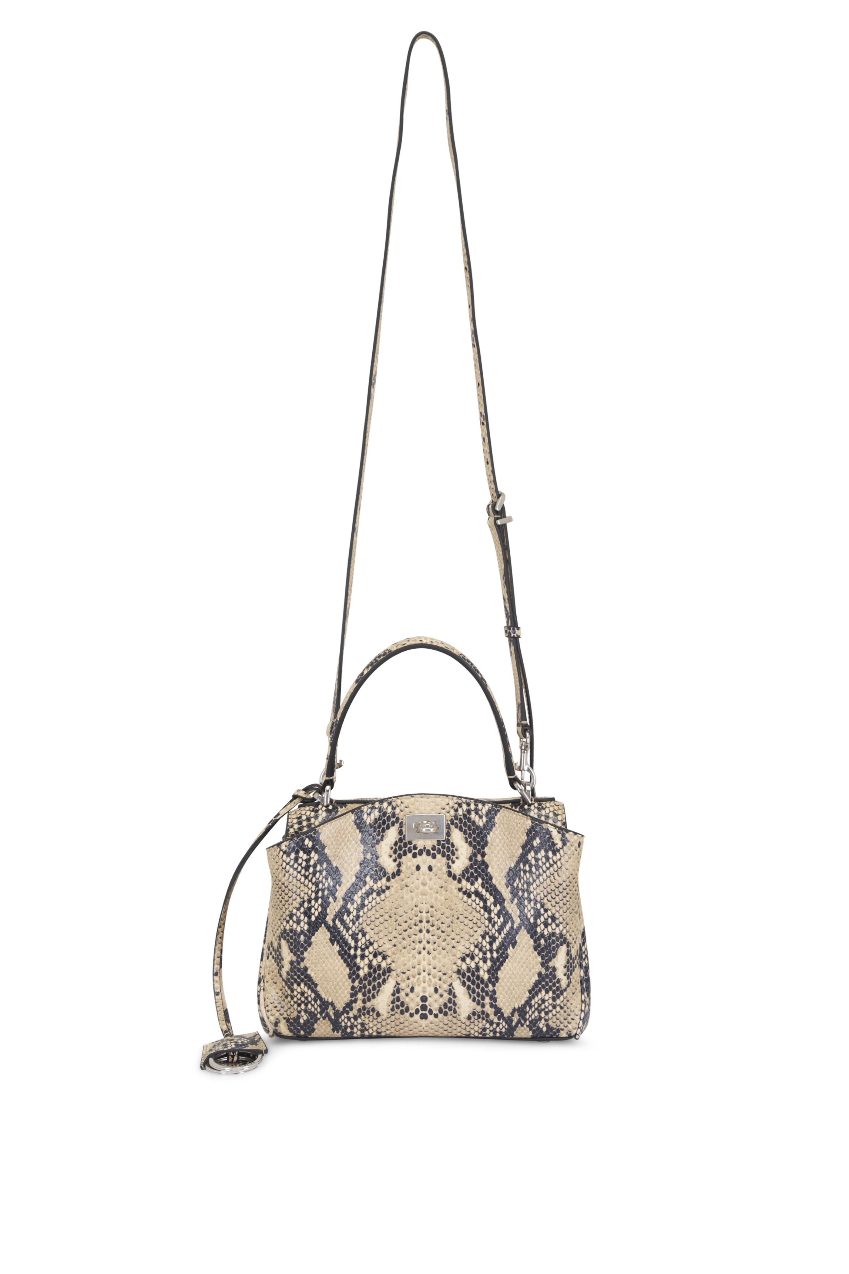 Python embossed leather. Single top handle; adjustable and removable crossbody strap. Turn lock closure. Wide front pocket. Aged-silver hardware. Removable cloche clés with two split rings. Side snaps. One main compartment; two flat pockets. Nappa lambskin lining. Protective metal feet. Made in Italy. Length: 23 cm | 9". Height: 17 cm | 6.7". Width: 10 cm | 3.9". Handle drop: 12 cm | 4.7". Strap drop: 50 cm | 16.7". Can fit the largest smartphones.