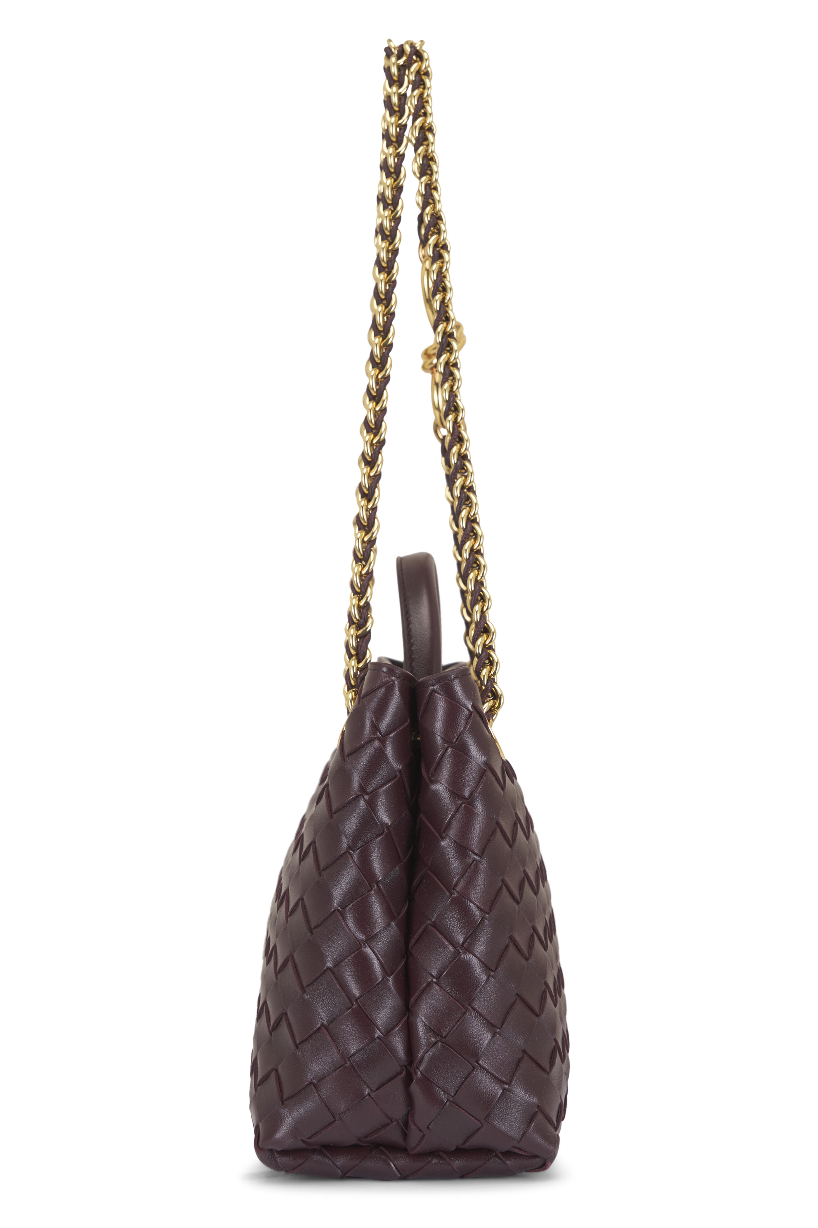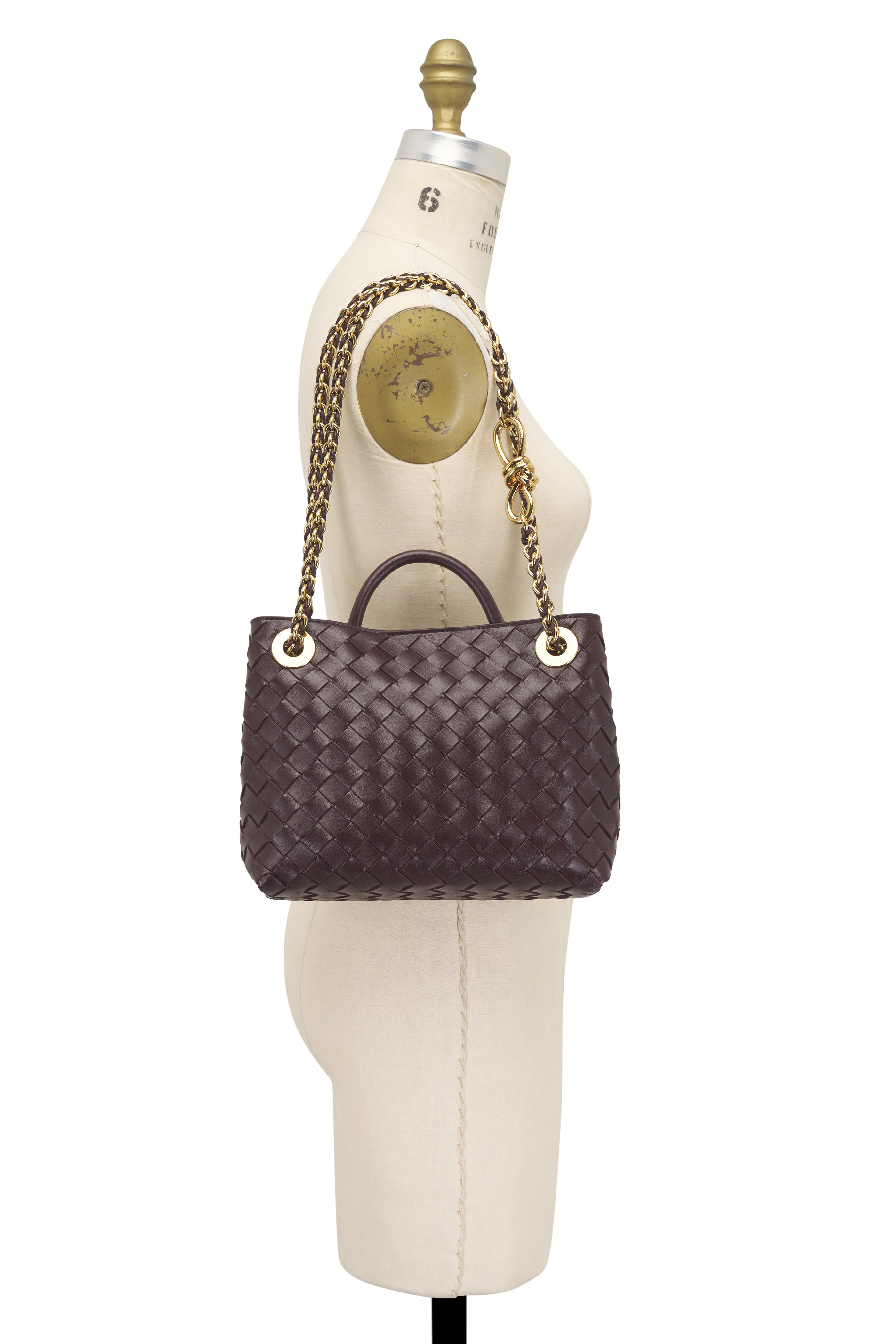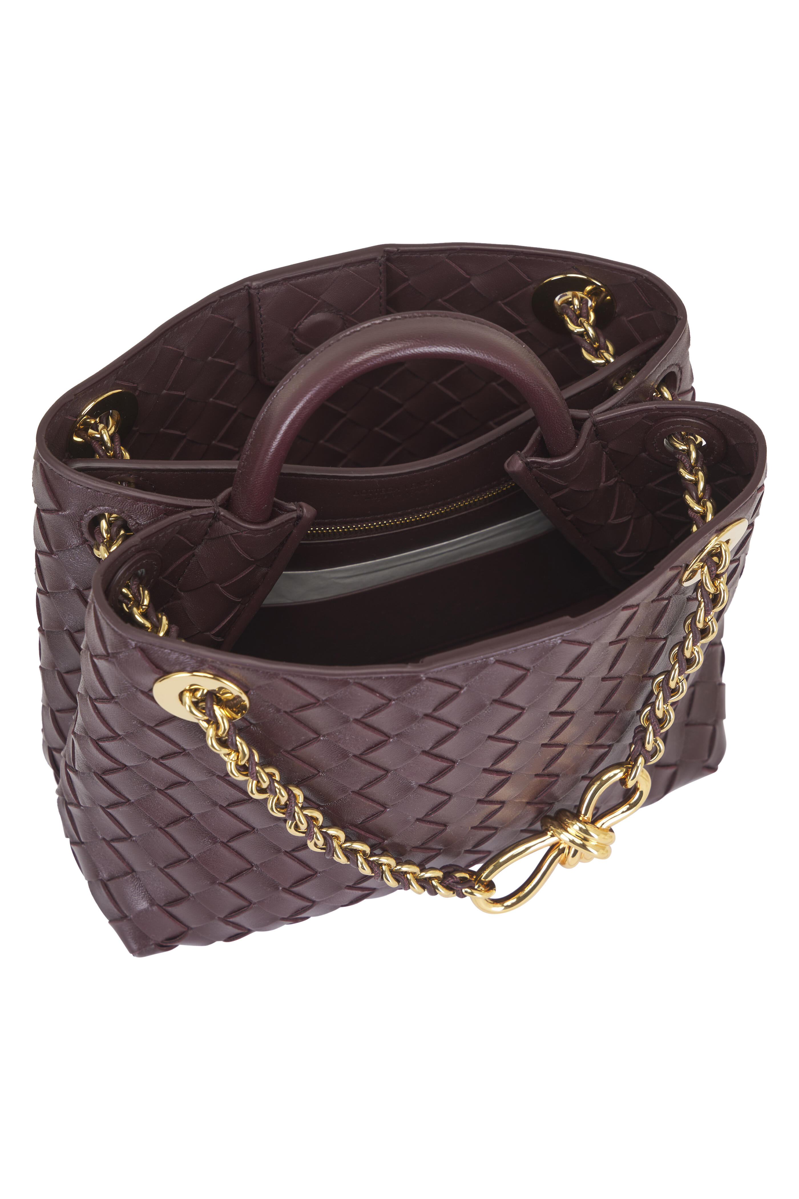 Intrecciato calfskin leather. Top magnetic closure. Top handle; chain shoulder strap. Brass finish hardware. Compartmented interior with one zipped pocket, two open pockets. Lambskin bonded Intrecciato lining. Made in Italy. Height: 7.9". Width: 9.8". Depth: 3.9". Handle drop: 2.4". Strap drop: 19.7".