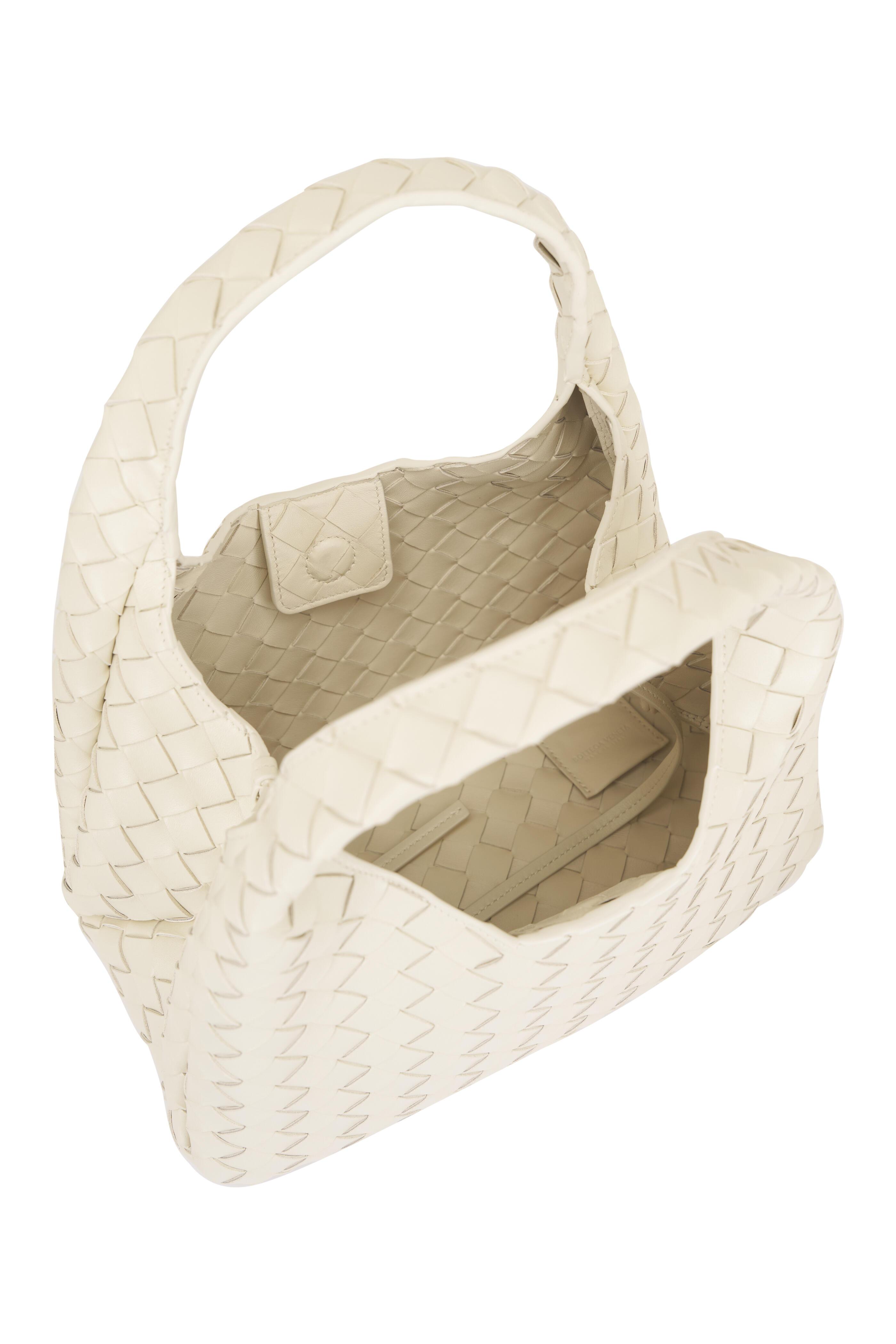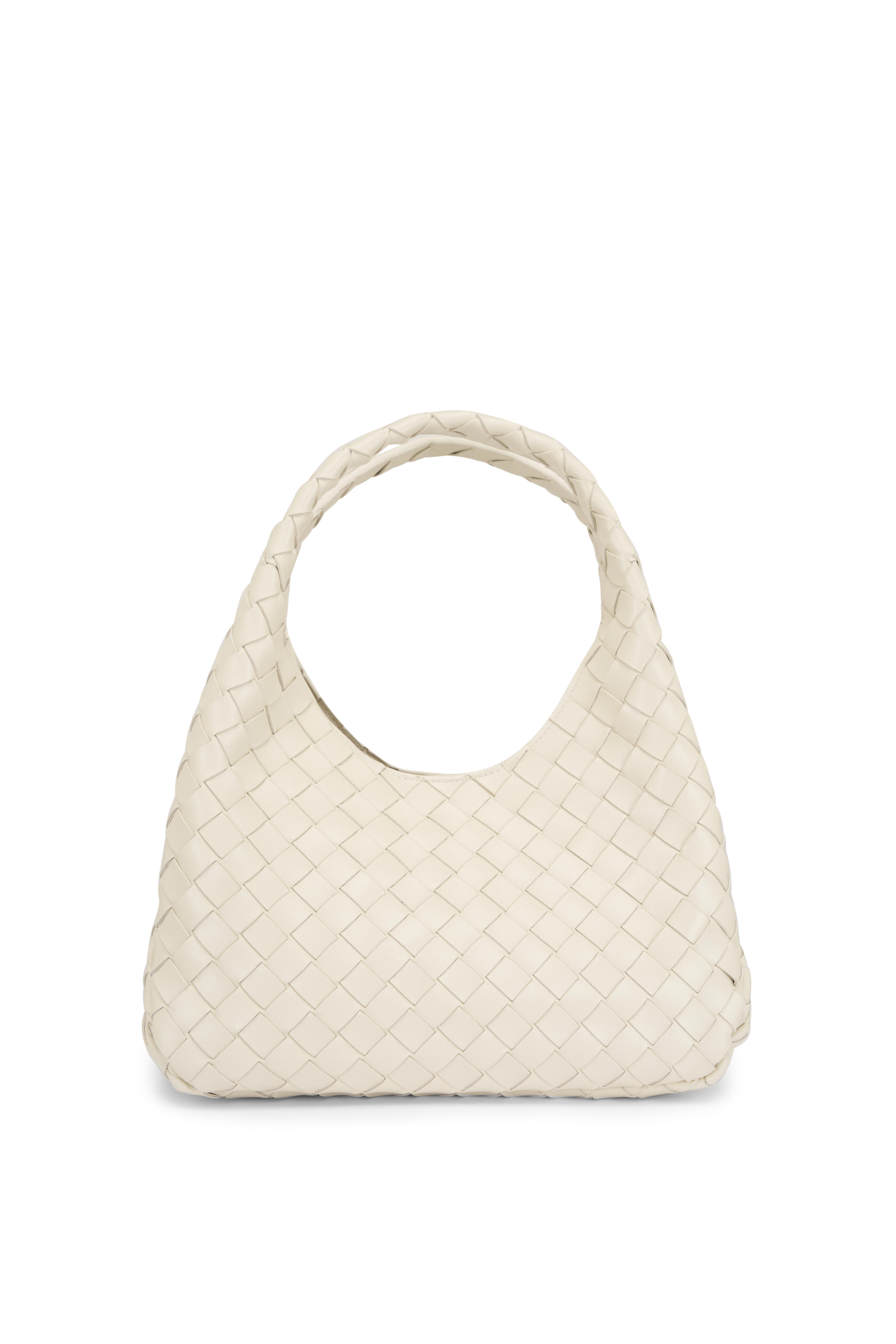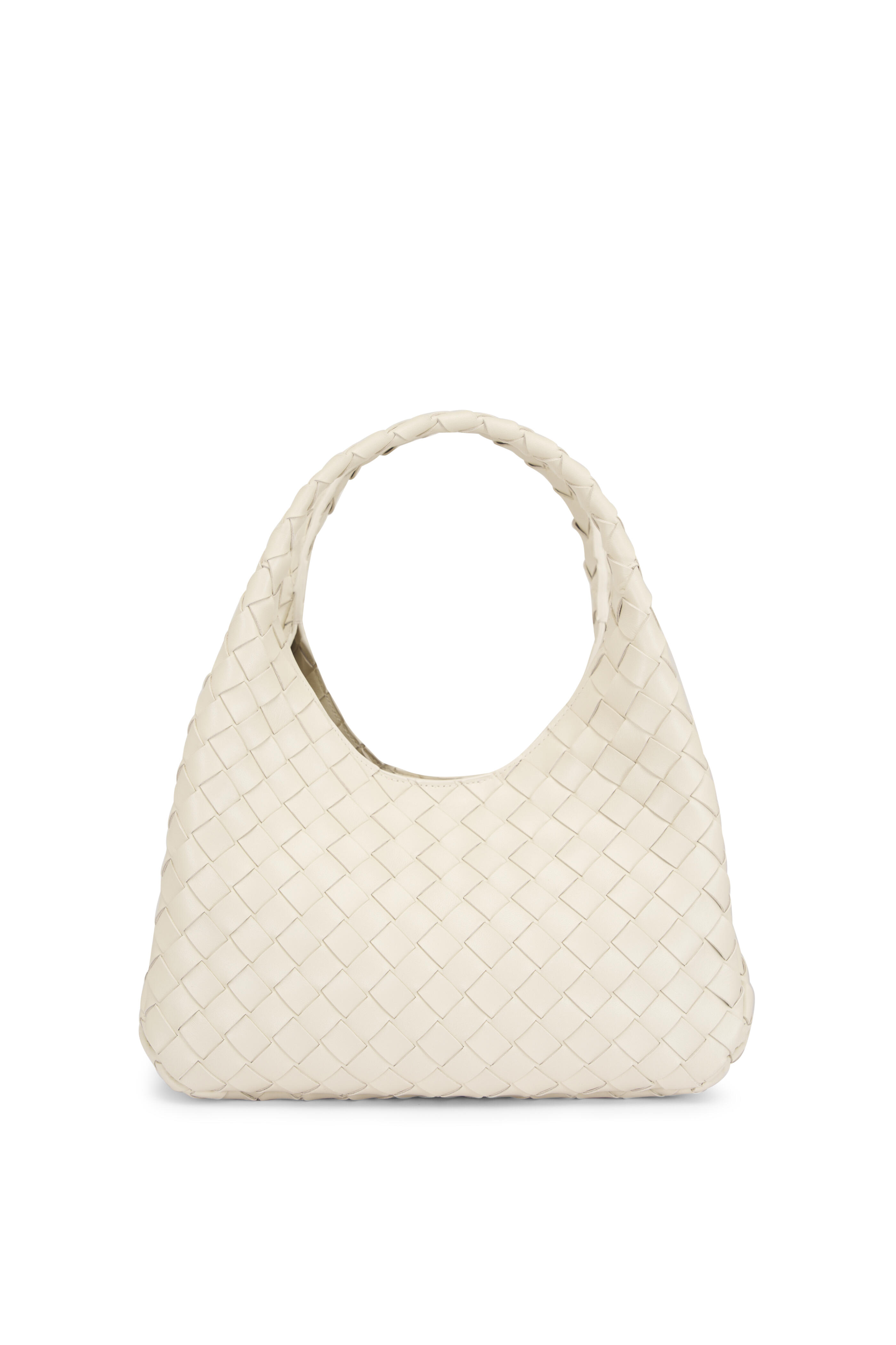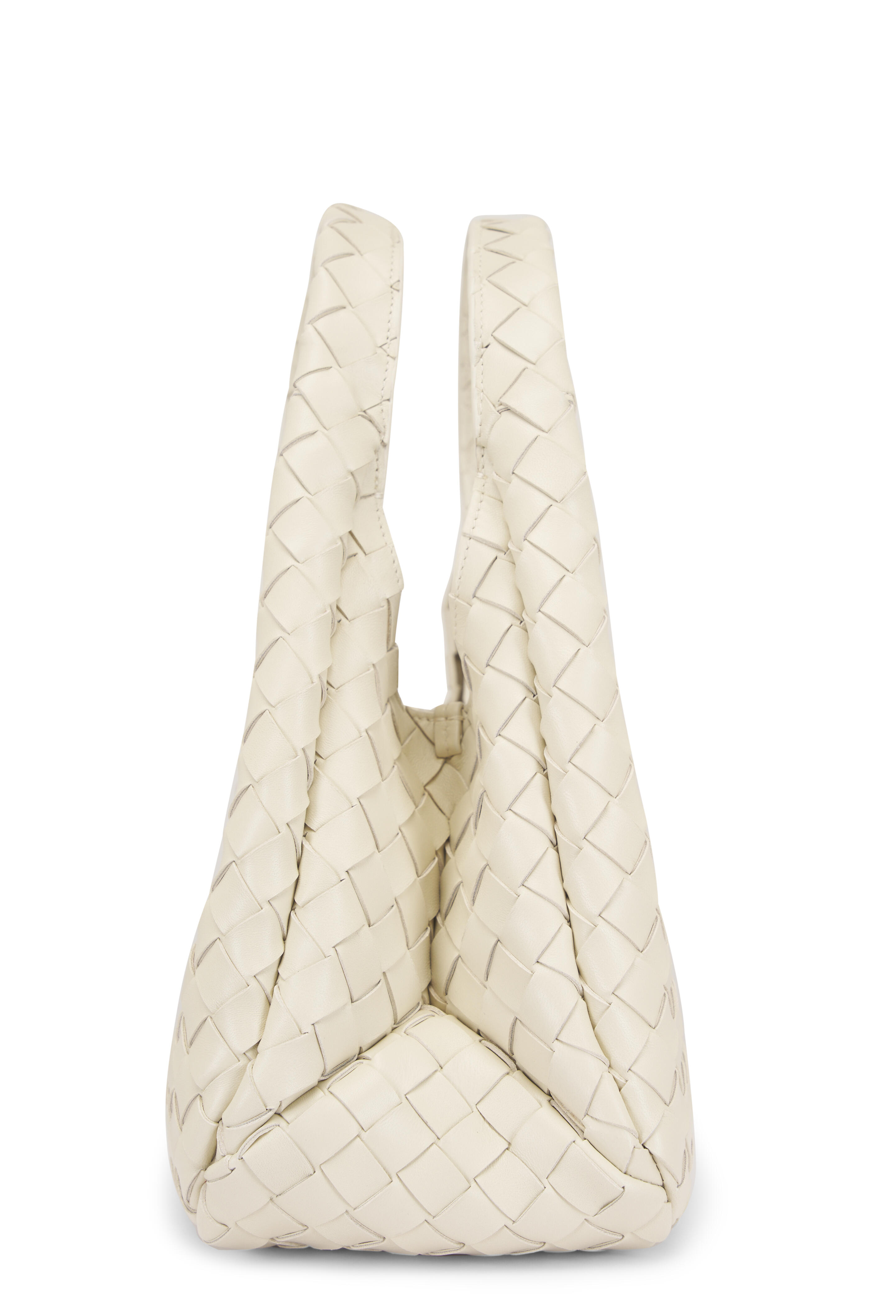 Intrecciato lambskin leather. Shoulder strap. Leather tie closure with hidden magnet. Single compartment. Lambskin bonded Intrecciato lining. Brass-tone finish hardware. Made in Italy. 11 w x 6.25 h x 6 d.