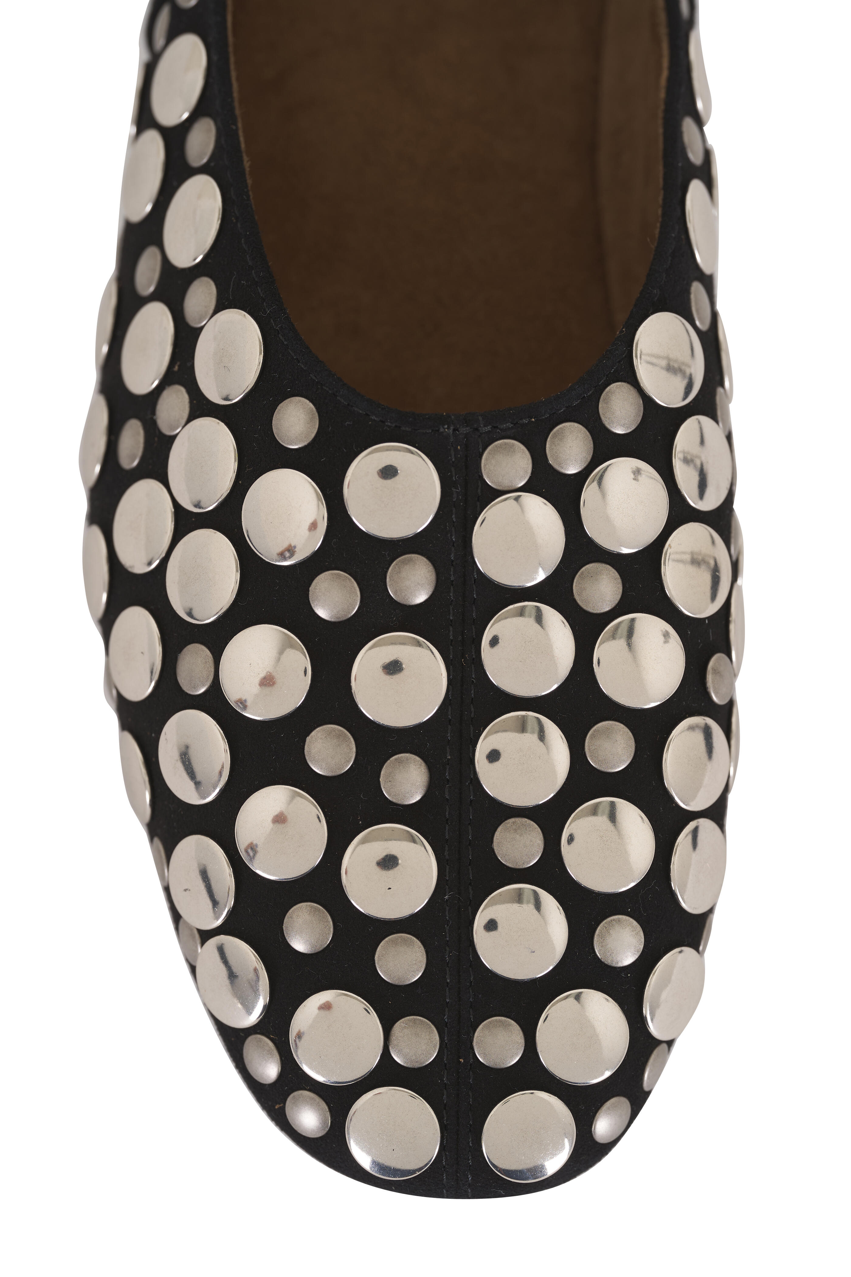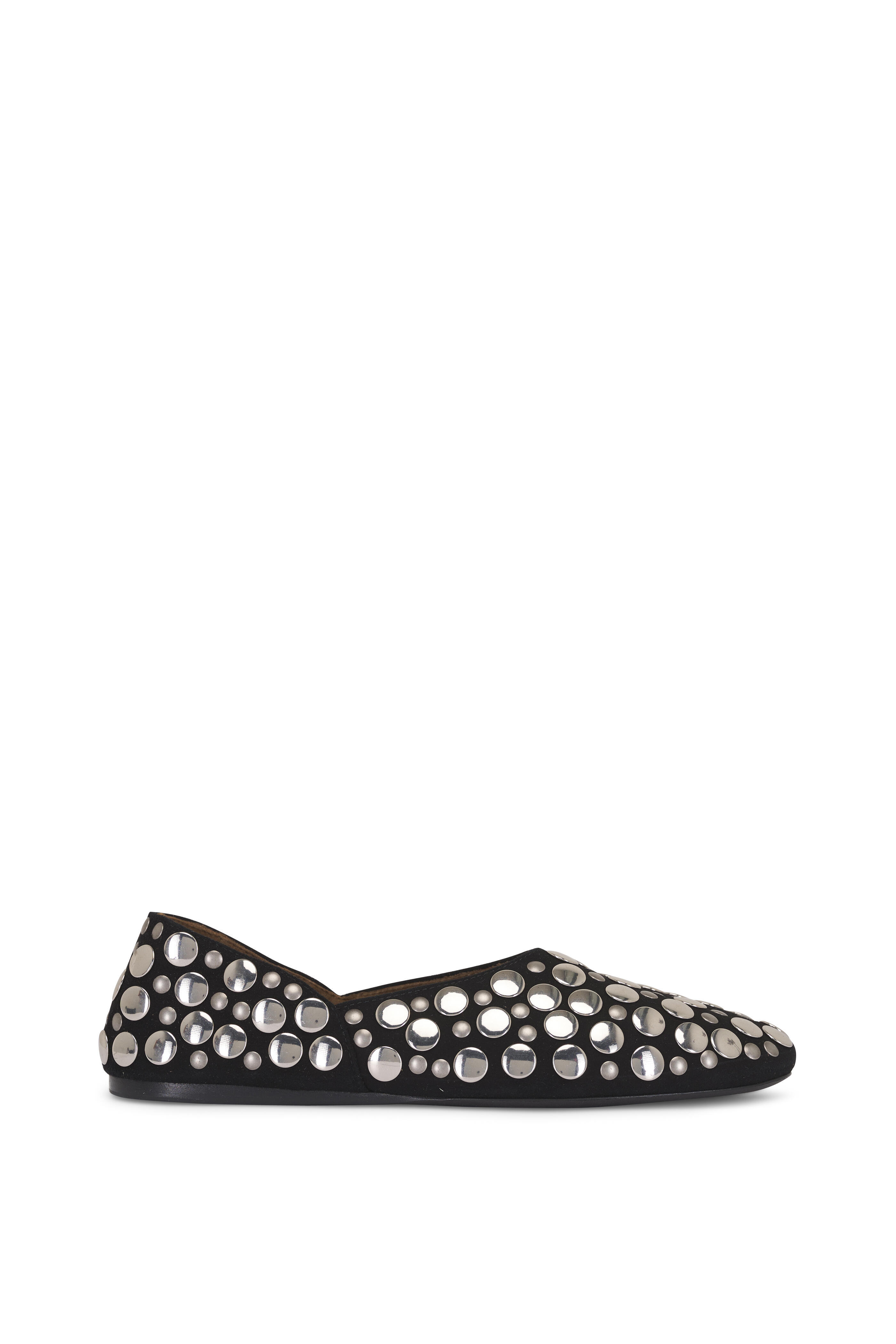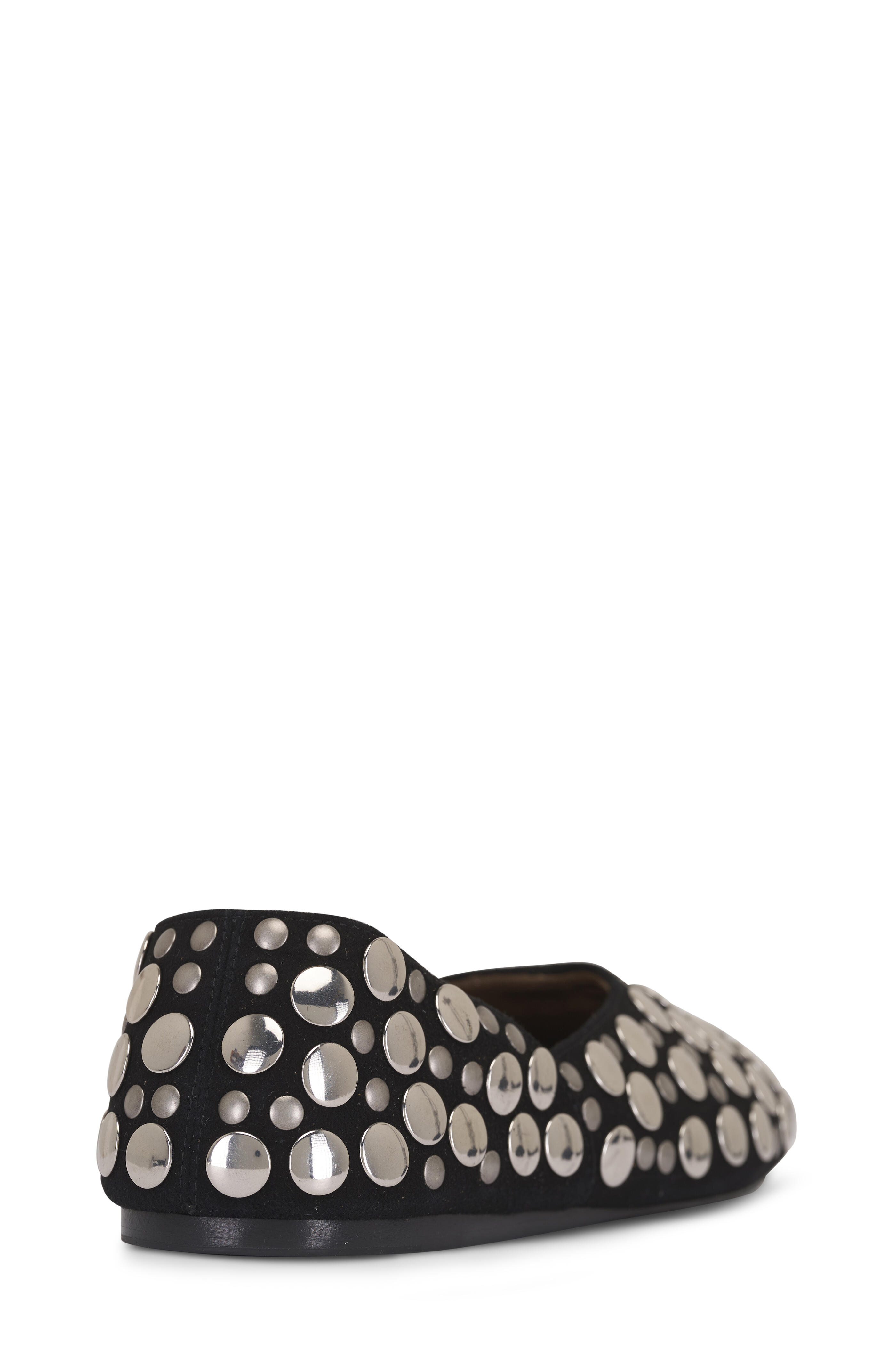 Leather upper. Round toe. Slip on style. Silver-tone stud detailing. Padded insole; leather lining. Made in Italy.
