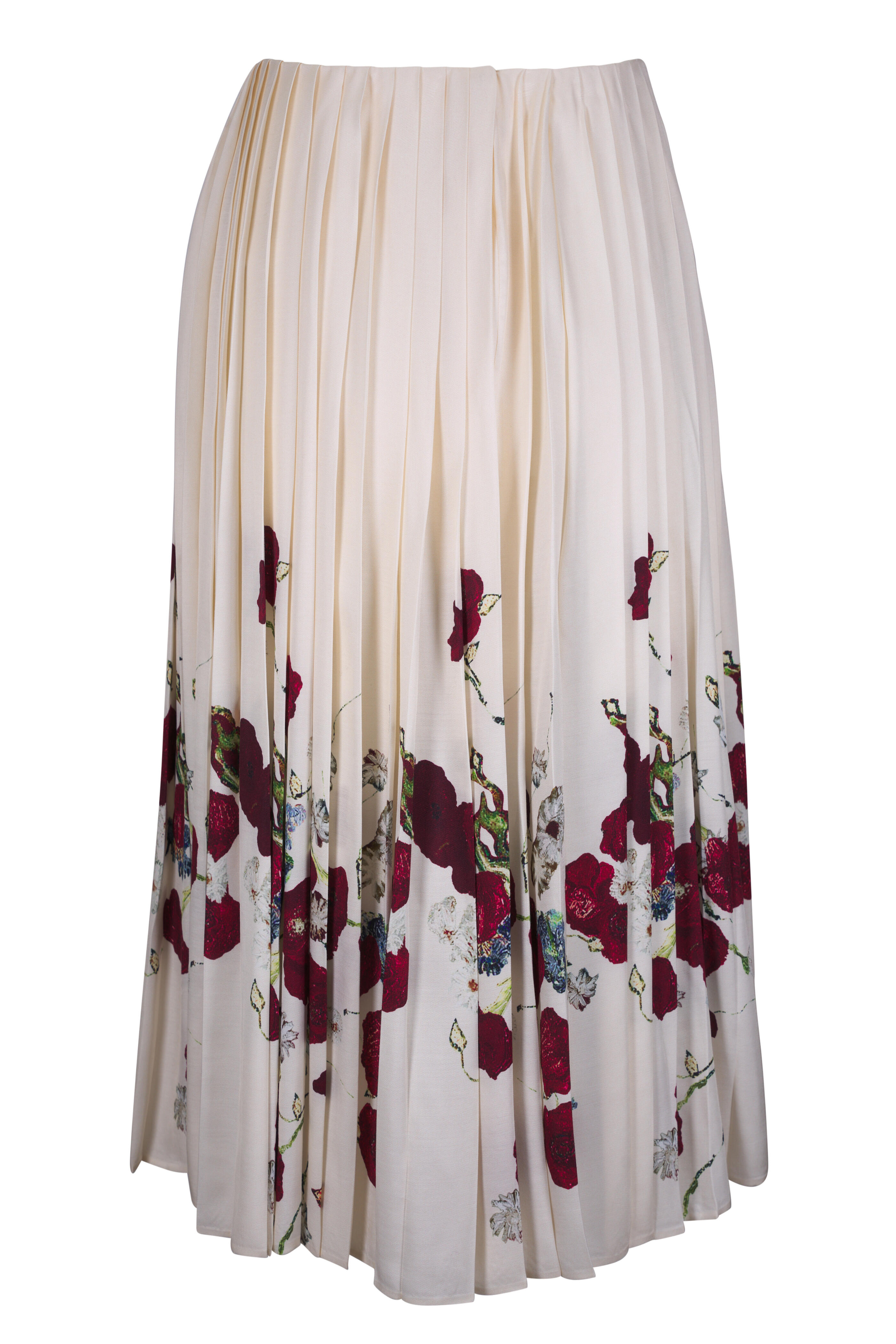 Back button closure. Knife-pleated. Made in the USA. Approximately 27" waist to hem (measurements taken from size 2). 100% viscose. Dry clean.
