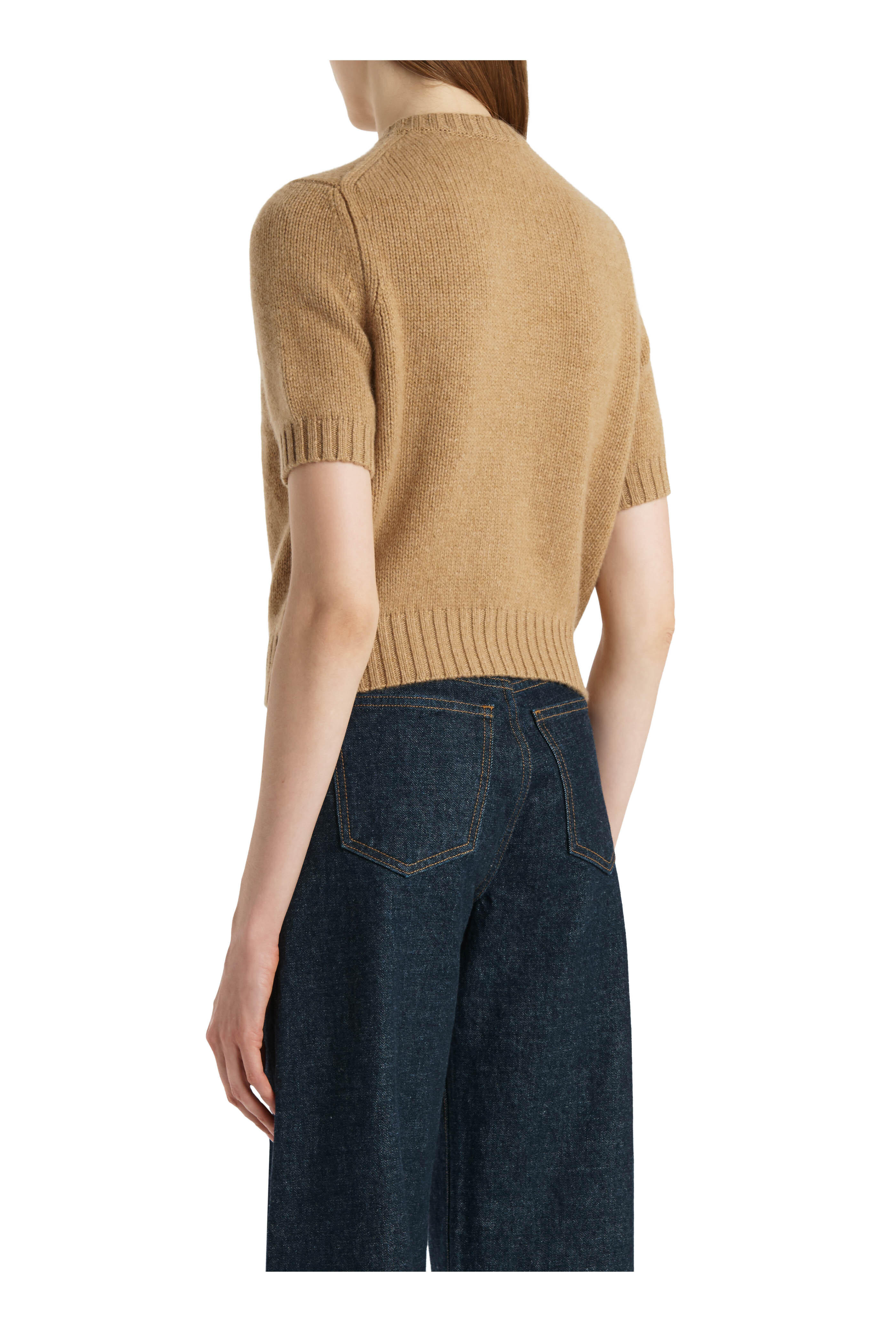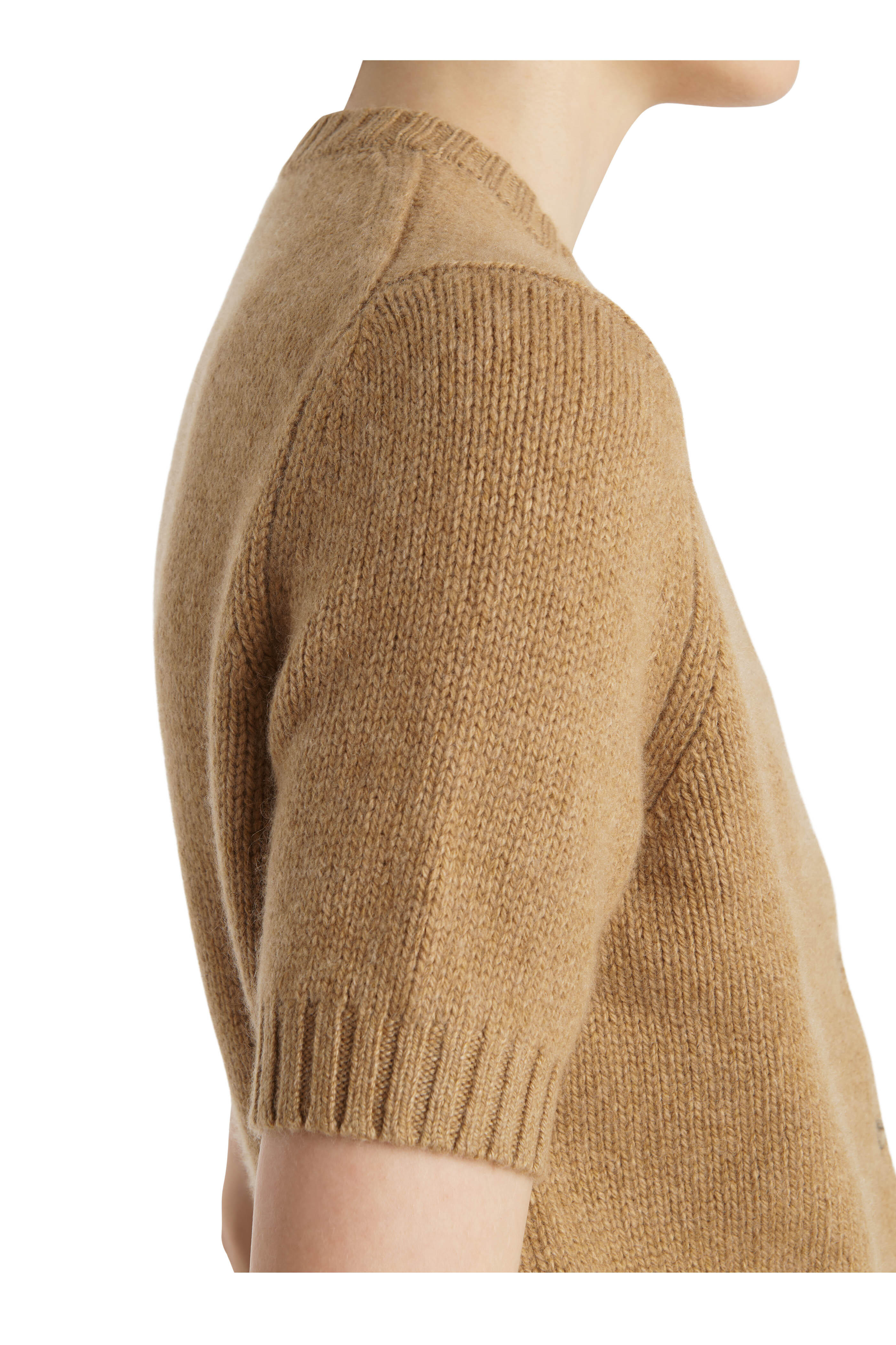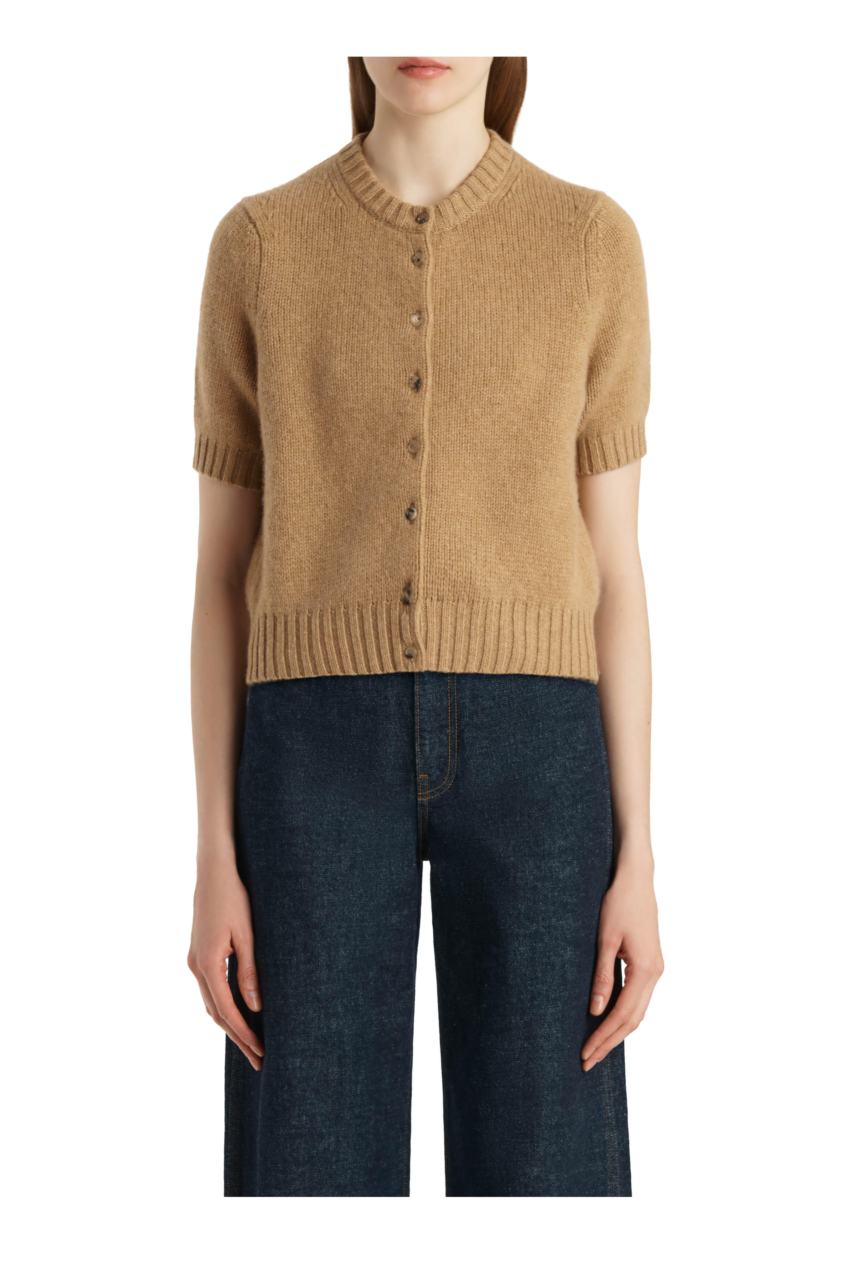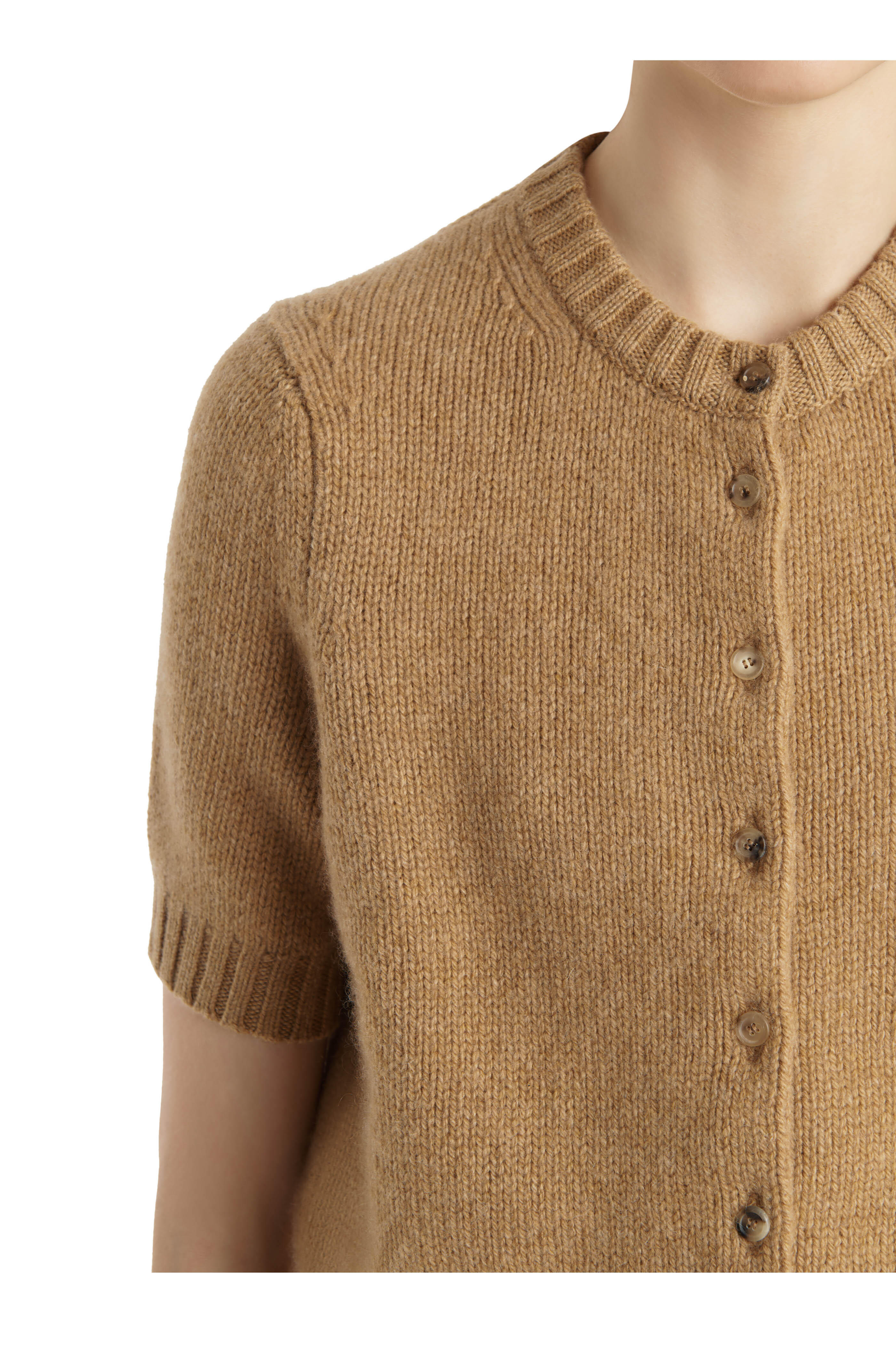 Crew neckline. Front button placket. Short sleeves. Ribbed trims. Straight hem. Imported. Shoulder to hem 21" (size s). 95% Cashmere, 2% elastane. Dry clean.