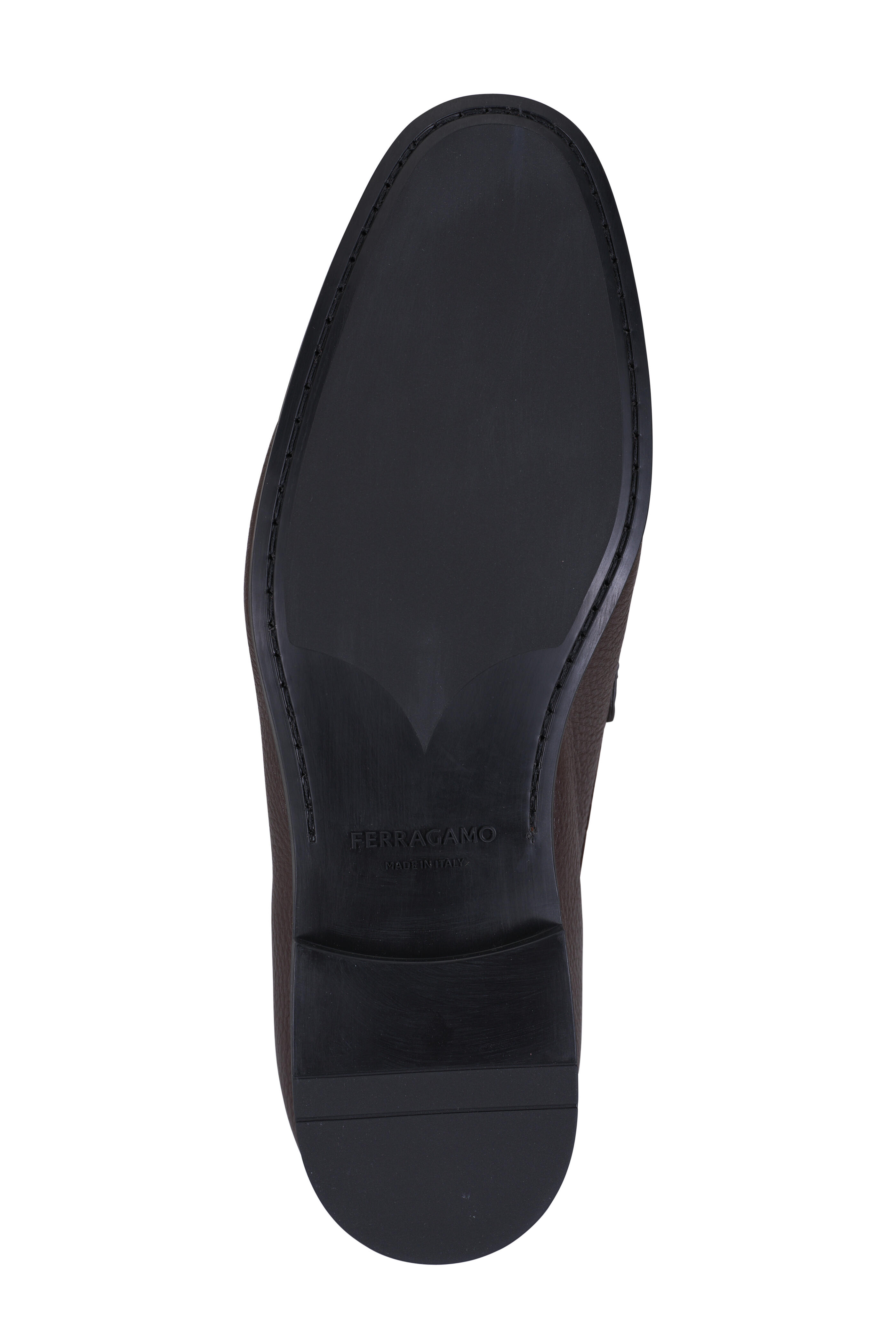 Leather upper. Moc toe. Penny strap across vamp. Leather lining and insole. Rubber sole. Gancini logo on side. Made in Italy.