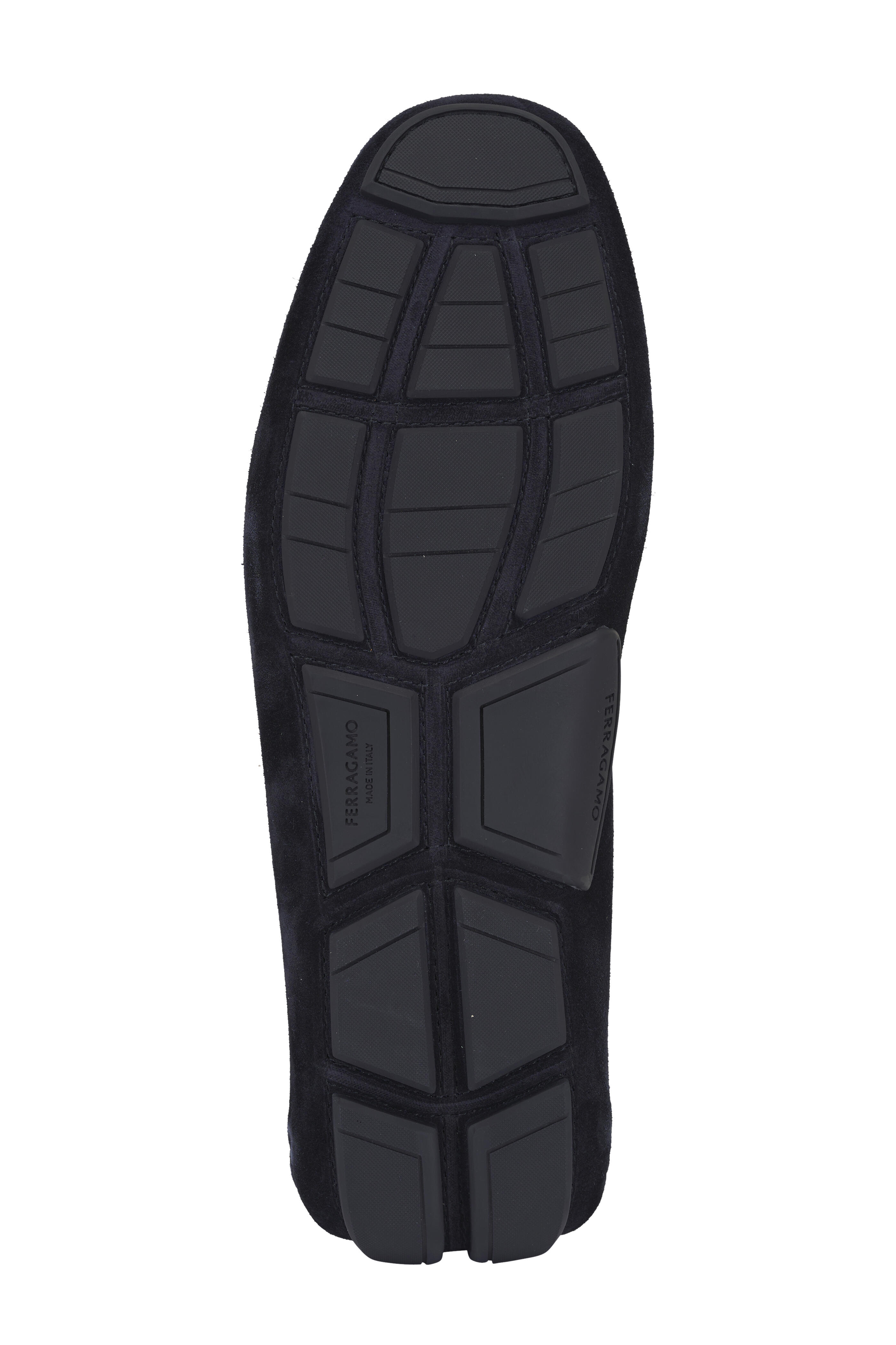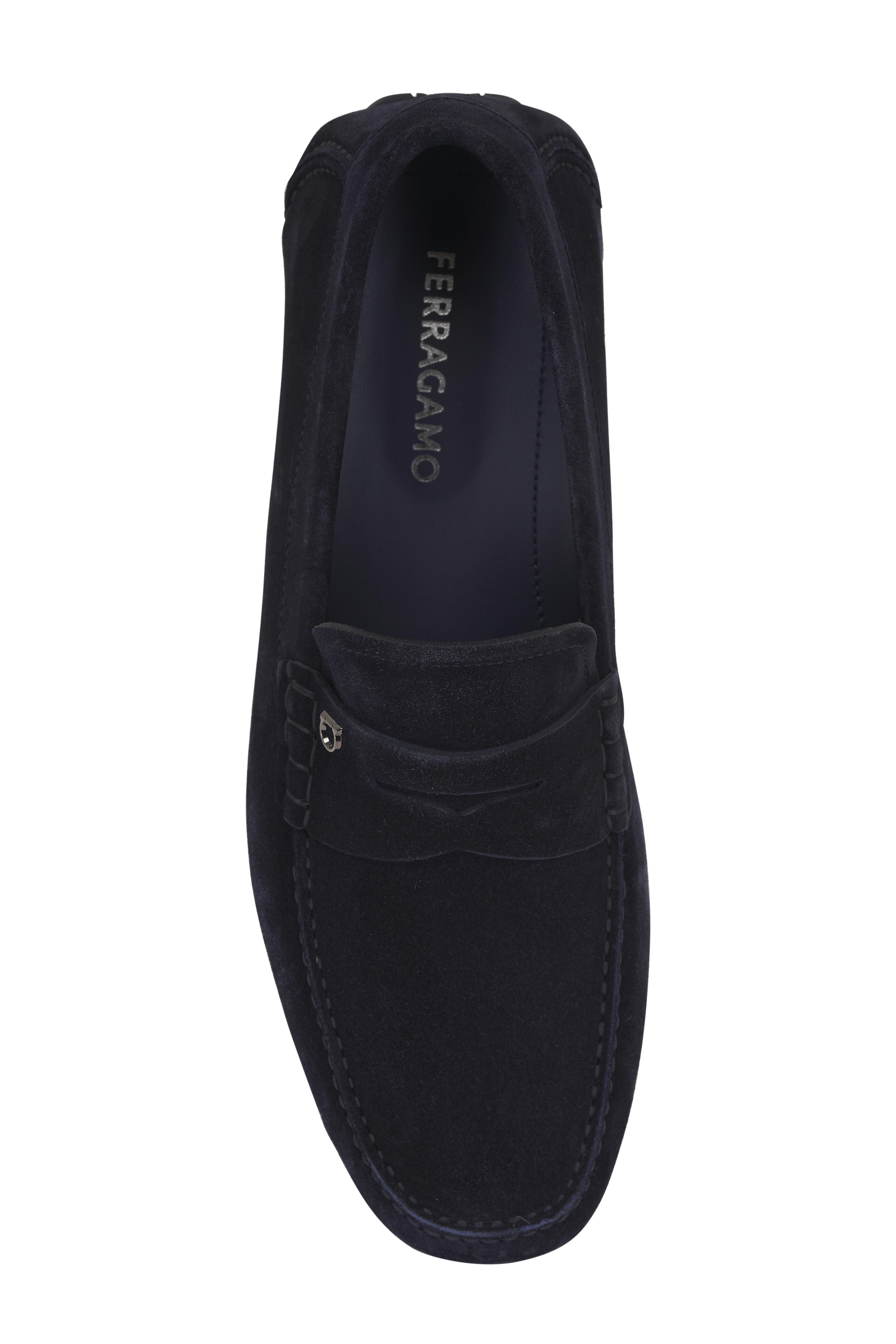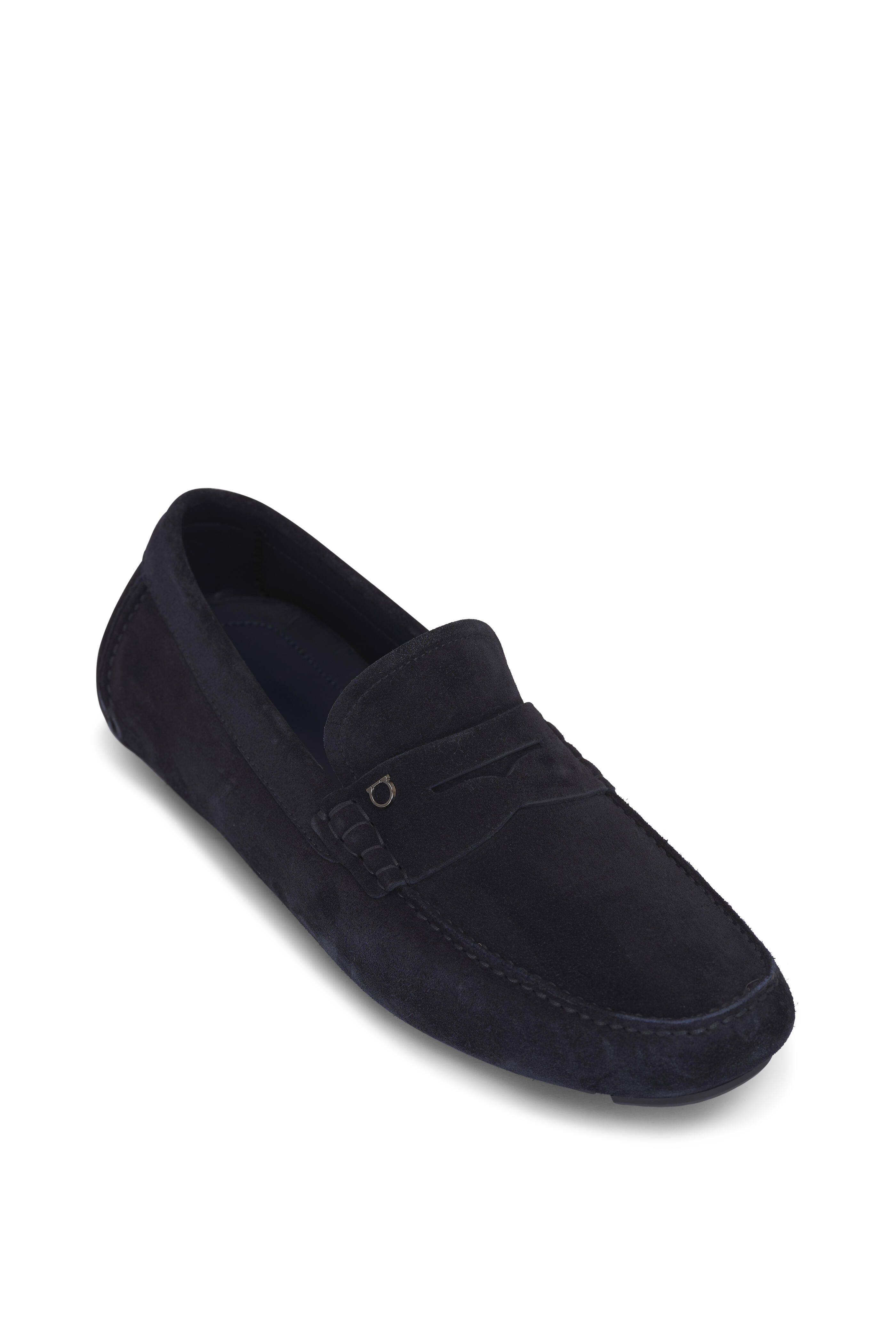 Suede upper. Apron toe. Notched vamp with penny strap. Slip-on style. Leather lining and insole. Rubber sole. Made in Italy.