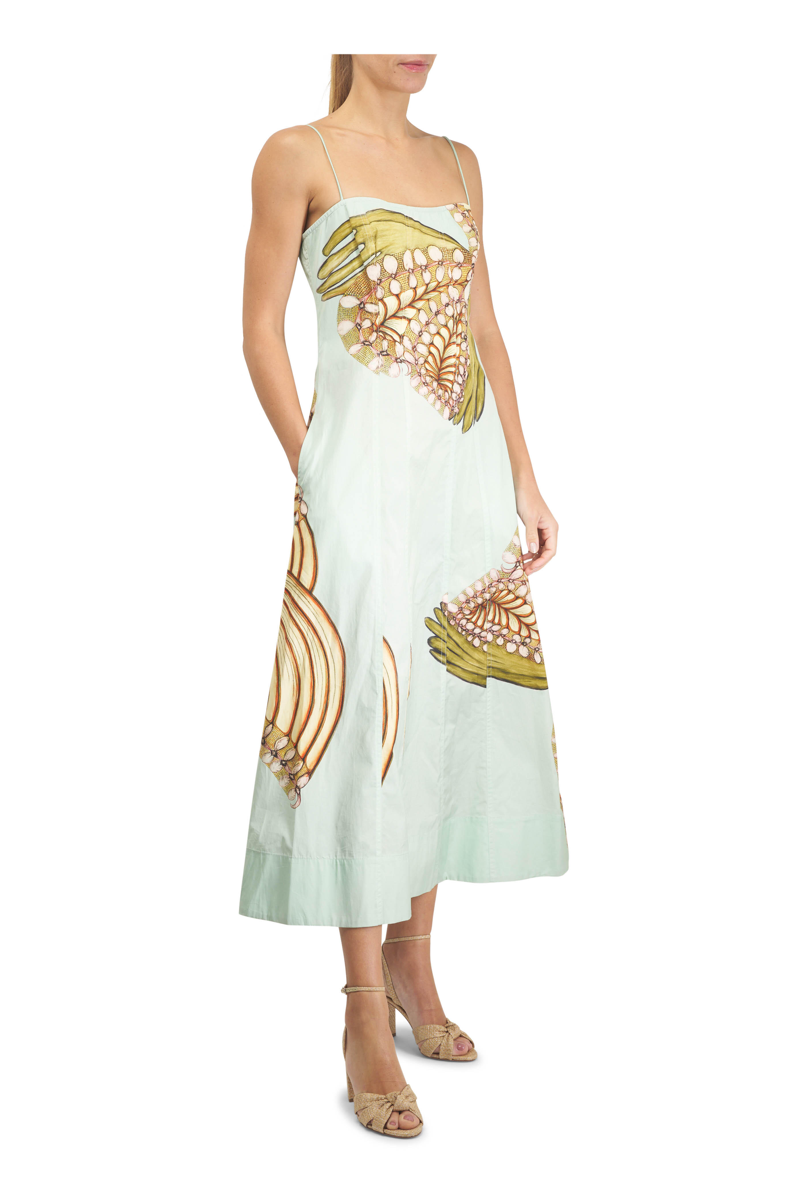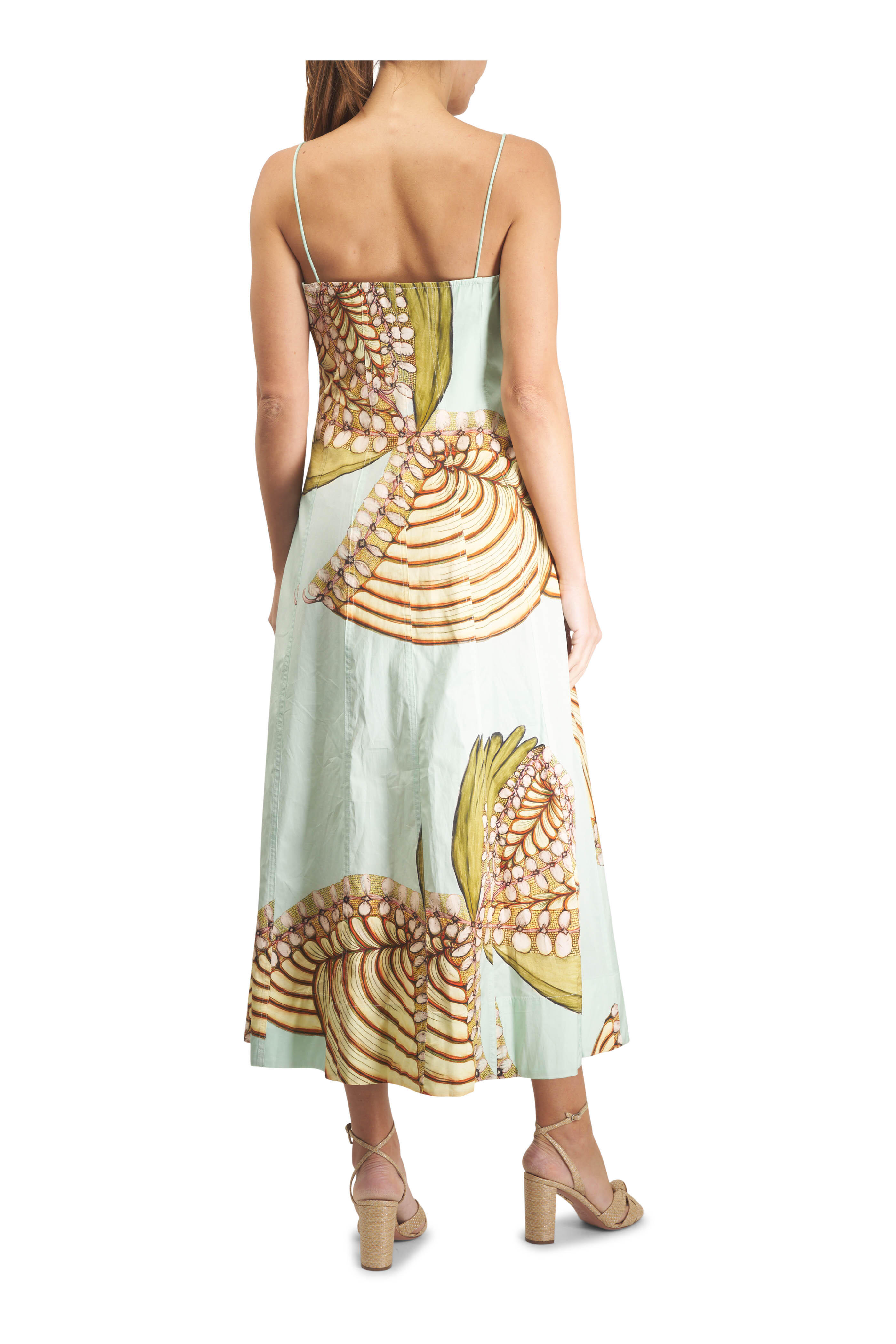Sweetheart neckline. Square back. Sleeveless; thin shoulder straps. Concealed zip closure. Slim through waist. Aline silhouette. Imported. Bust 35.25” (US 4). Waist 28.5” (US 4). Length 52.75” (US 4). Midi length. 100% cotton. Machine washable.