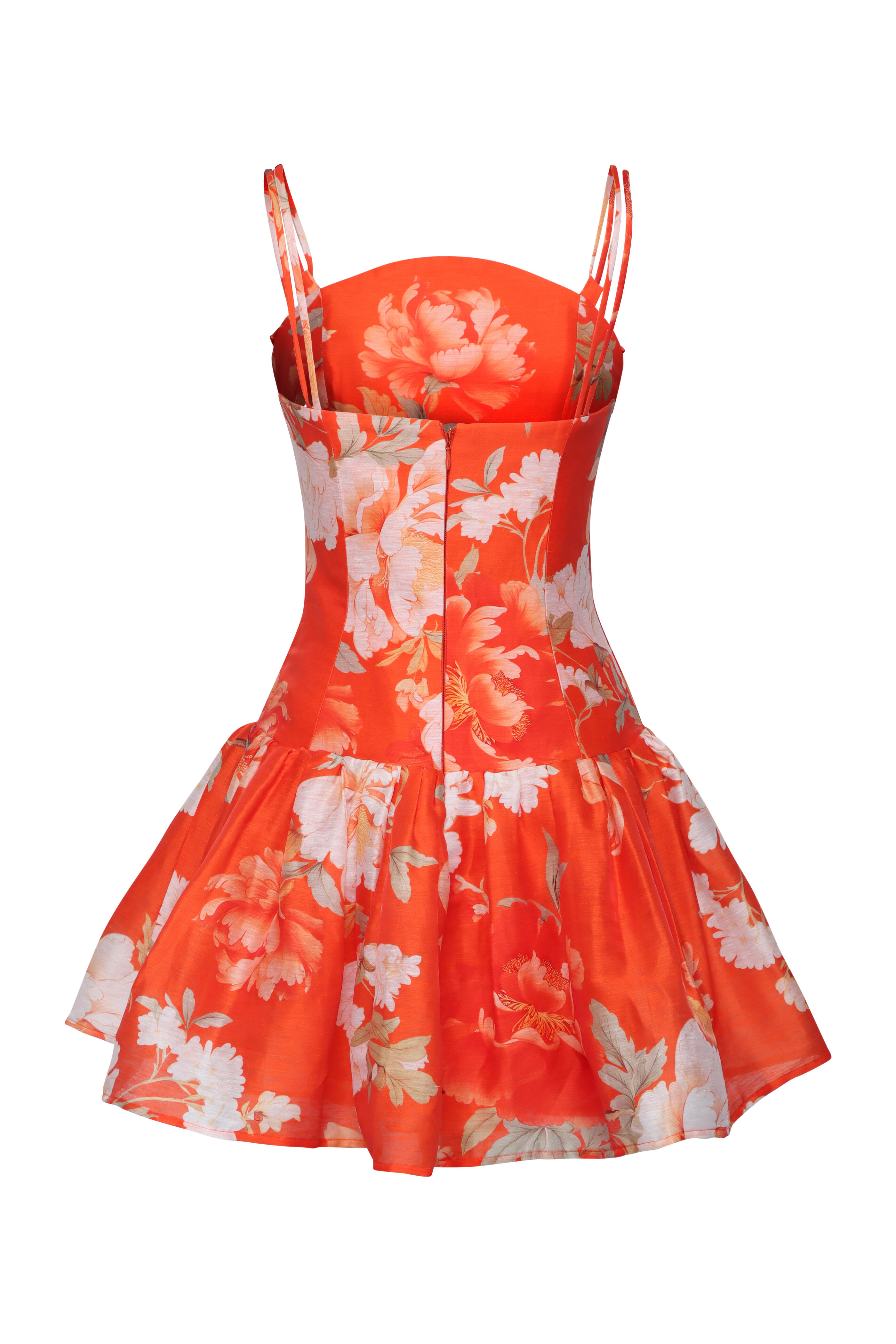 Rounded neckline. Square back. Sleeveless; thin adjustable shoulder straps. Concealed back zip closure. Slim through waist. Drop waist. Aline skirt. Imported. Bust 33.1” (US 4). Waist 28” (US 4). Length 24” (US 4). Mini length. 92% linen, 8% nylon outer, 100% cotton lining. Dry clean.