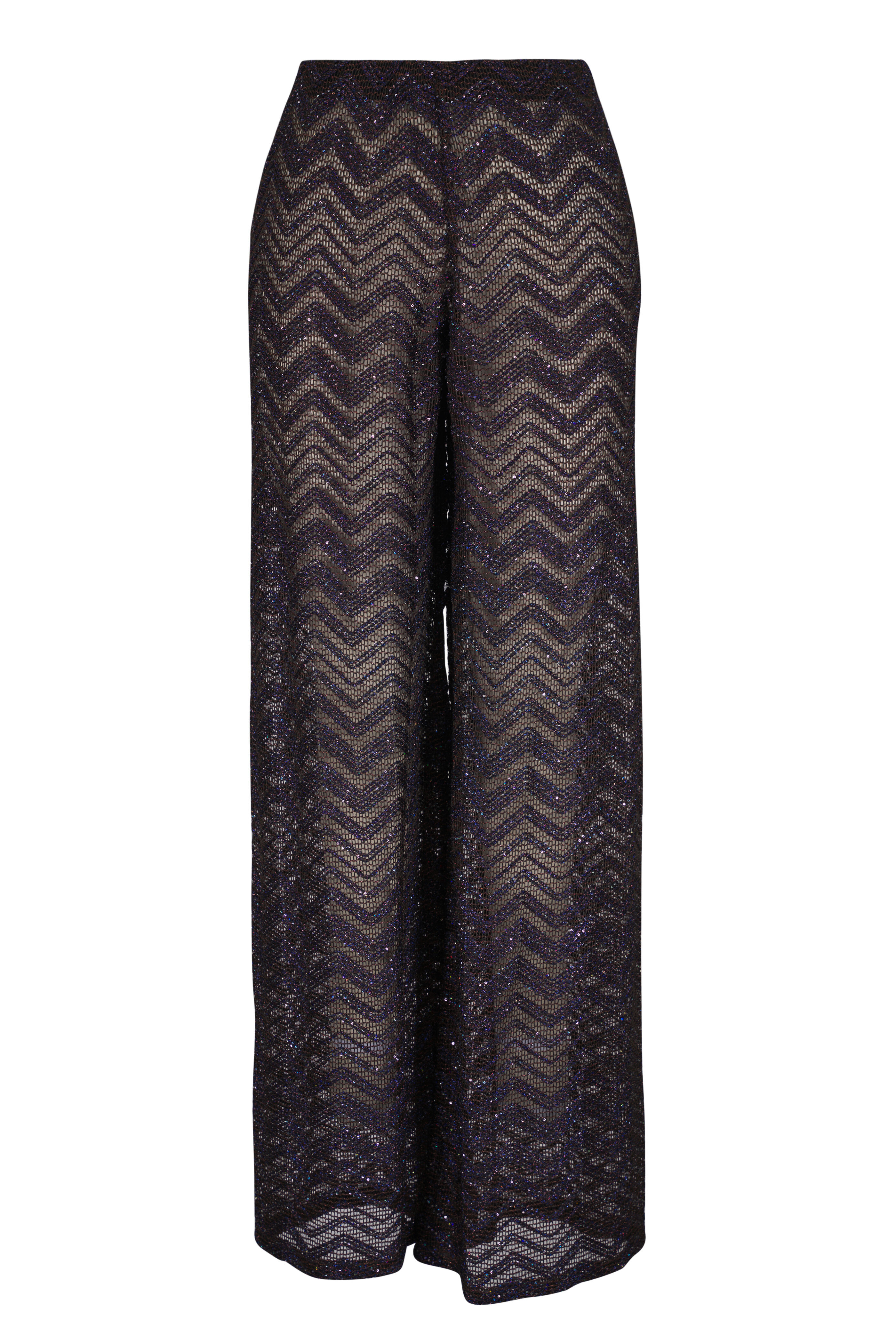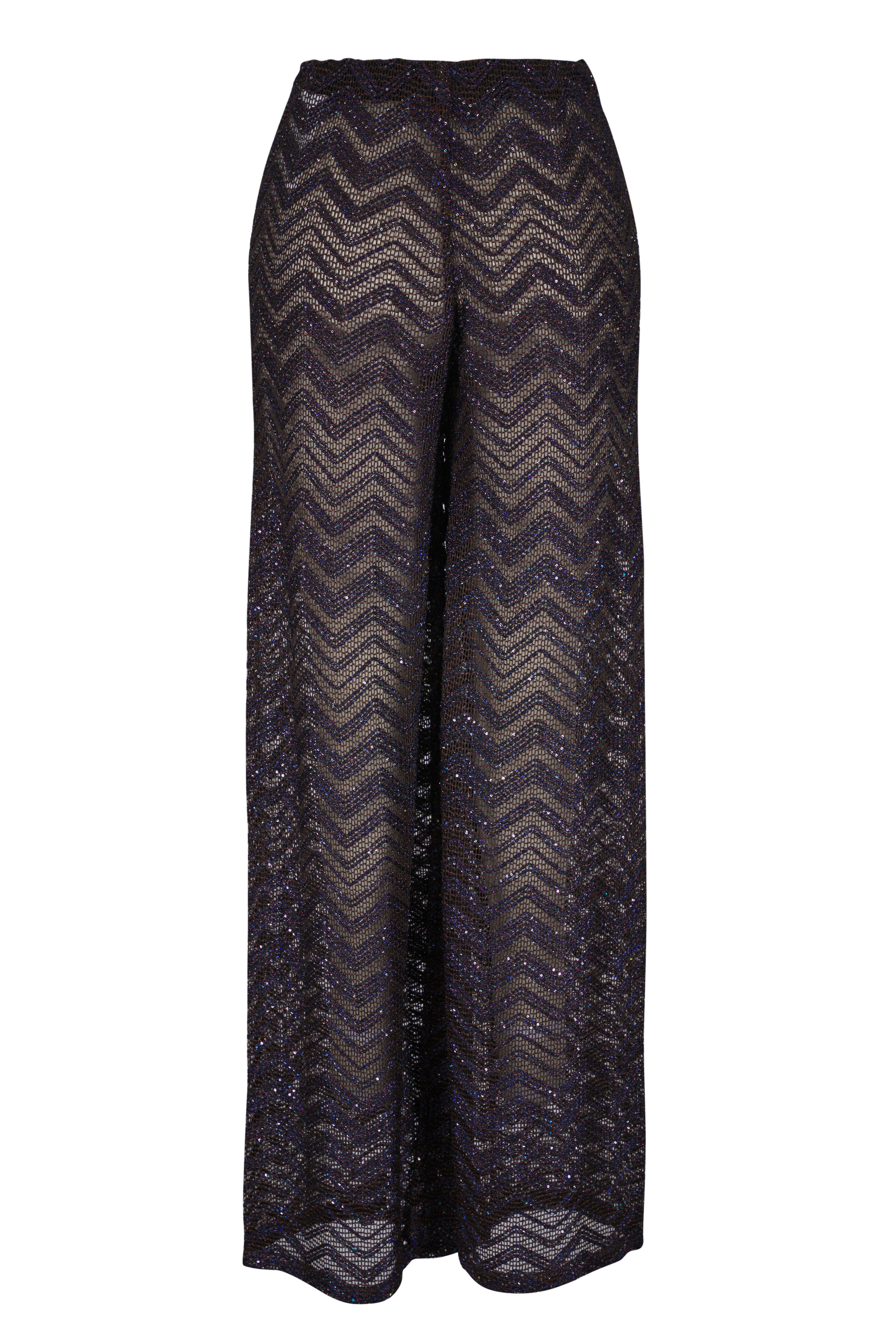 Elasticized waist. Pull-on style. Sequin detailing. Crochet knit fabrication. Made in Italy. High-rise. Wide leg. 76% viscose, 18% polyester, 6% polyamide. Dry clean.