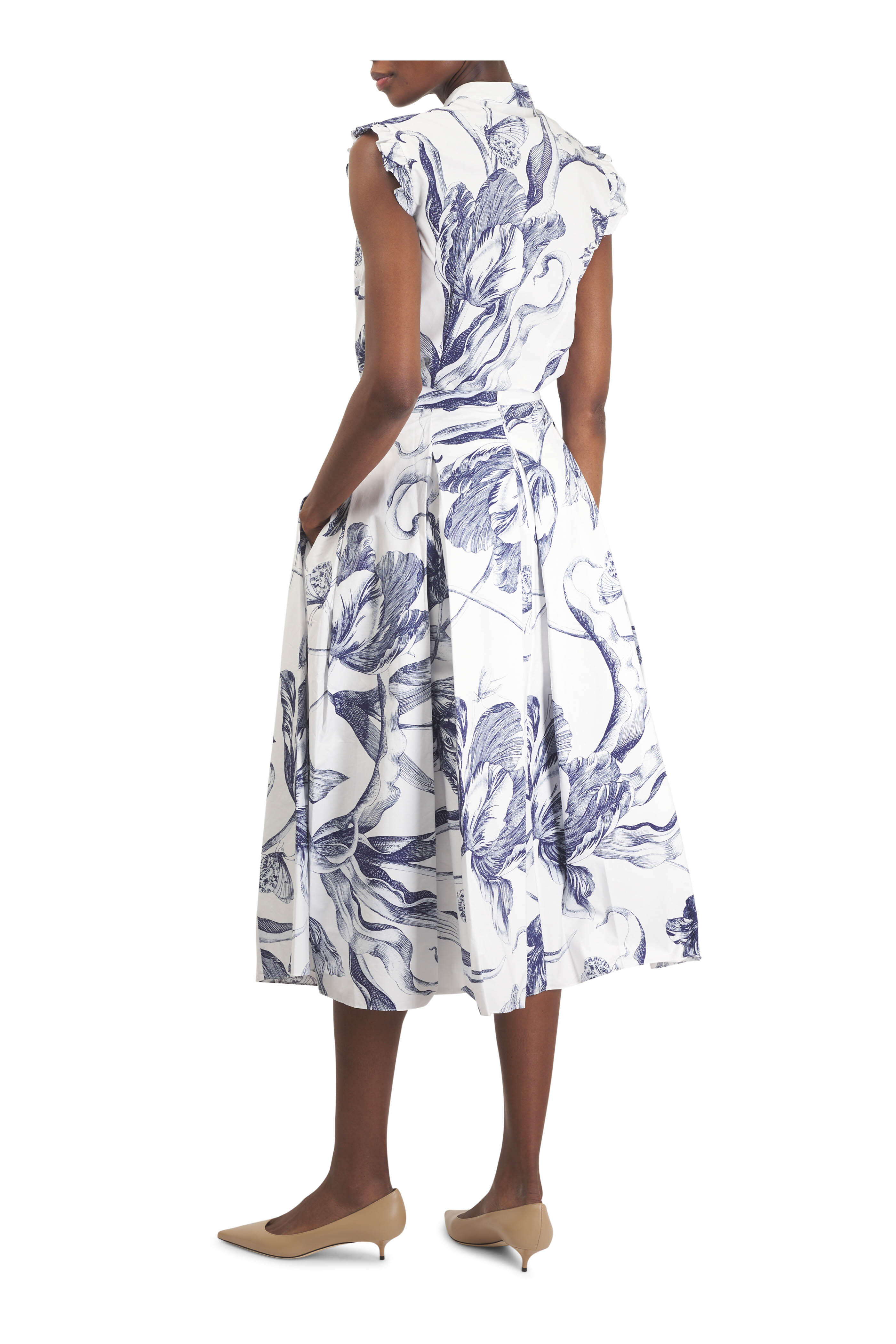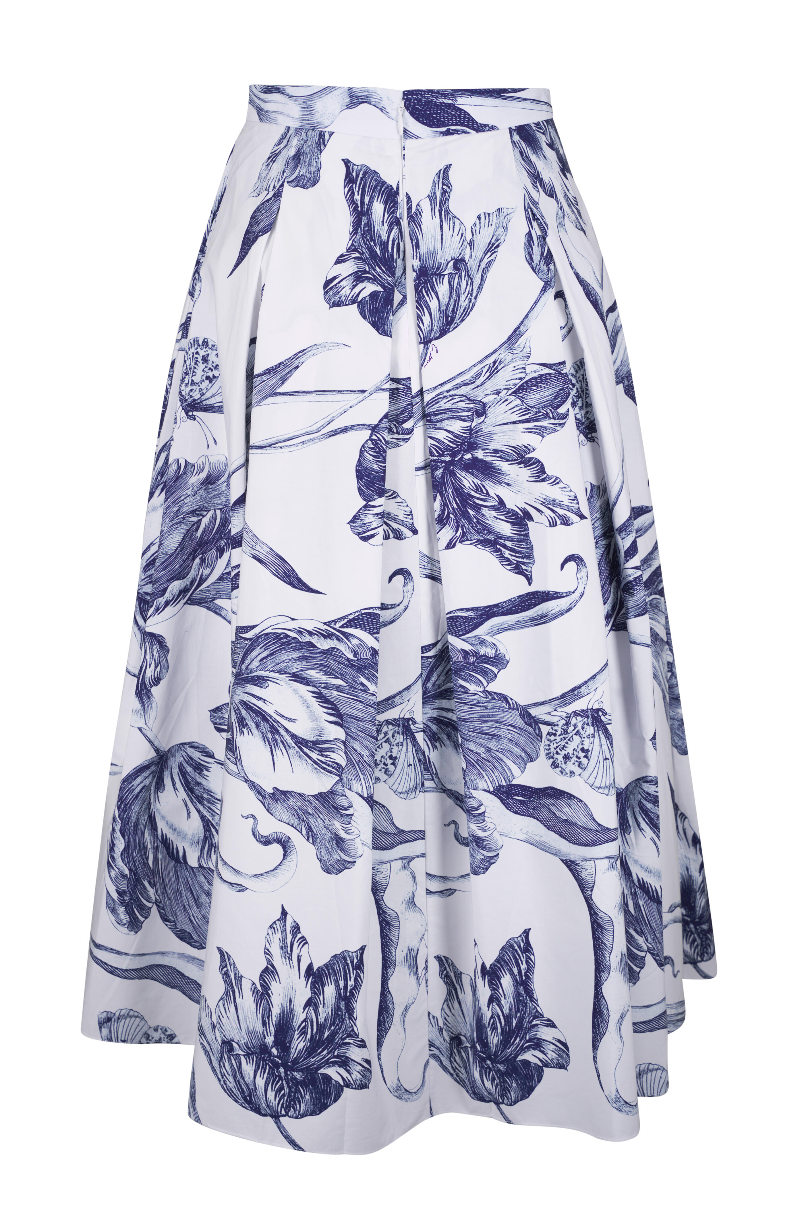 Blue Floral Print Cotton Poplin Pleated Midi Skirt