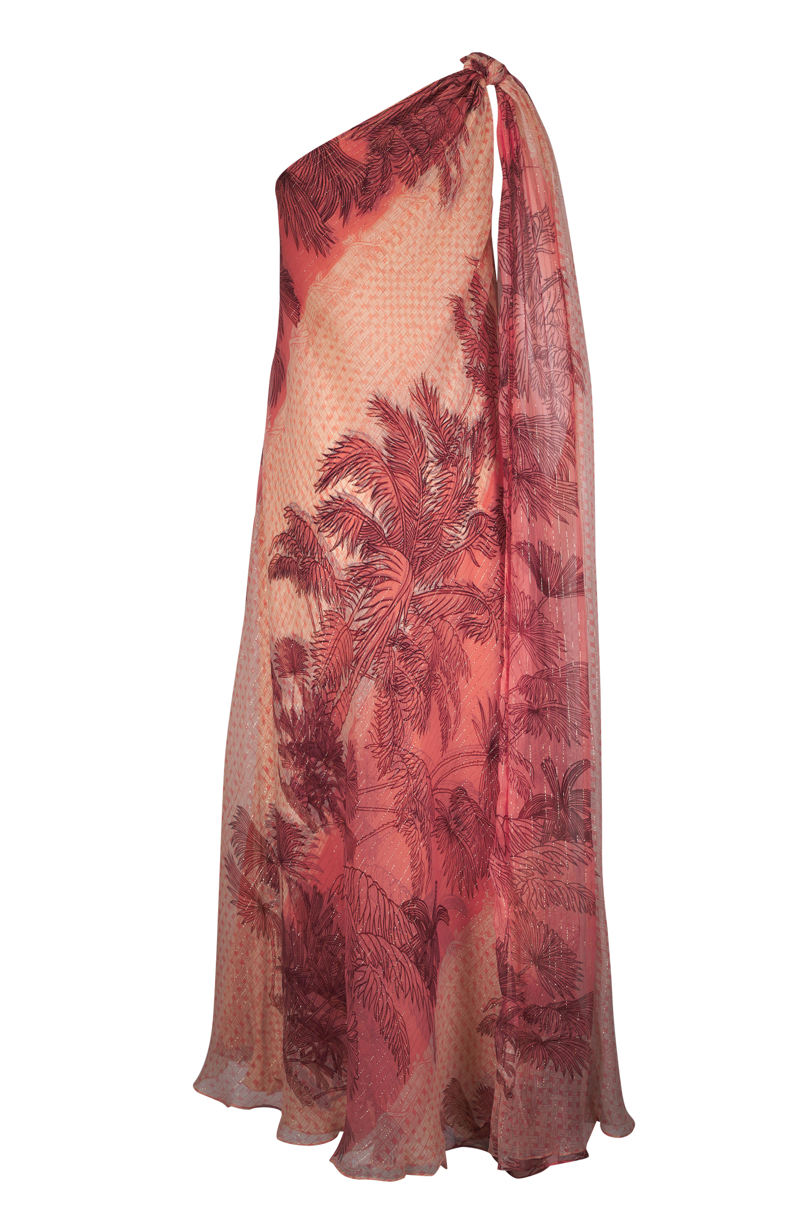 One shoulder neckline. Slip on style. Silk lurex crepe fabrication. Made in Colombia. Length 44.09''. Loose fit. Maxi length. 94% silk, 6% metallic. Dry clean.
